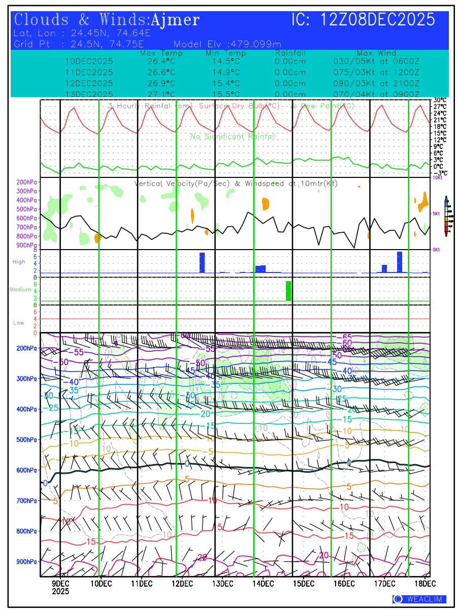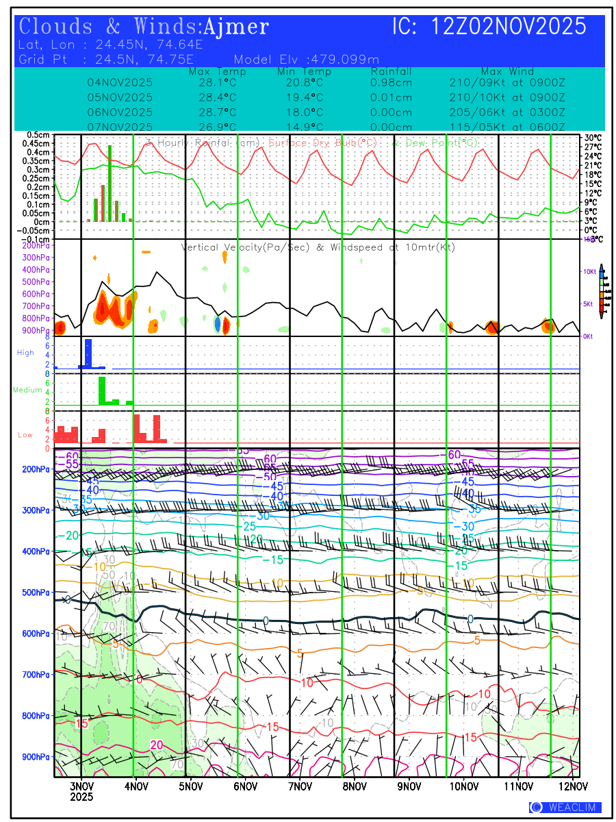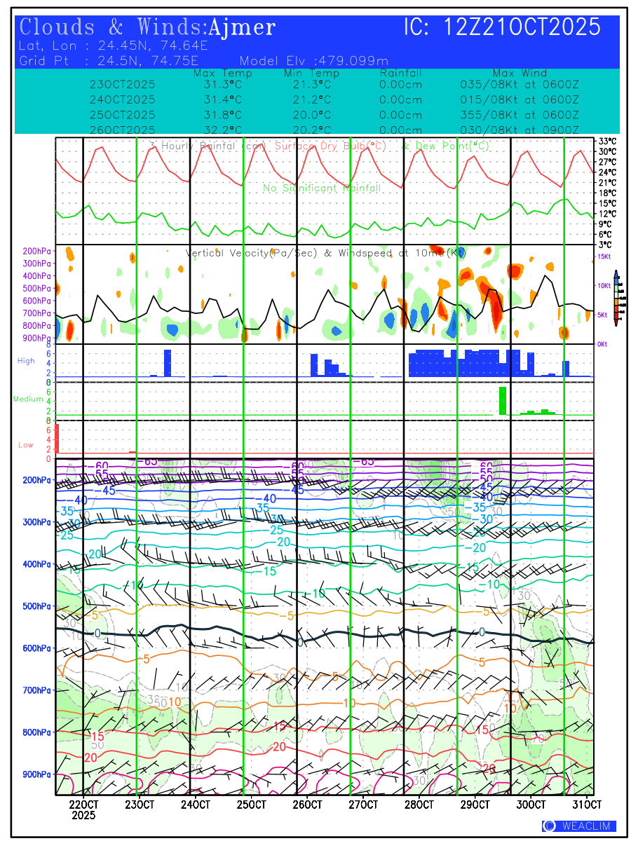 Location Specific Forecasts or Meteograms are graphics that display predicted meteorological data over time for a particular location. They provide a convenient way to quickly visualize and interpret complex weather data, allowing users to make informed decisions based on the latest weather information. These predictions are customised to a time frame with validity of ten days from the date of issue. First Panel at the bottom is the time height representation of the atmospheric profile from surface to 100 hPa level showing the magnitude and direction of winds through wind barbs, isotherm of temperature with freezing level depicted in black and the relative humidity contoured and shaded in green. Second, third and fourth panels show the oktas of low, medium and high clouds in red, green and blue colors, respectively. The fifth panel shows time height representation of Vertical Velocity (ω in Pa/Sec) contoured in shaded colors and the wind speed at 10 meters (kt). Vertical velocity shows the magnitude of verti al winds with negative values showing upward movement (causing formation of convective clouds) and positive values showing downward movement (leading to clear skies) of the airmass at the selected location. The sixth panel shows the Hourly Rainfall (in cm) along with Surface Dry Bulb and Dew Point Temperatures ( o C) over the time period of next ten days. The seventh panel shows the values of predicted Maximum and Minimum Temperature ( o C), Rainfall amount (in cm) and time of Maximum Winds (kt) expected during the next three days.The eighth panel at the top gives the general information on name of the selected location, time of initial conditions (in UTC), latitude and longitude of the location and its model elevation.