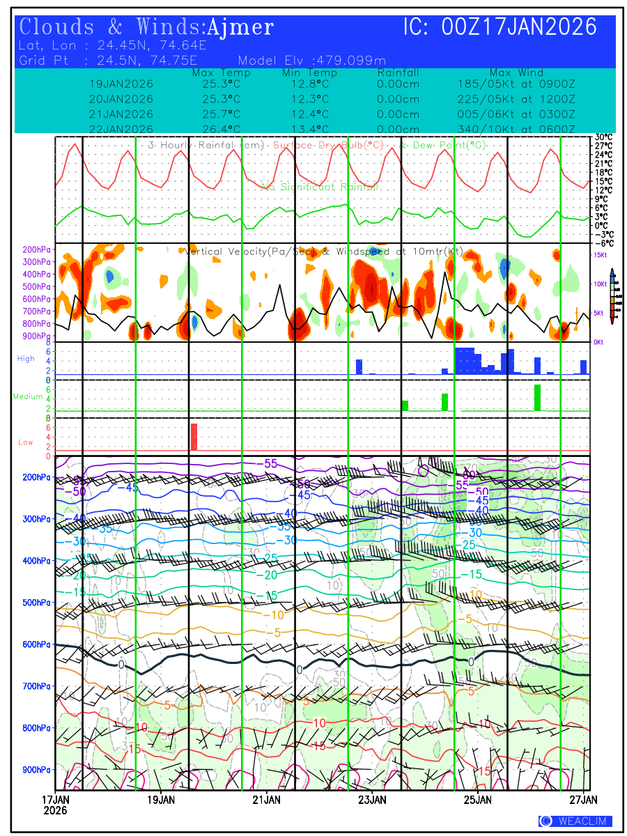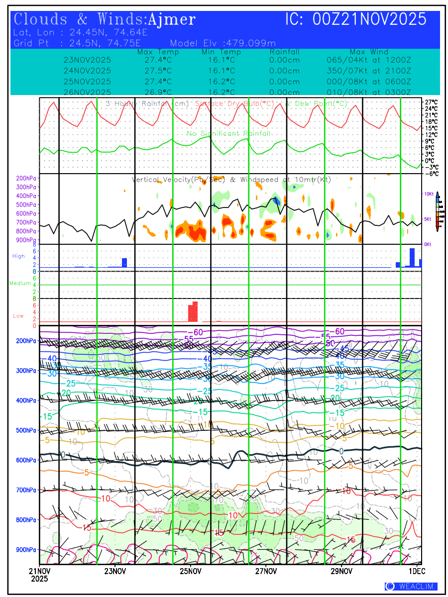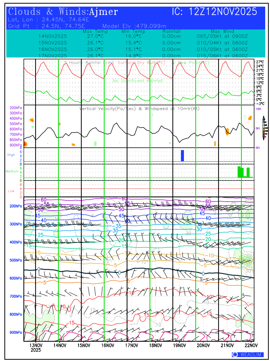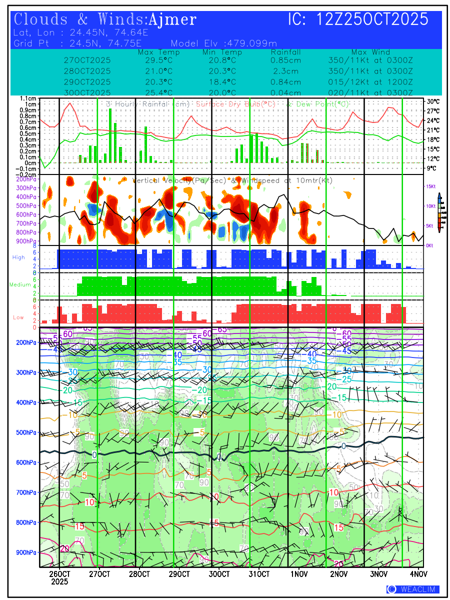 Location Specific Forecasts or Meteograms are graphics that display predicted meteorological data over time for a particular location. They provide a convenient way to quickly visualize and interpret complex weather data, allowing users to make informed decisions based on the latest weather information. These predictions are customised to a time frame with validity of ten days from the date of issue. First Panel at the bottom is the time height representation of the atmospheric profile from surface to 100 hPa level showing the magnitude and direction of winds through wind barbs, isotherm of temperature with freezing level depicted in black and the relative humidity contoured and shaded in green. Second, third and fourth panels show the oktas of low, medium and high clouds in red, green and blue colors, respectively. The fifth panel shows time height representation of Vertical Velocity (ω in Pa/Sec) contoured in shaded colors and the wind speed at 10 meters (kt). Vertical velocity shows the magnitude of verti al winds with negative values showing upward movement (causing formation of convective clouds) and positive values showing downward movement (leading to clear skies) of the airmass at the selected location. The sixth panel shows the Hourly Rainfall (in cm) along with Surface Dry Bulb and Dew Point Temperatures ( o C) over the time period of next ten days. The seventh panel shows the values of predicted Maximum and Minimum Temperature ( o C), Rainfall amount (in cm) and time of Maximum Winds (kt) expected during the next three days.The eighth panel at the top gives the general information on name of the selected location, time of initial conditions (in UTC), latitude and longitude of the location and its model elevation.