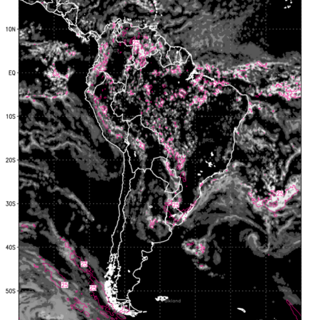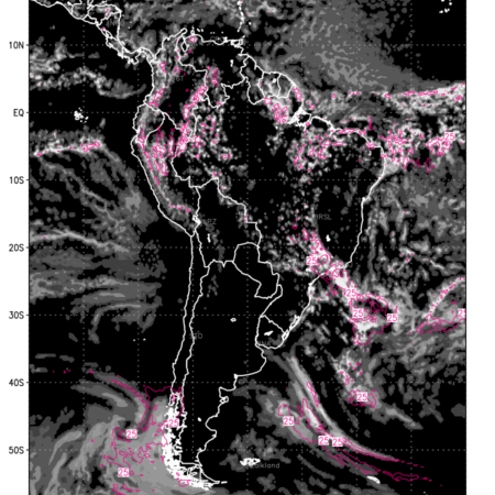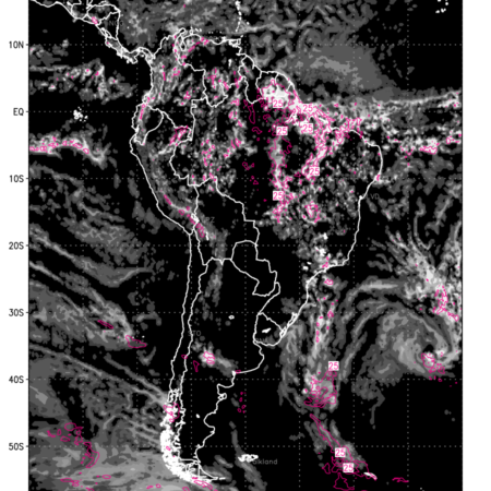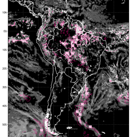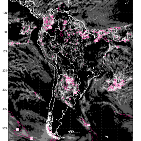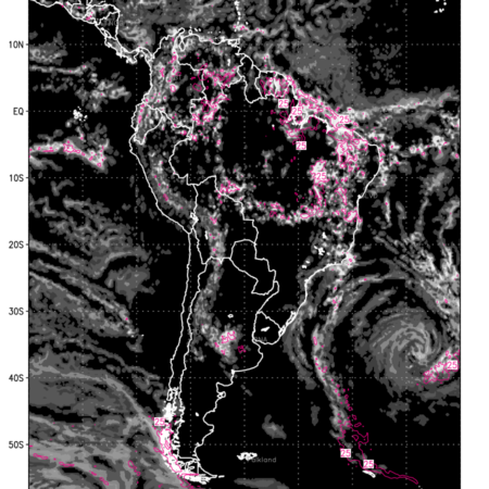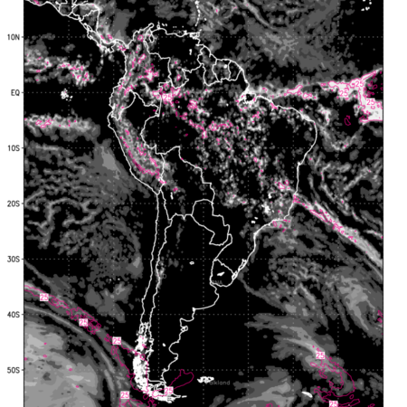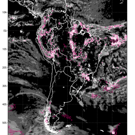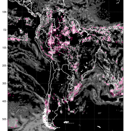 Convective clouds are formed by the vertical movement of air in the atmosphere and are associated with thunderstorms and other types of severe weather like intense rainfall, strong gusty winds etc. Shades from black to white on scale of 0 to 1 with whiter shade depicting more intensity of convection has been used in the depiction. Also shown is the Composite Reflectivity that takes the maximum reflectivity from each elevation angle of the Doppler Weather Radar and meshes it into one image. Advantage of this type of image is the ability to quickly assess the intensity of storms. Predicted pattern of Total Convective Clouds and percentage of the sky covered by them is shown here along with Composite Reflectivity over the South American Region for the next ten days.