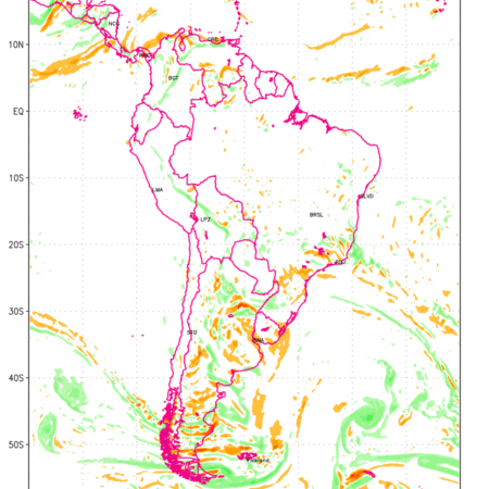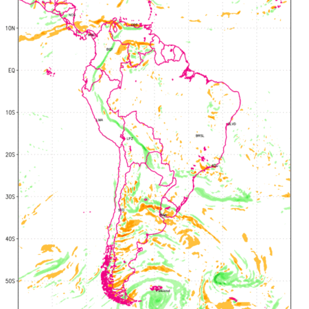Low Level Convergence at the 24th hour for South America is the graphical representation of the expected magnitude and pattern of horizontal rotation (or the vorticity) of atmosphere around a vertical axis or the vorticity at 850 hPa (1.5km). In northern hemisphere it is typically displayed with warm colors ranging from shades of red (to yellow) indicating positive vorticity (cyclonic rotation), and cool colors shades of green (to blue) indicating negative vorticity (anticyclonic rotation). They are useful tools for identifying areas of high and low vorticity, associated with weather systems such as fronts, lows, and highs etc.