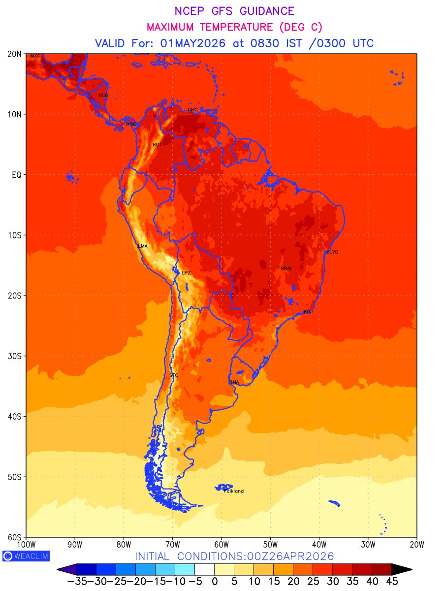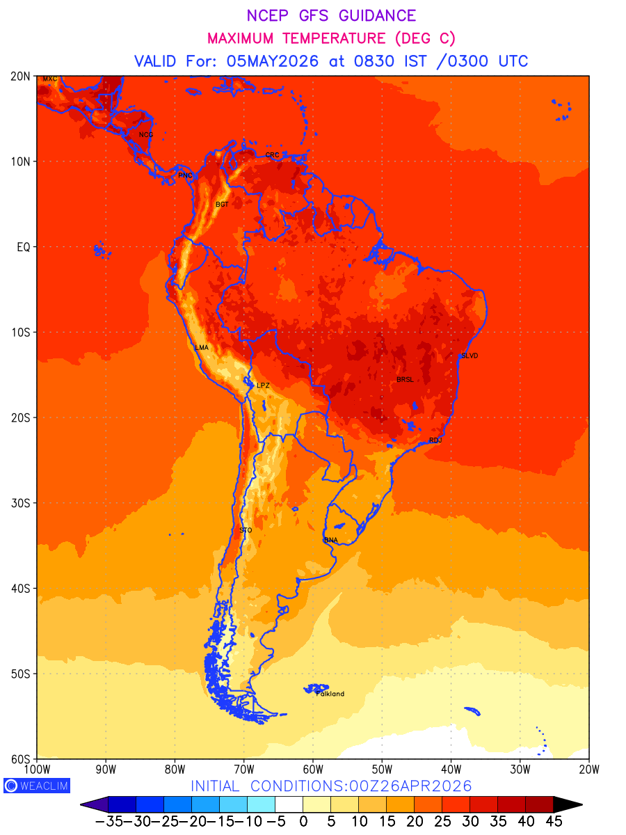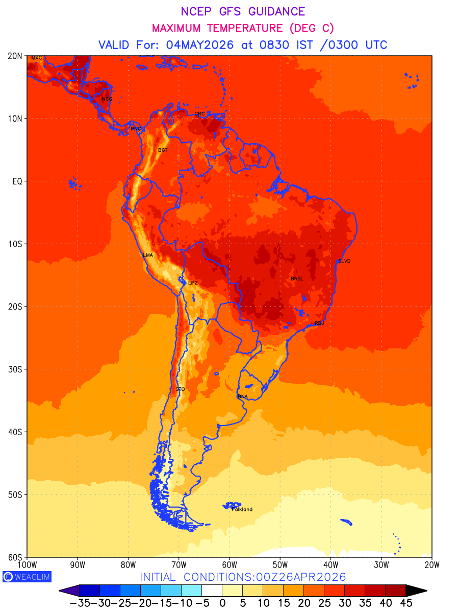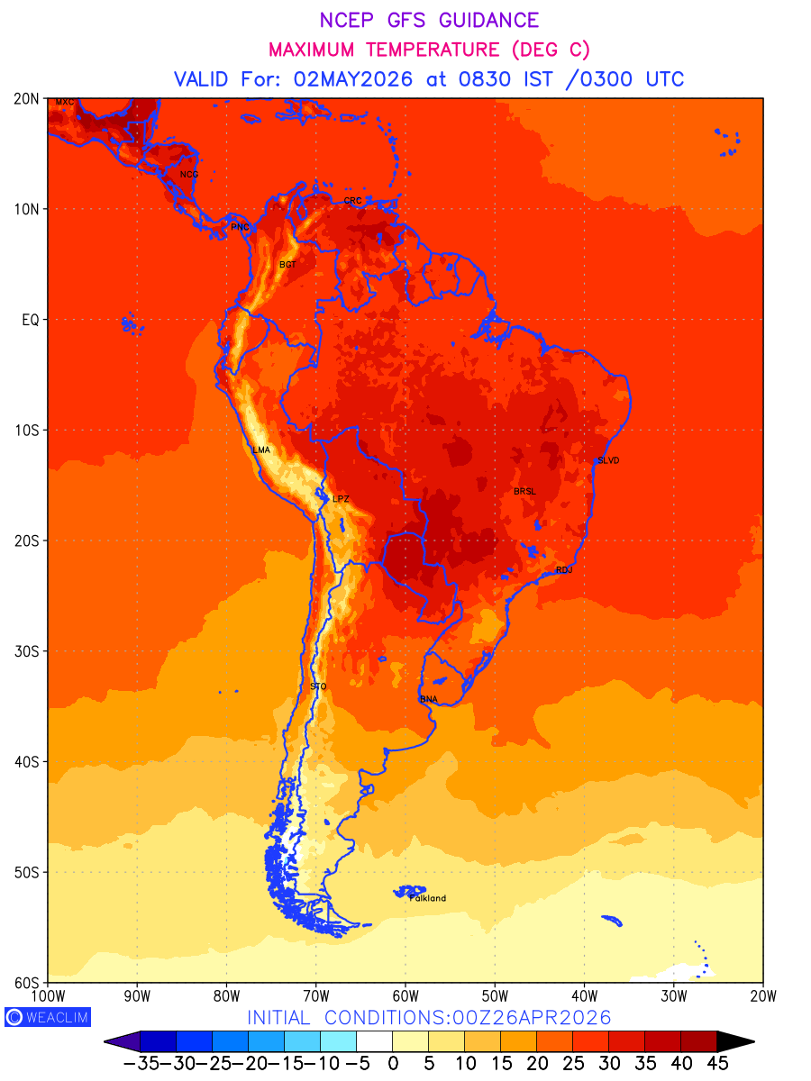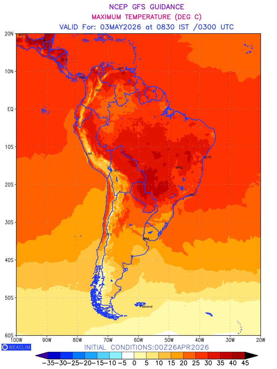 Maximum Temperature for South America countries depicts the highest temperatures at 2m above the ground surface between 0300 UTC of the previous date to 0300 UTC of the required date. This is an important variable for weather forecasting, as it determines the conditions at the Earth’s surface during the warmest part of the date, affecting human activities, agriculture, and the environment. 2m Temperature data can be used for a variety of applications, such as predicting the onset of heatwaves or cold spells, forecasting temperature trends, and studying the impact of weather on various systems and processes.