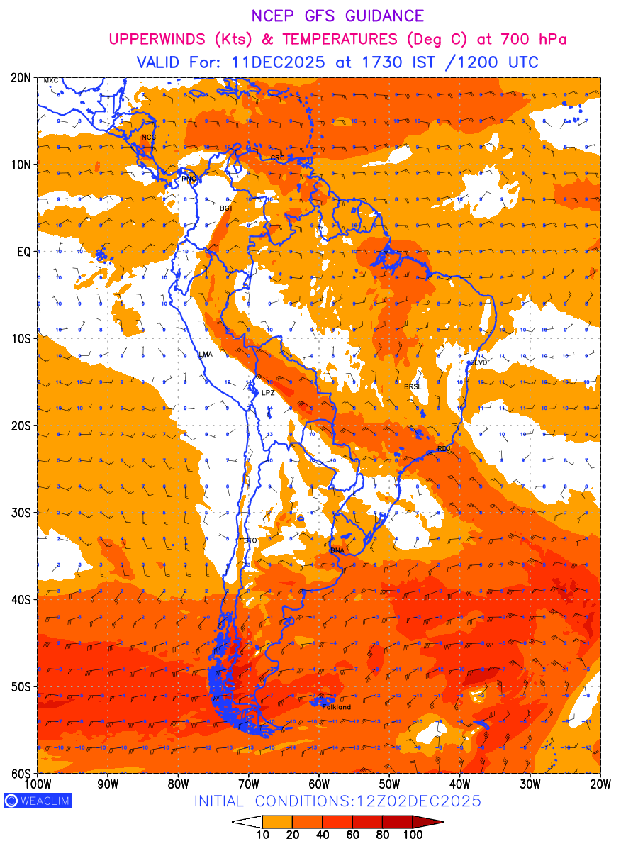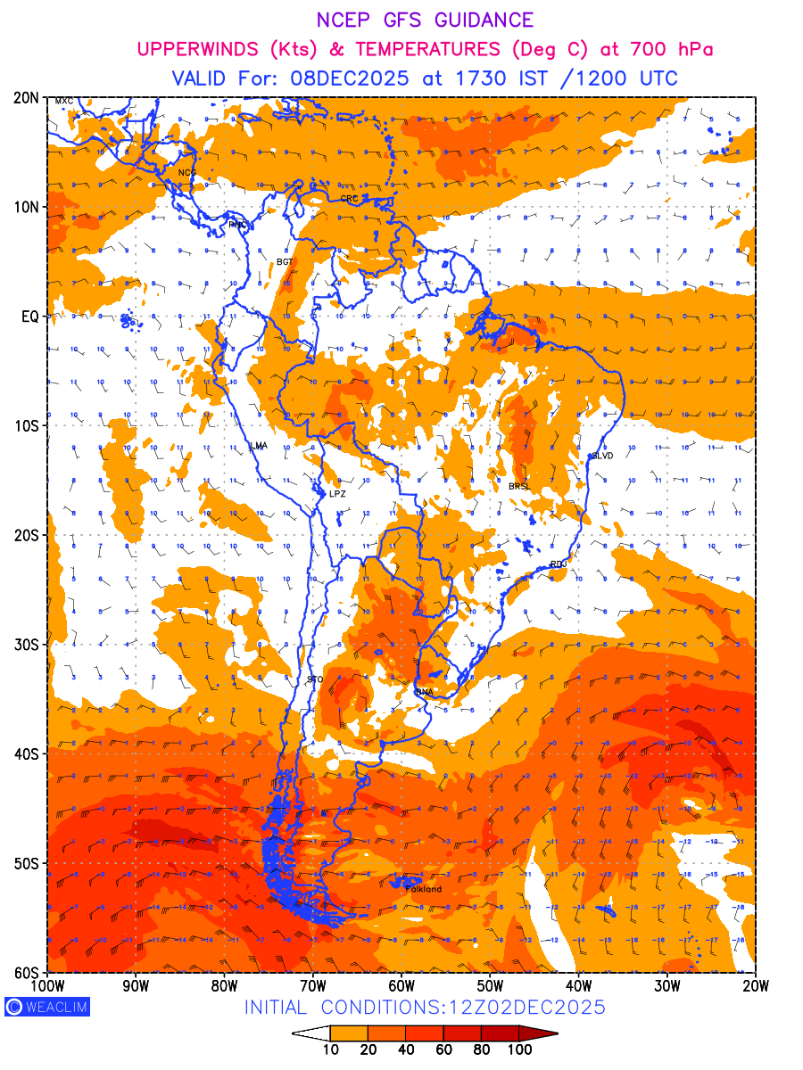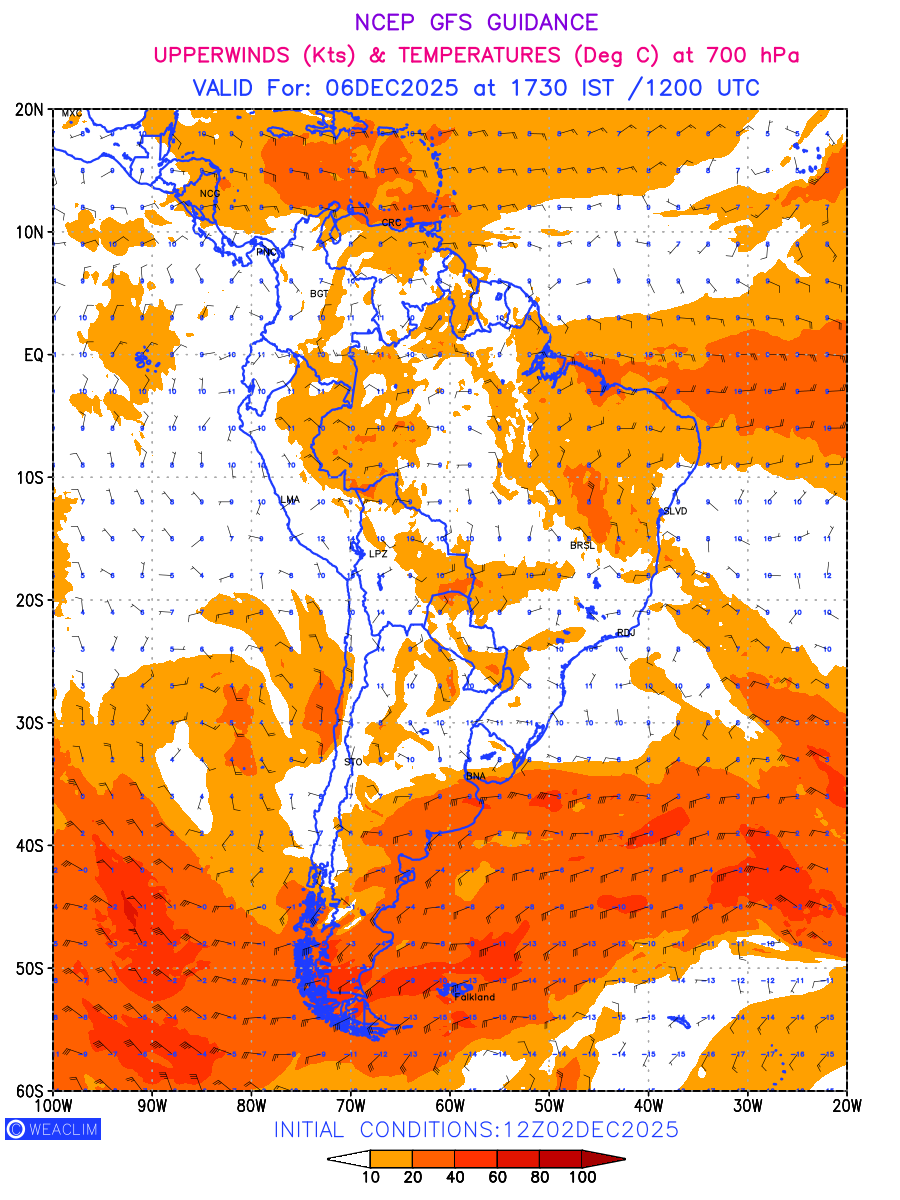 Winds at 700 hPa at the 24th hour for South America refers to the predicted wind direction and speed at a pressure level of 700 hPa, which is located in the middle troposphere (approximately 3,000 meters or 10,000 feet above the Earths surface). The winds are presented in knots (kt), and the direction is given in degrees from true north.Winds with magnitude of more than 20 kt are marked in shades of red. At this level, the wind speed and direction can influence the movement and development of weather systems such as storms, fronts, and high-pressure systems. Along with the wind speed (kt) and direction, upper air temperatures (Deg C) are also shown at the grid points over the South American Region at 700 hPa level for the next ten days.