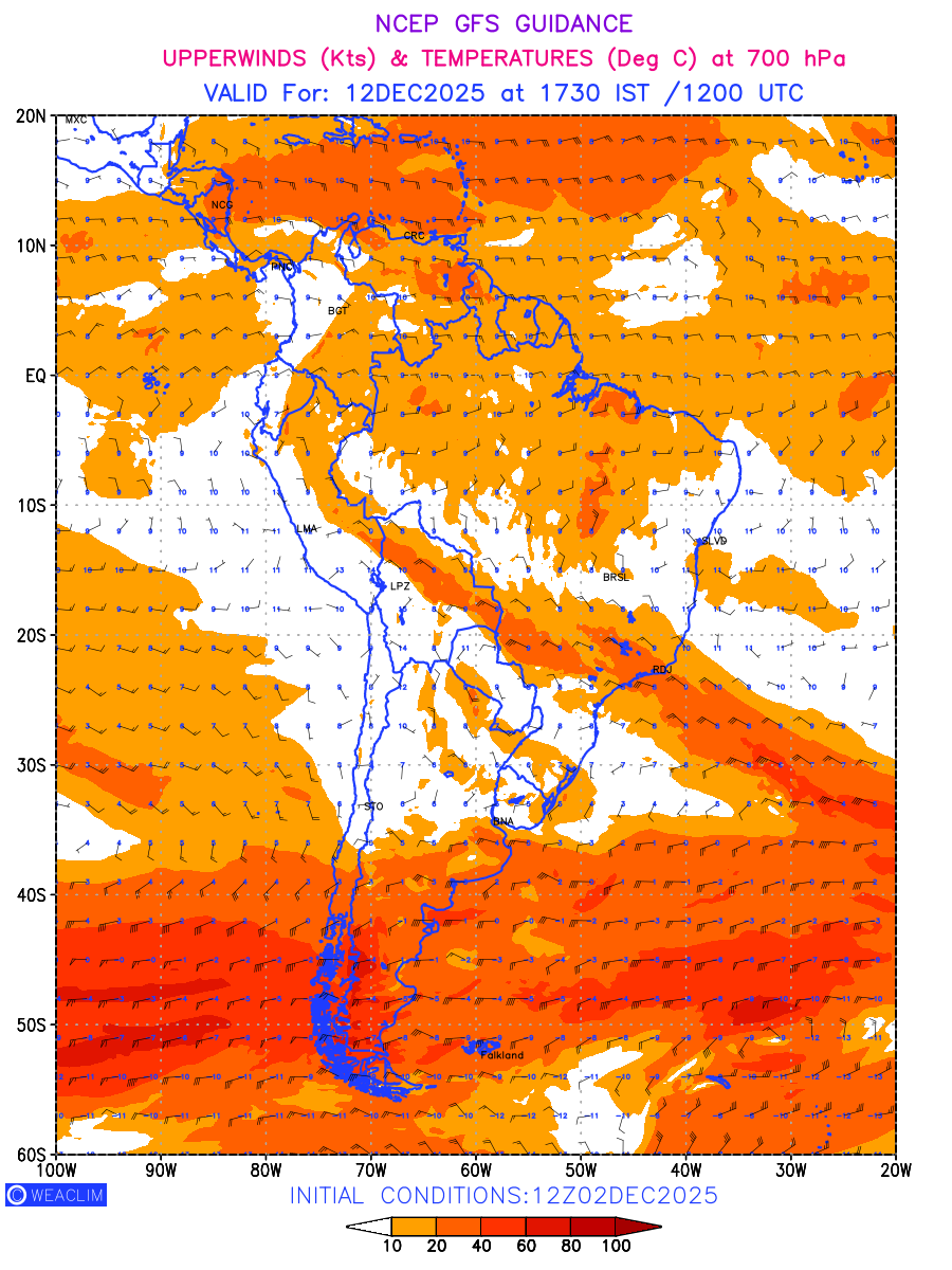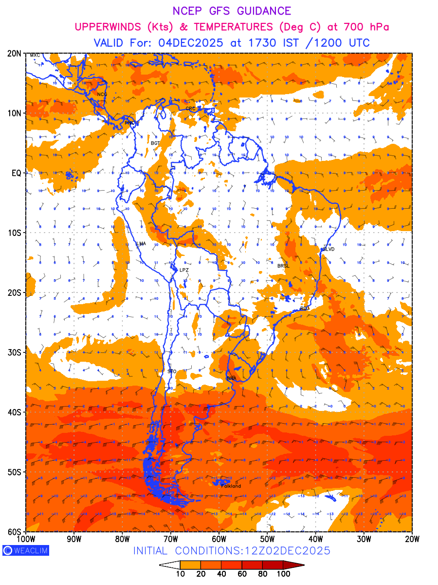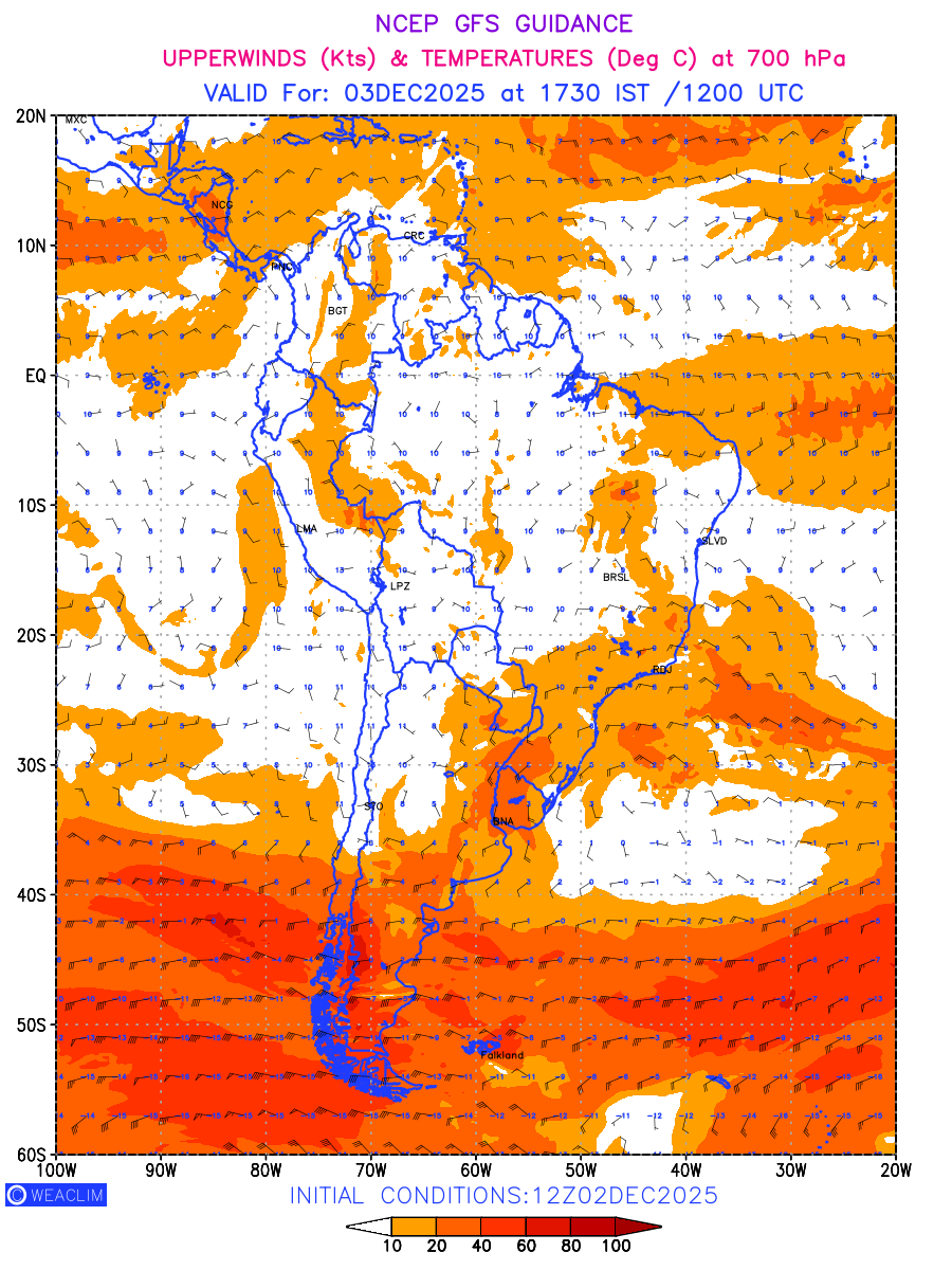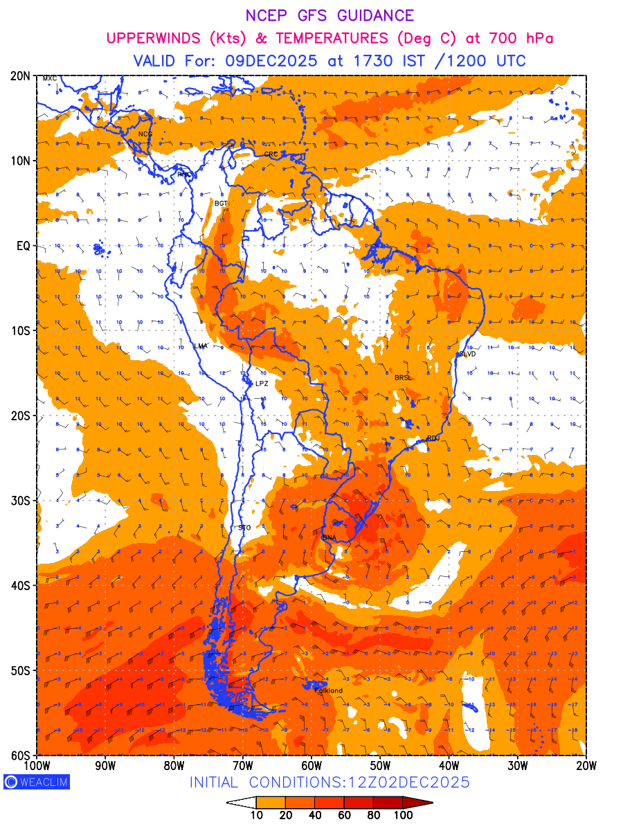 Winds at 700 hPa at the 24th hour for South America refers to the predicted wind direction and speed at a pressure level of 700 hPa, which is located in the middle troposphere (approximately 3,000 meters or 10,000 feet above the Earths surface). The winds are presented in knots (kt), and the direction is given in degrees from true north.Winds with magnitude of more than 20 kt are marked in shades of red. At this level, the wind speed and direction can influence the movement and development of weather systems such as storms, fronts, and high-pressure systems. Along with the wind speed (kt) and direction, upper air temperatures (Deg C) are also shown at the grid points over the South American Region at 700 hPa level for the next ten days.