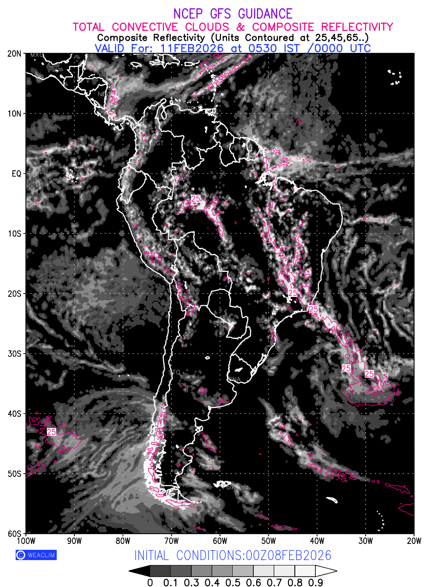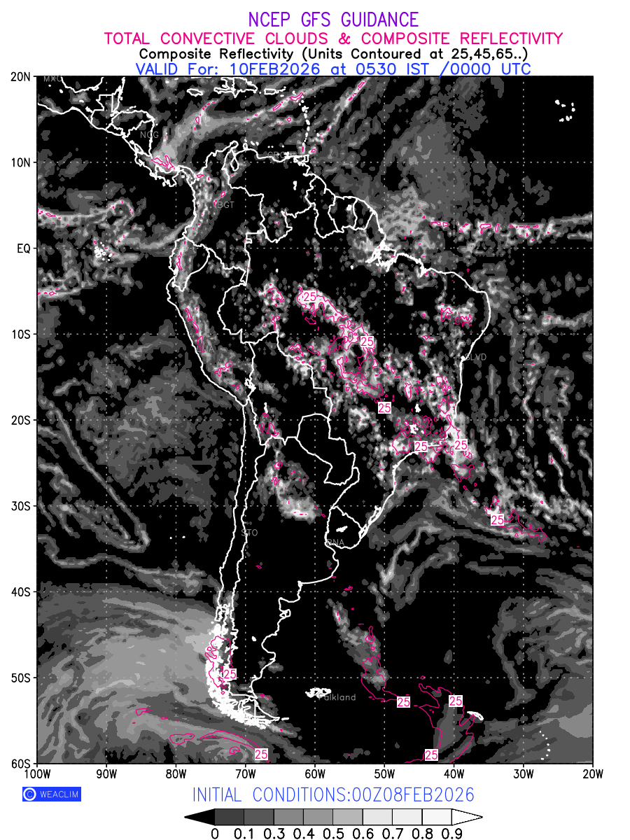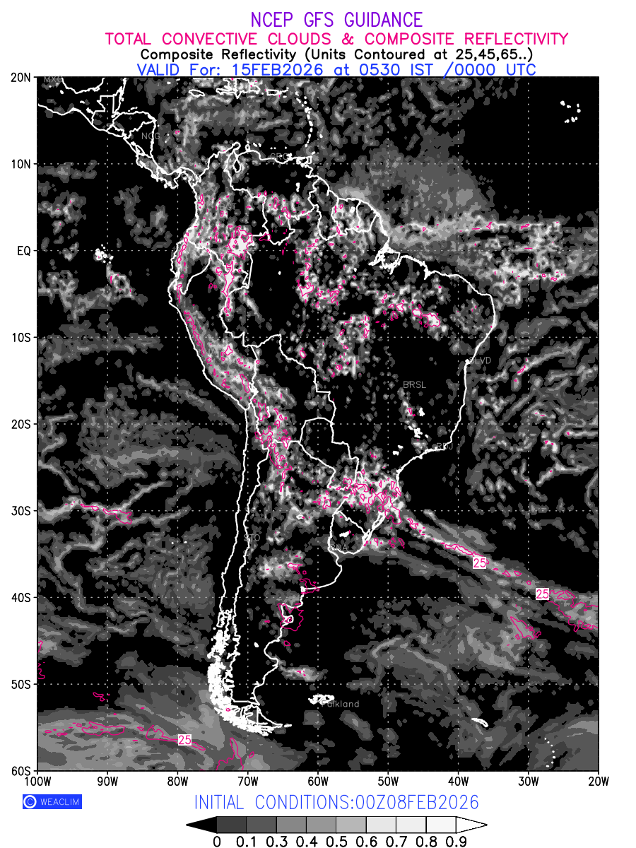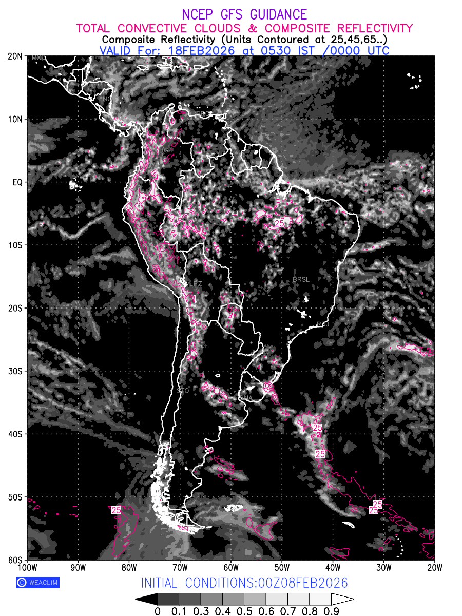 Convective clouds are formed by the vertical movement of air in the atmosphere and are associated with thunderstorms and other types of severe weather like intense rainfall, strong gusty winds etc. Shades from black to white on scale of 0 to 1 with whiter shade depicting more intensity of convection has been used in the depiction. Also shown is the Composite Reflectivity that takes the maximum reflectivity from each elevation angle of the Doppler Weather Radar and meshes it into one image. Advantage of this type of image is the ability to quickly assess the intensity of storms. Predicted pattern of Total Convective Clouds and percentage of the sky covered by them is shown here along with Composite Reflectivity over the South American Region for the next ten days.