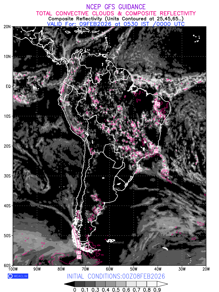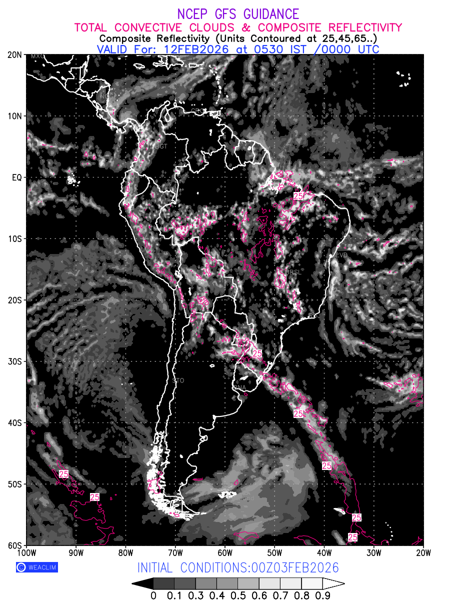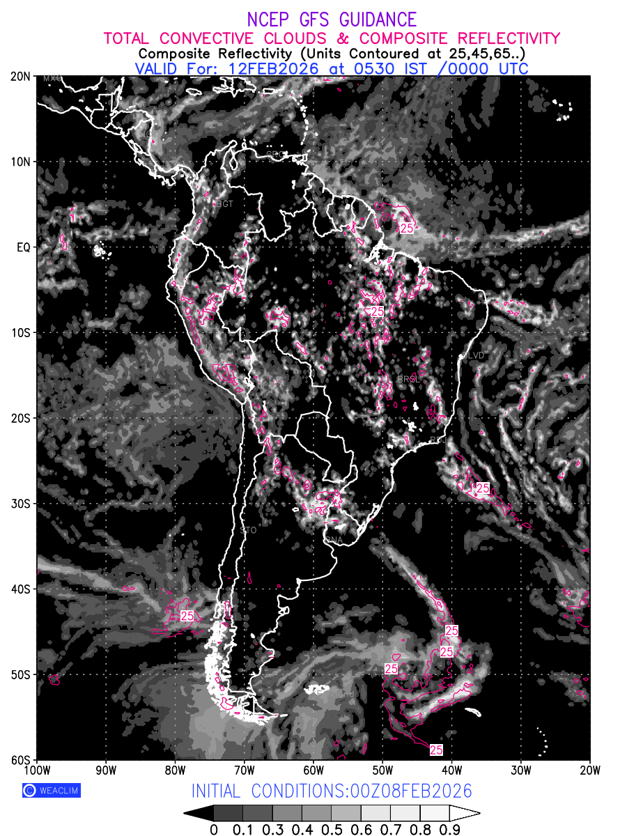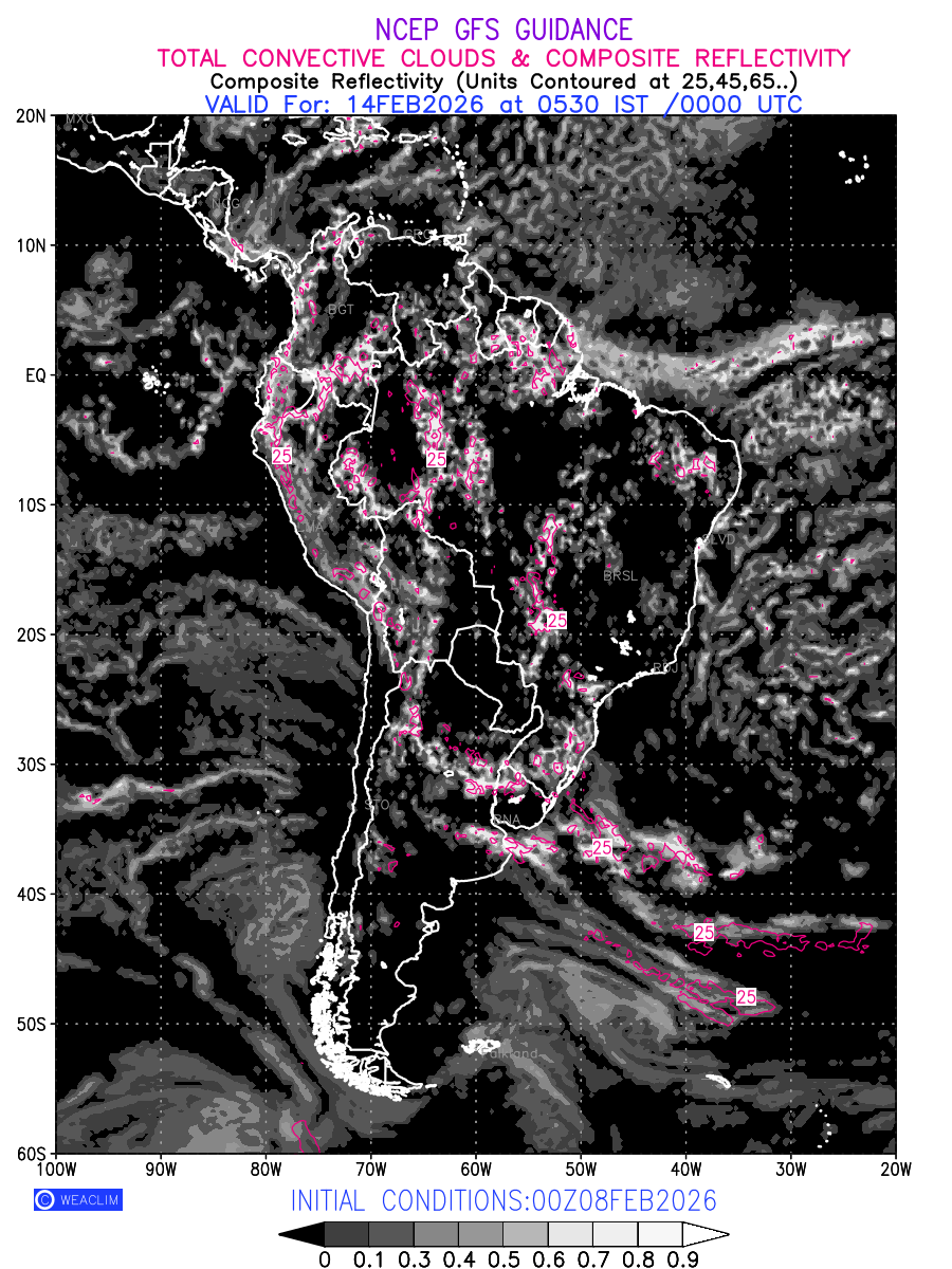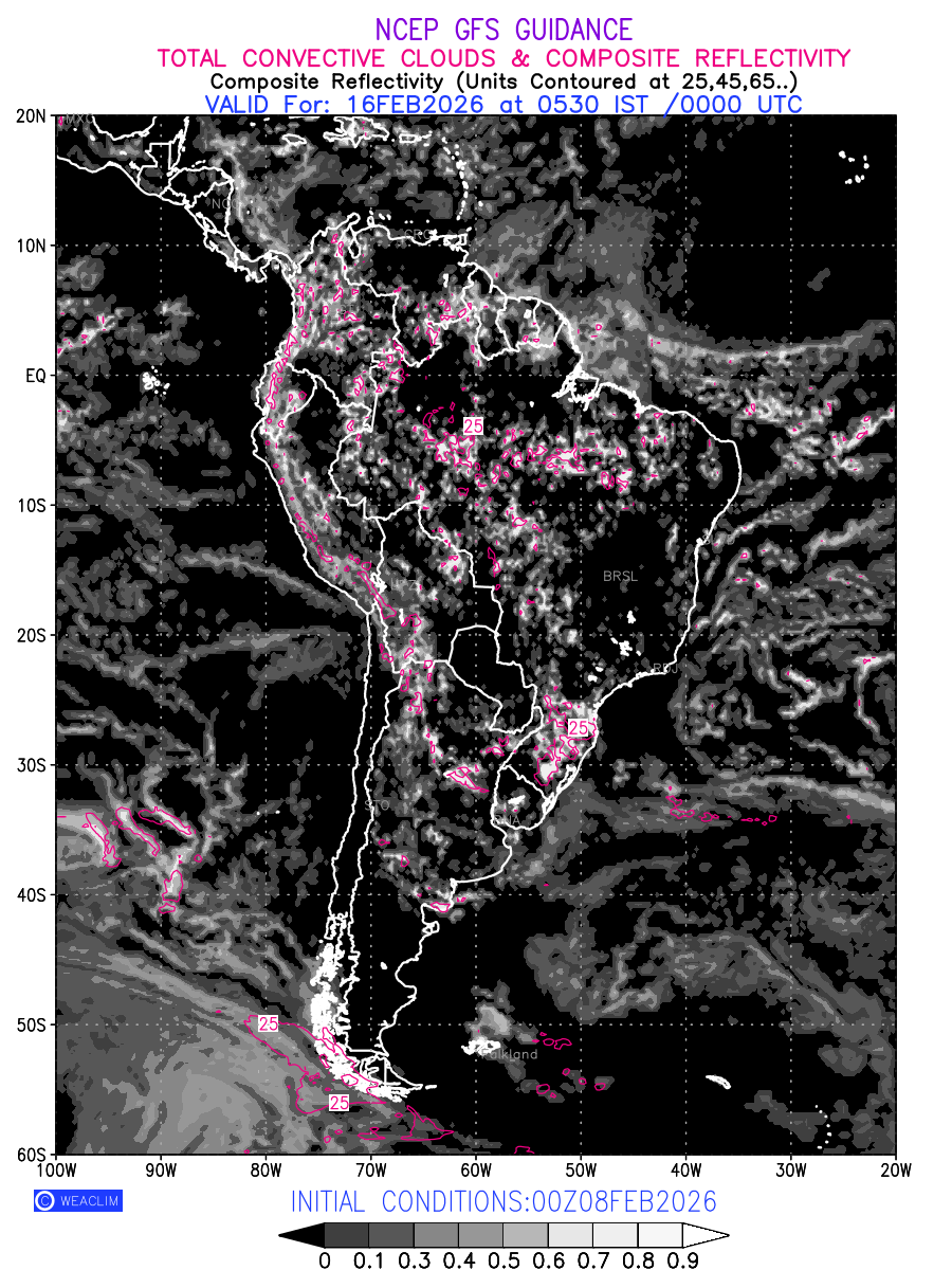 Convective clouds are formed by the vertical movement of air in the atmosphere and are associated with thunderstorms and other types of severe weather like intense rainfall, strong gusty winds etc. Shades from black to white on scale of 0 to 1 with whiter shade depicting more intensity of convection has been used in the depiction. Also shown is the Composite Reflectivity that takes the maximum reflectivity from each elevation angle of the Doppler Weather Radar and meshes it into one image. Advantage of this type of image is the ability to quickly assess the intensity of storms. Predicted pattern of Total Convective Clouds and percentage of the sky covered by them is shown here along with Composite Reflectivity over the South American Region for the next ten days.
