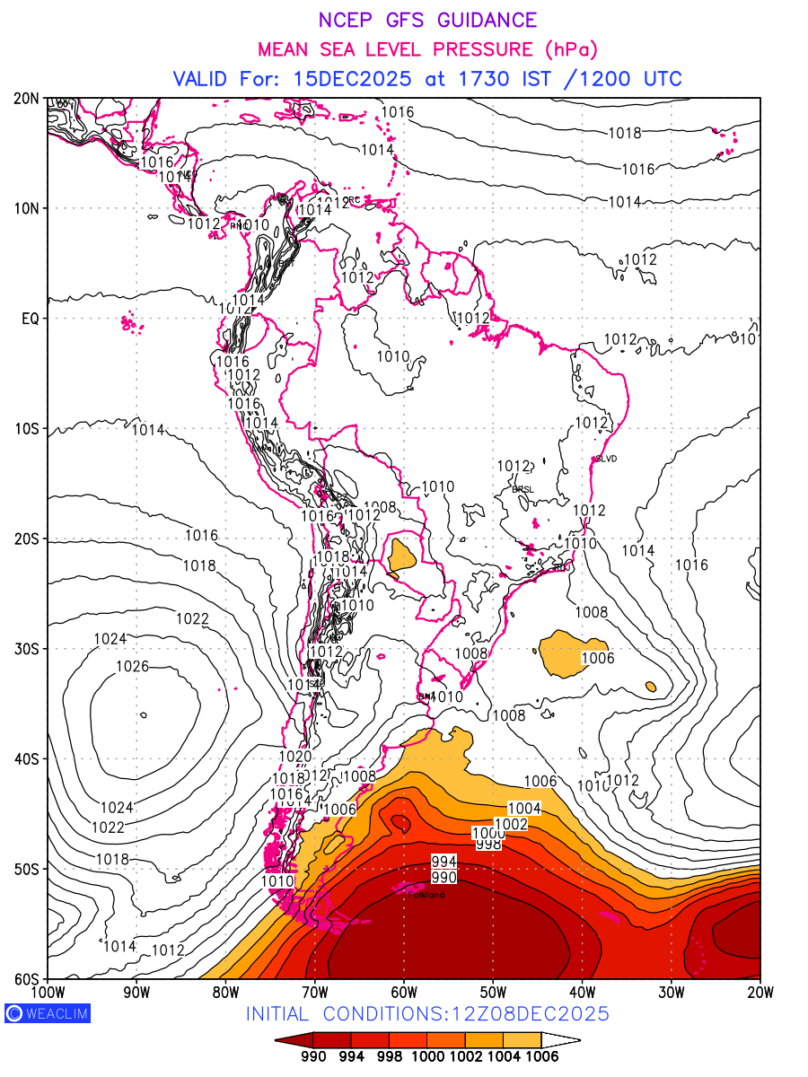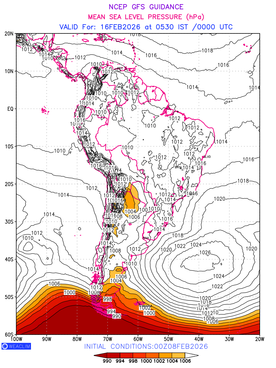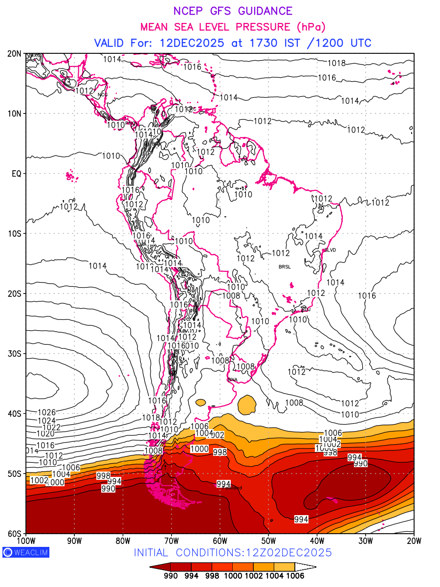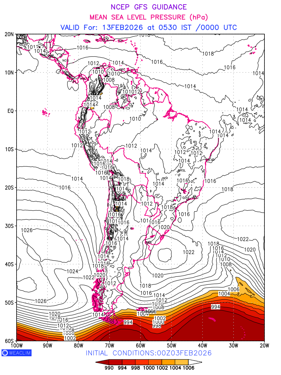 Mean Sea Level Pressure (MSLP) charts at the 24th hour for South America typically show a color-coded contour map of atmospheric pressure at sea level, with lines of equal pressure (isobars) indicating areas of high and low pressure over a geographic area. Meteorologists use these charts to identify areas of high and low pressure, which can give indications of storms, cold fronts, or warm fronts. The MSLP charts are also useful in identifying areas of convergence and divergence in the atmosphere, which can influence the formation or decay of weather systems.