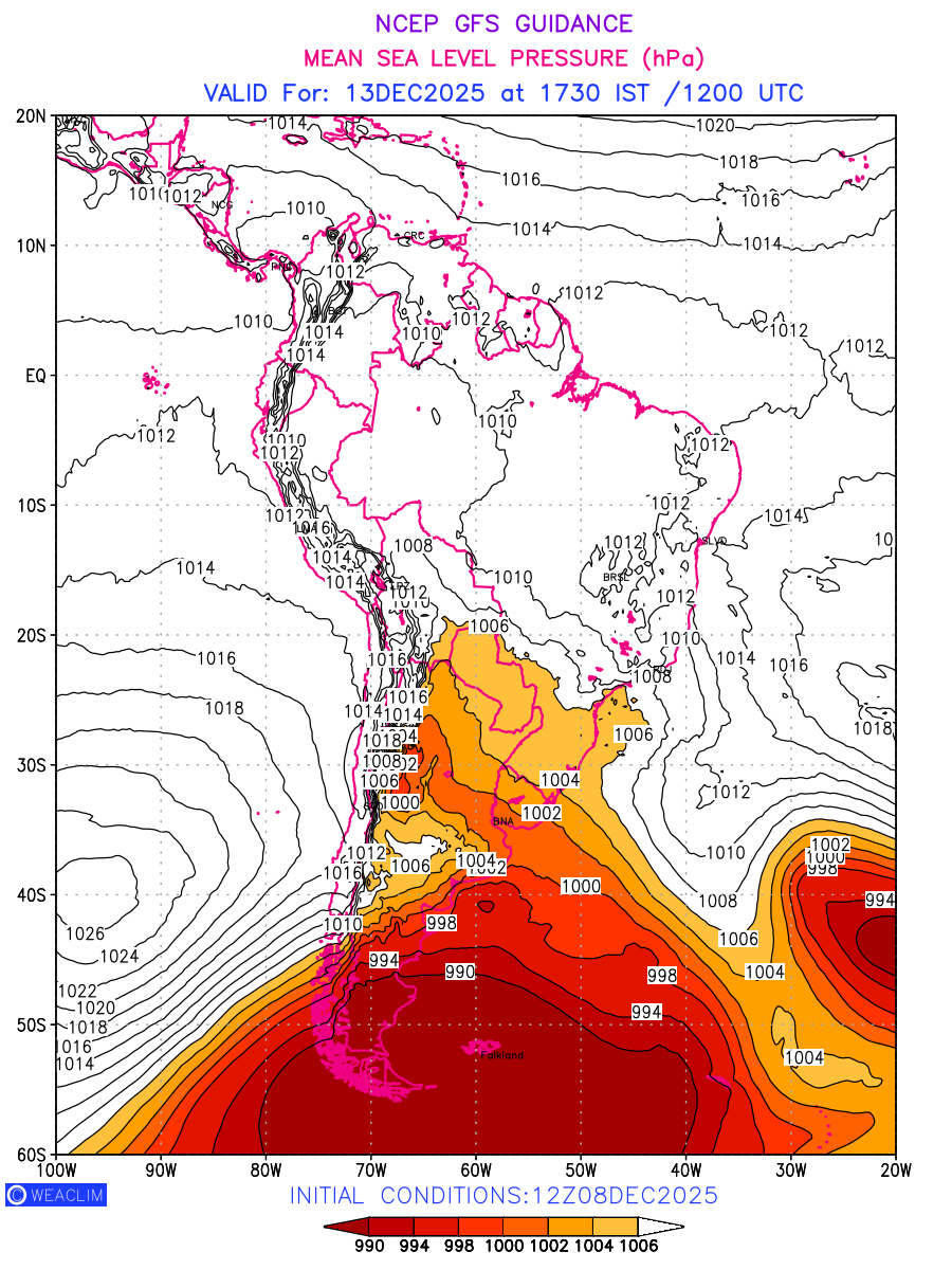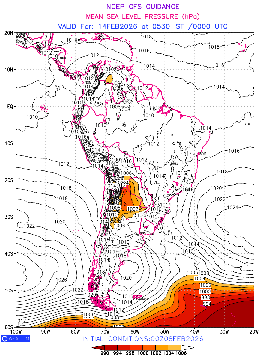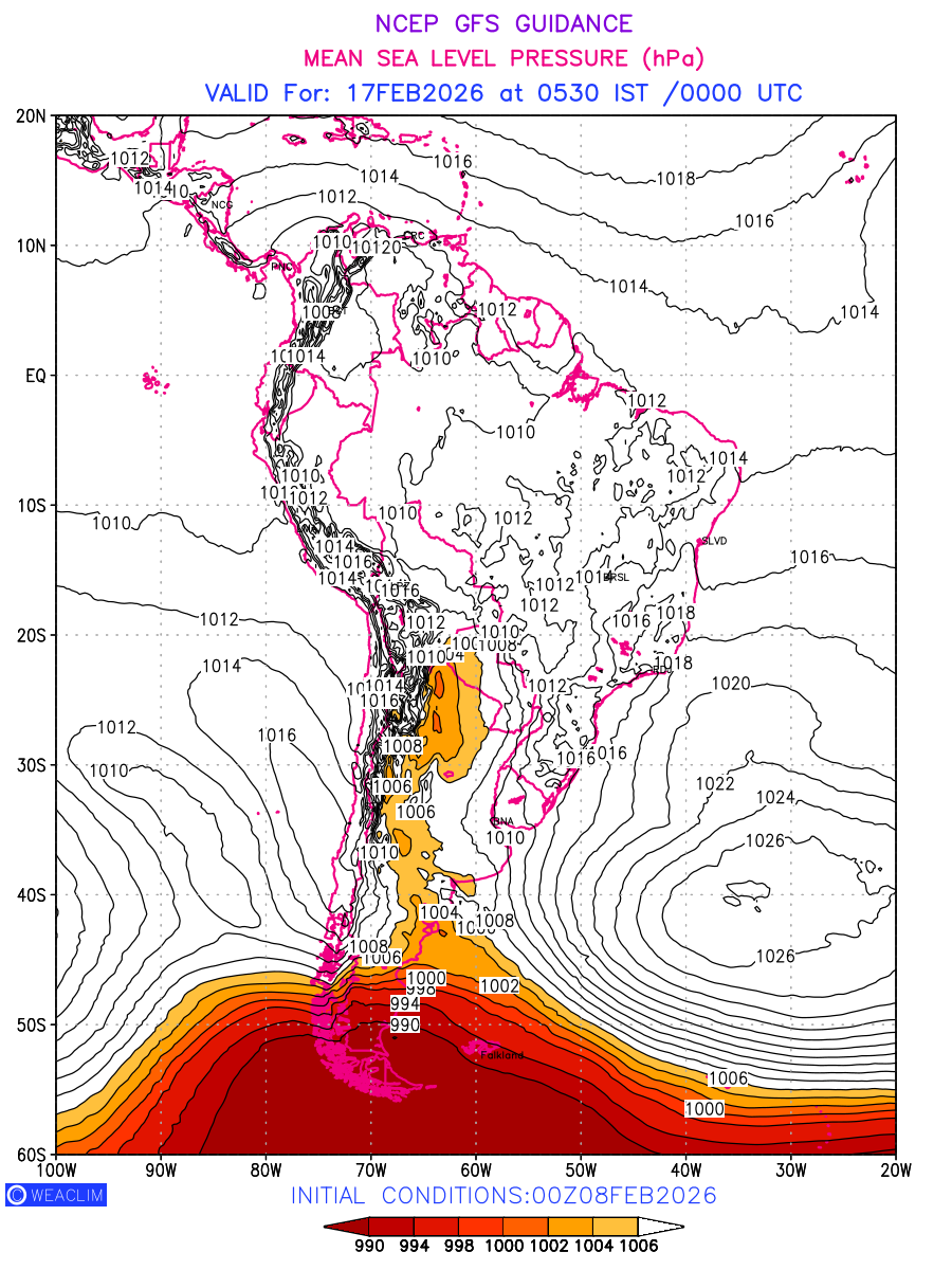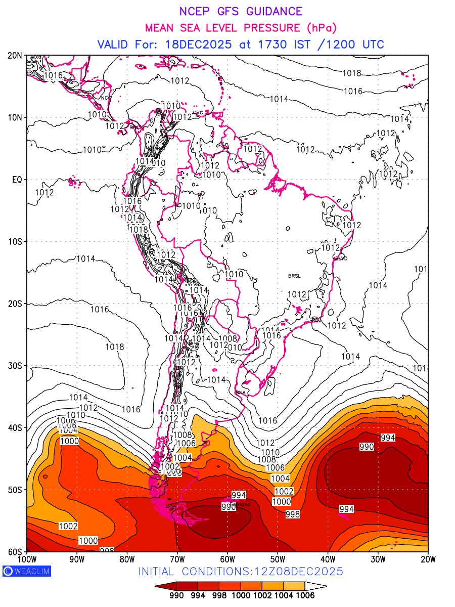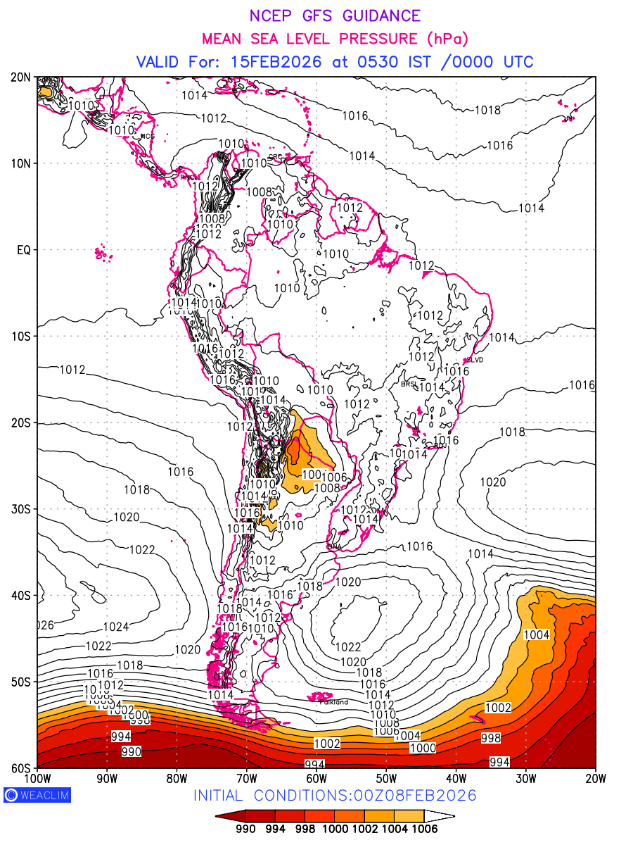 Mean Sea Level Pressure (MSLP) charts at the 24th hour for South America typically show a color-coded contour map of atmospheric pressure at sea level, with lines of equal pressure (isobars) indicating areas of high and low pressure over a geographic area. Meteorologists use these charts to identify areas of high and low pressure, which can give indications of storms, cold fronts, or warm fronts. The MSLP charts are also useful in identifying areas of convergence and divergence in the atmosphere, which can influence the formation or decay of weather systems.