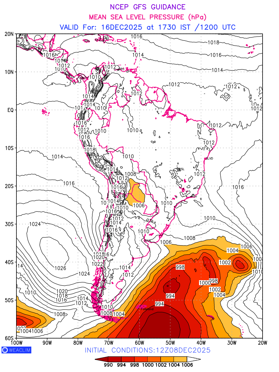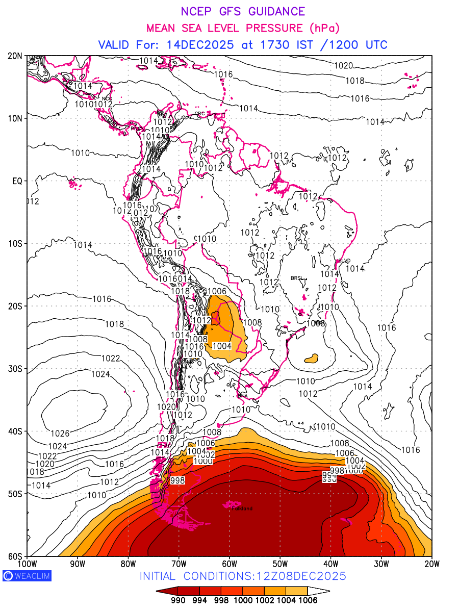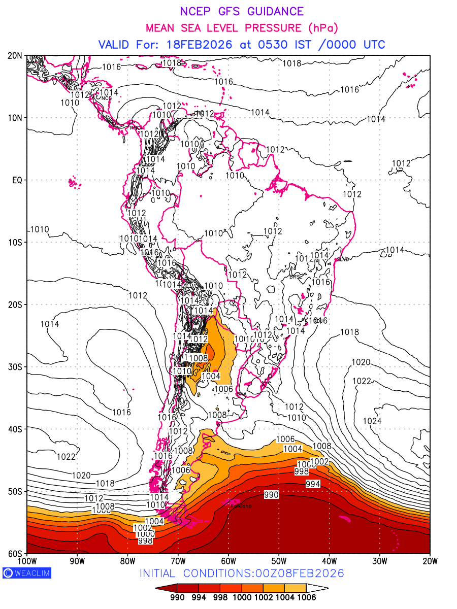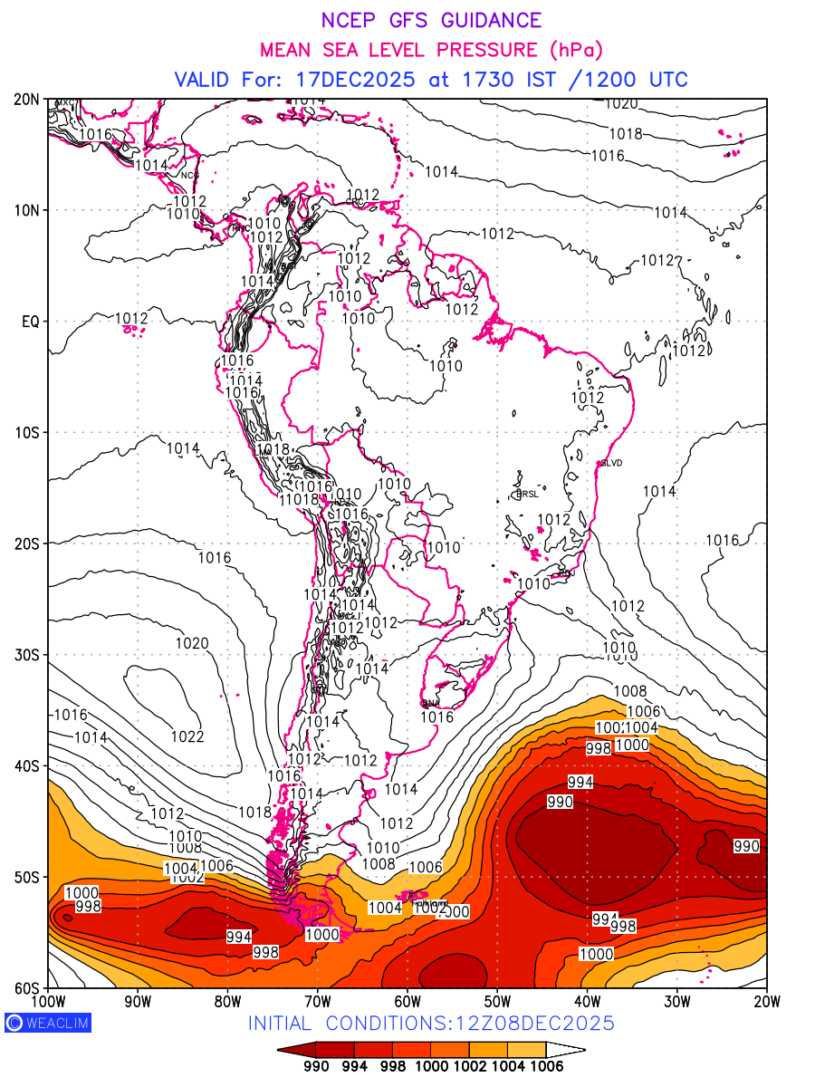 Mean Sea Level Pressure (MSLP) charts at the 24th hour for South America typically show a color-coded contour map of atmospheric pressure at sea level, with lines of equal pressure (isobars) indicating areas of high and low pressure over a geographic area. Meteorologists use these charts to identify areas of high and low pressure, which can give indications of storms, cold fronts, or warm fronts. The MSLP charts are also useful in identifying areas of convergence and divergence in the atmosphere, which can influence the formation or decay of weather systems.