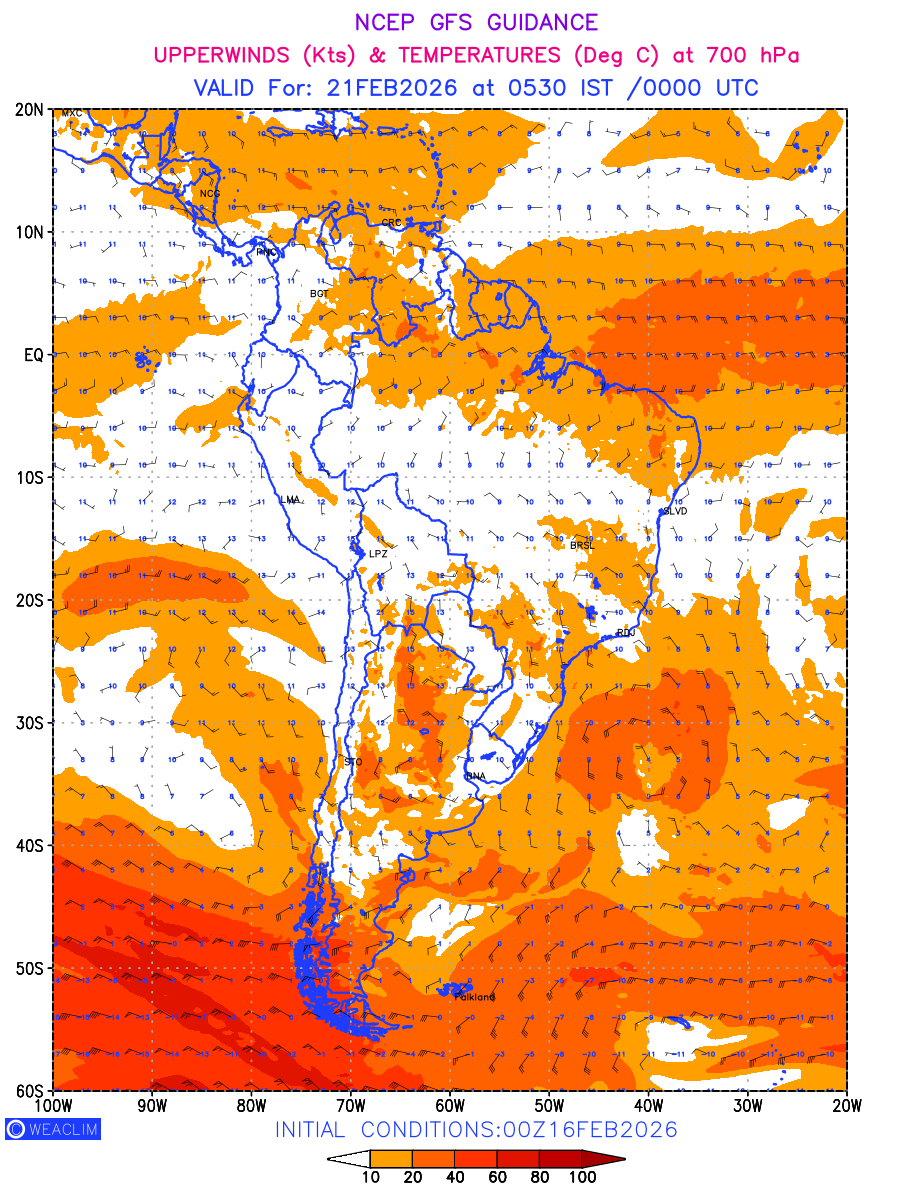 Winds at 700 hPa at the 24th hour for South America refers to the predicted wind direction and speed at a pressure level of 700 hPa, which is located in the middle troposphere (approximately 3,000 meters or 10,000 feet above the Earths surface). The winds are presented in knots (kt), and the direction is given in degrees from true north.Winds with magnitude of more than 20 kt are marked in shades of red. At this level, the wind speed and direction can influence the movement and development of weather systems such as storms, fronts, and high-pressure systems. Along with the wind speed (kt) and direction, upper air temperatures (Deg C) are also shown at the grid points over the South American Region at 700 hPa level for the next ten days.