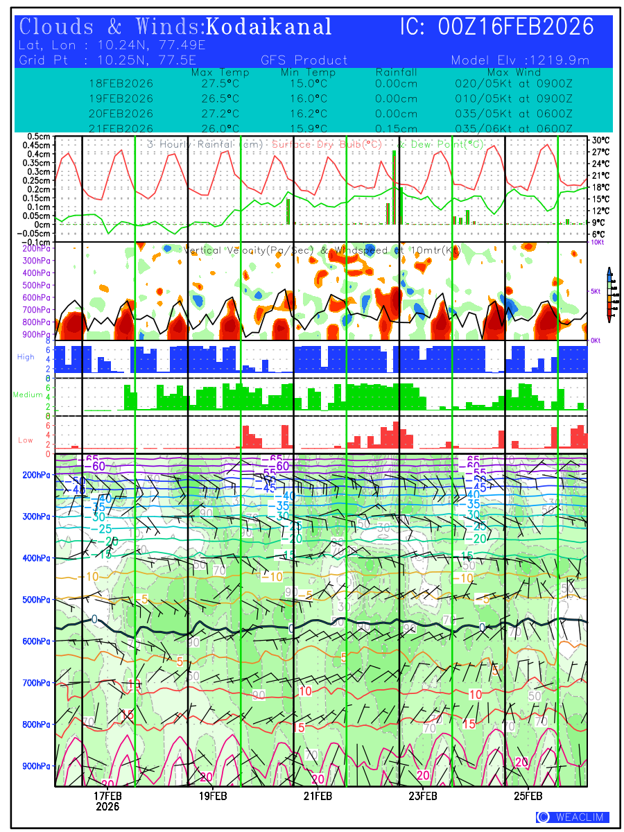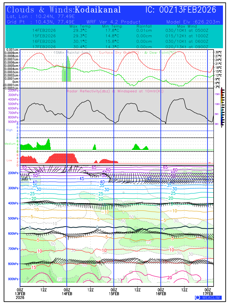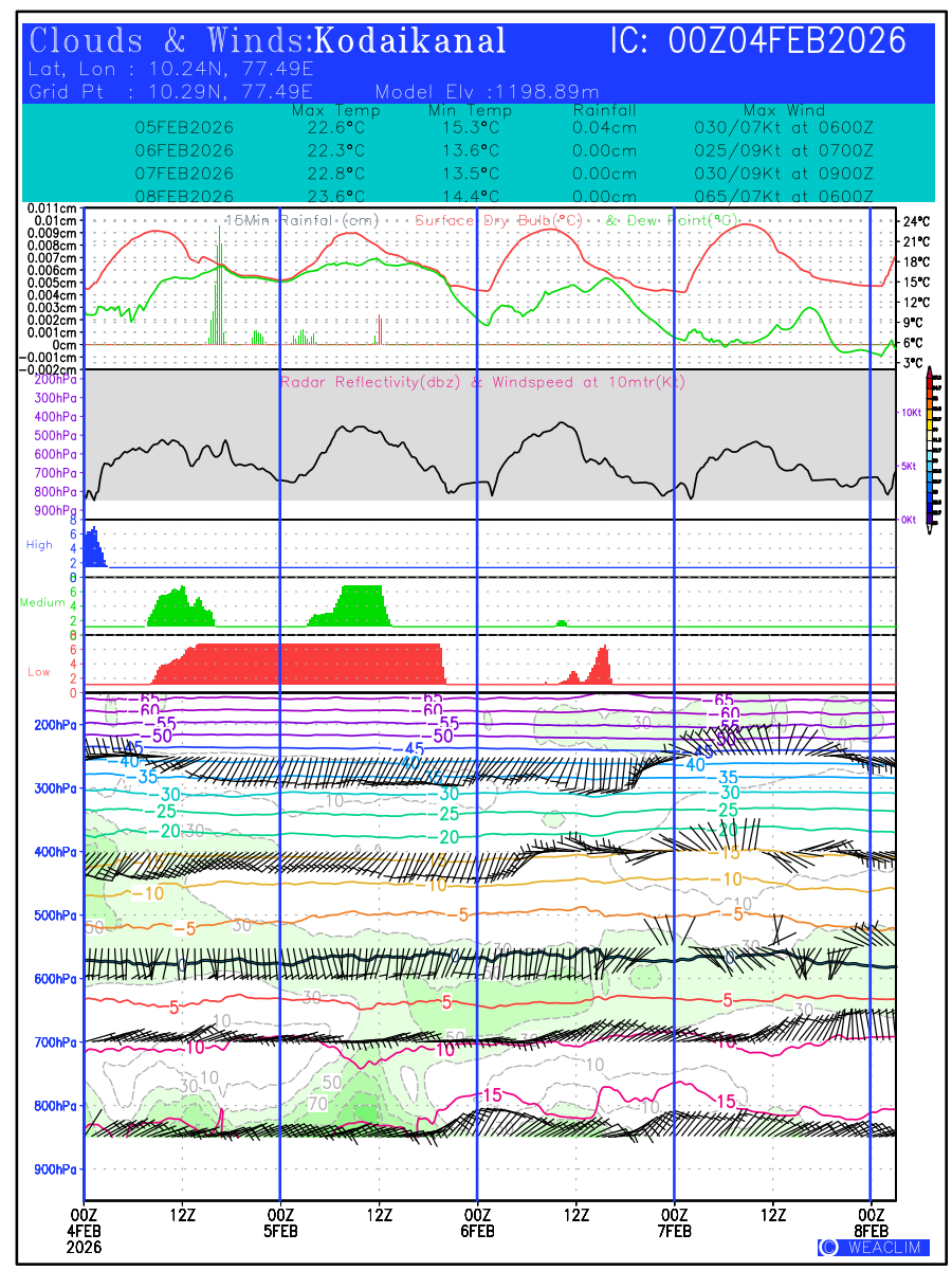 Location Specific Forecasts or Meteograms are graphics that display predicted meteorological data over time for a particular location. They provide a convenient way to quickly visualize and interpret complex weather data, allowing users to make informed decisions based on the latest weather information. These predictions are customised to a time frame with validity of ten days from the date of issue. First Panel at the bottom is the time height representation of the atmospheric profile from surface to 100 hPa level showing the magnitude and direction of winds through wind barbs, isotherm of temperature with freezing level depicted in black and the relative humidity contoured and shaded in green. Second, third and fourth panels show the oktas of low, medium and high clouds in red, green and blue colors, respectively. The fifth panel shows time height representation of Vertical Velocity (ω in Pa/Sec) contoured in shaded colors and the wind speed at 10 meters (kt). Vertical velocity shows the magnitude of verti al winds with negative values showing upward movement (causing formation of convective clouds) and positive values showing downward movement (leading to clear skies) of the airmass at the selected location. The sixth panel shows the Hourly Rainfall (in cm) along with Surface Dry Bulb and Dew Point Temperatures ( o C) over the time period of next ten days. The seventh panel shows the values of predicted Maximum and Minimum Temperature ( o C), Rainfall amount (in cm) and time of Maximum Winds (kt) expected during the next three days.The eighth panel at the top gives the general information on name of the selected location, time of initial conditions (in UTC), latitude and longitude of the location and its model elevation.