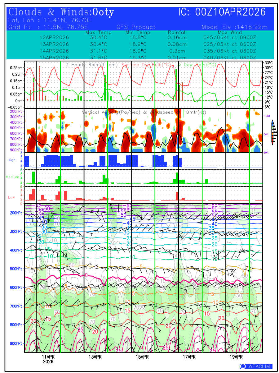 Location Specific Forecasts or Meteograms are graphics that display predicted meteorological data over time for a particular location. They provide a convenient way to quickly visualize and interpret complex weather data, allowing users to make informed decisions based on the latest weather information. These predictions are customised to a time frame with validity of ten days from the date of issue. First Panel at the bottom is the time height representation of the atmospheric profile from surface to 100 hPa level showing the magnitude and direction of winds through wind barbs, isotherm of temperature with freezing level depicted in black and the relative humidity contoured and shaded in green. Second, third and fourth panels show the oktas of low, medium and high clouds in red, green and blue colors, respectively. The fifth panel shows time height representation of Vertical Velocity (ω in Pa/Sec) contoured in shaded colors and the wind speed at 10 meters (kt). Vertical velocity shows the magnitude of verti al winds with negative values showing upward movement (causing formation of convective clouds) and positive values showing downward movement (leading to clear skies) of the airmass at the selected location. The sixth panel shows the Hourly Rainfall (in cm) along with Surface Dry Bulb and Dew Point Temperatures ( o C) over the time period of next ten days. The seventh panel shows the values of predicted Maximum and Minimum Temperature ( o C), Rainfall amount (in cm) and time of Maximum Winds (kt) expected during the next three days.The eighth panel at the top gives the general information on name of the selected location, time of initial conditions (in UTC), latitude and longitude of the location and its model elevation.