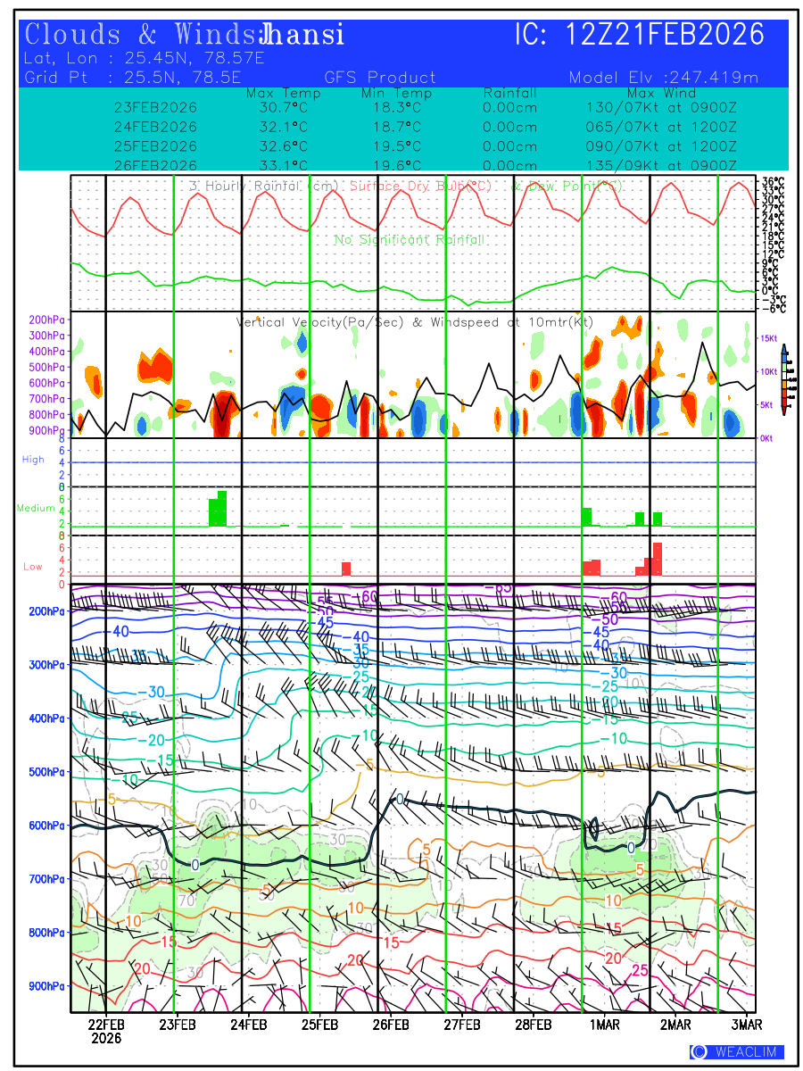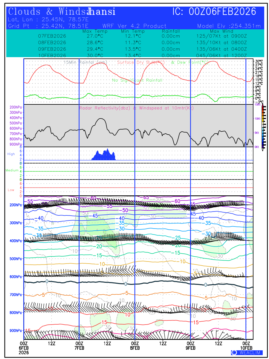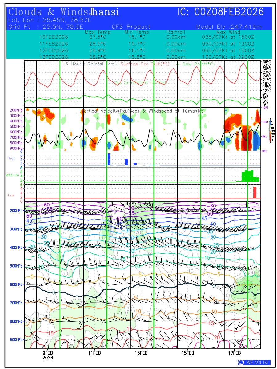 Location Specific Forecasts or Meteograms are graphics that display predicted meteorological data over time for a particular location. They provide a convenient way to quickly visualize and interpret complex weather data, allowing users to make informed decisions based on the latest weather information. These predictions are customised to a time frame with validity of ten days from the date of issue. First Panel at the bottom is the time height representation of the atmospheric profile from surface to 100 hPa level showing the magnitude and direction of winds through wind barbs, isotherm of temperature with freezing level depicted in black and the relative humidity contoured and shaded in green. Second, third and fourth panels show the oktas of low, medium and high clouds in red, green and blue colors, respectively. The fifth panel shows time height representation of Vertical Velocity (ω in Pa/Sec) contoured in shaded colors and the wind speed at 10 meters (kt). Vertical velocity shows the magnitude of verti al winds with negative values showing upward movement (causing formation of convective clouds) and positive values showing downward movement (leading to clear skies) of the airmass at the selected location. The sixth panel shows the Hourly Rainfall (in cm) along with Surface Dry Bulb and Dew Point Temperatures ( o C) over the time period of next ten days. The seventh panel shows the values of predicted Maximum and Minimum Temperature ( o C), Rainfall amount (in cm) and time of Maximum Winds (kt) expected during the next three days.The eighth panel at the top gives the general information on name of the selected location, time of initial conditions (in UTC), latitude and longitude of the location and its model elevation.