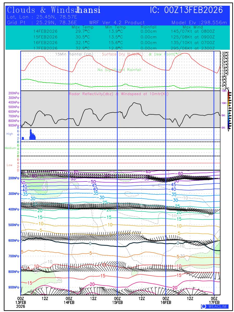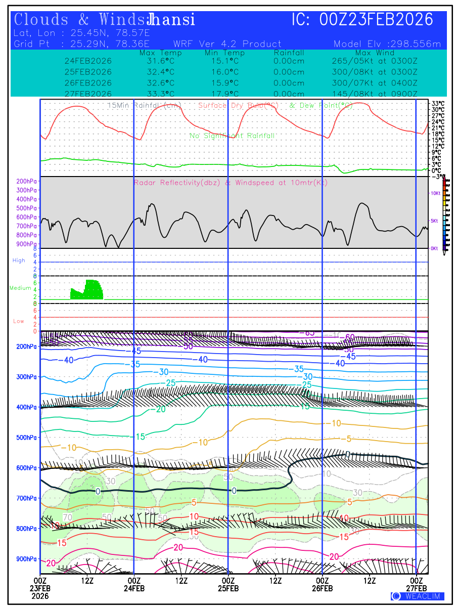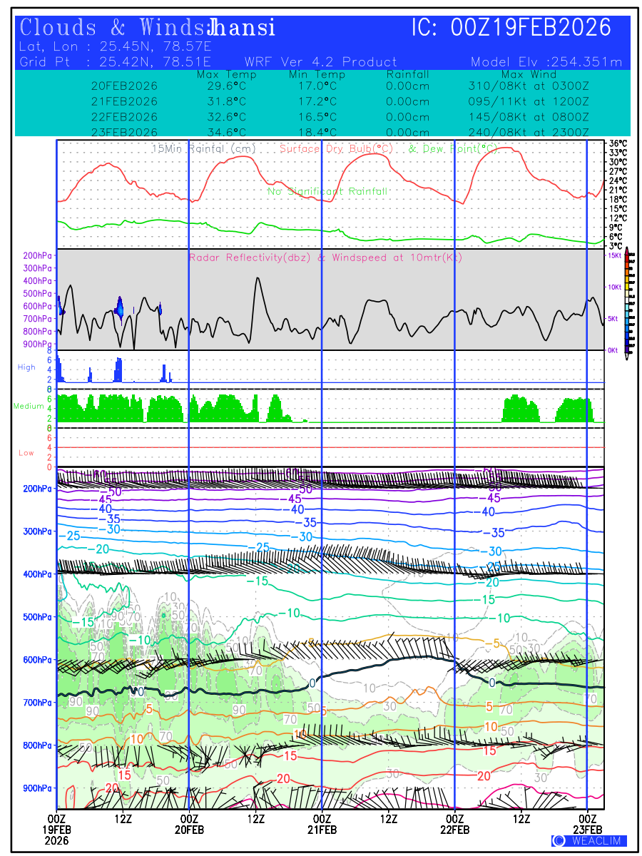 Location Specific Forecasts or Meteograms are graphics that display predicted meteorological data over time for a particular location. They provide a convenient way to quickly visualize and interpret complex weather data, allowing users to make informed decisions based on the latest weather information. These predictions are customised to a time frame with validity of ten days from the date of issue. First Panel at the bottom is the time height representation of the atmospheric profile from surface to 100 hPa level showing the magnitude and direction of winds through wind barbs, isotherm of temperature with freezing level depicted in black and the relative humidity contoured and shaded in green. Second, third and fourth panels show the oktas of low, medium and high clouds in red, green and blue colors, respectively. The fifth panel shows time height representation of Vertical Velocity (ω in Pa/Sec) contoured in shaded colors and the wind speed at 10 meters (kt). Vertical velocity shows the magnitude of verti al winds with negative values showing upward movement (causing formation of convective clouds) and positive values showing downward movement (leading to clear skies) of the airmass at the selected location. The sixth panel shows the Hourly Rainfall (in cm) along with Surface Dry Bulb and Dew Point Temperatures ( o C) over the time period of next ten days. The seventh panel shows the values of predicted Maximum and Minimum Temperature ( o C), Rainfall amount (in cm) and time of Maximum Winds (kt) expected during the next three days.The eighth panel at the top gives the general information on name of the selected location, time of initial conditions (in UTC), latitude and longitude of the location and its model elevation.