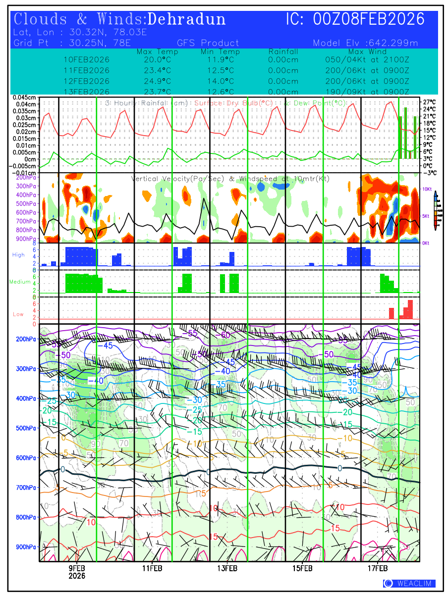 Location Specific Forecasts or Meteograms are graphics that display predicted meteorological data over time for a particular location. They provide a convenient way to quickly visualize and interpret complex weather data, allowing users to make informed decisions based on the latest weather information. These predictions are customised to a time frame with validity of ten days from the date of issue. First Panel at the bottom is the time height representation of the atmospheric profile from surface to 100 hPa level showing the magnitude and direction of winds through wind barbs, isotherm of temperature with freezing level depicted in black and the relative humidity contoured and shaded in green. Second, third and fourth panels show the oktas of low, medium and high clouds in red, green and blue colors, respectively. The fifth panel shows time height representation of Vertical Velocity (ω in Pa/Sec) contoured in shaded colors and the wind speed at 10 meters (kt). Vertical velocity shows the magnitude of verti al winds with negative values showing upward movement (causing formation of convective clouds) and positive values showing downward movement (leading to clear skies) of the airmass at the selected location. The sixth panel shows the Hourly Rainfall (in cm) along with Surface Dry Bulb and Dew Point Temperatures ( o C) over the time period of next ten days. The seventh panel shows the values of predicted Maximum and Minimum Temperature ( o C), Rainfall amount (in cm) and time of Maximum Winds (kt) expected during the next three days.The eighth panel at the top gives the general information on name of the selected location, time of initial conditions (in UTC), latitude and longitude of the location and its model elevation.