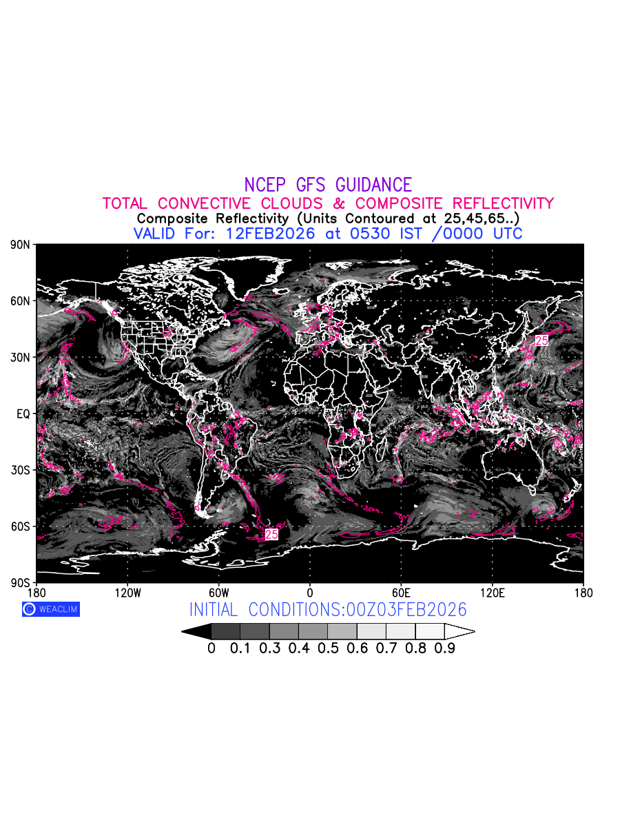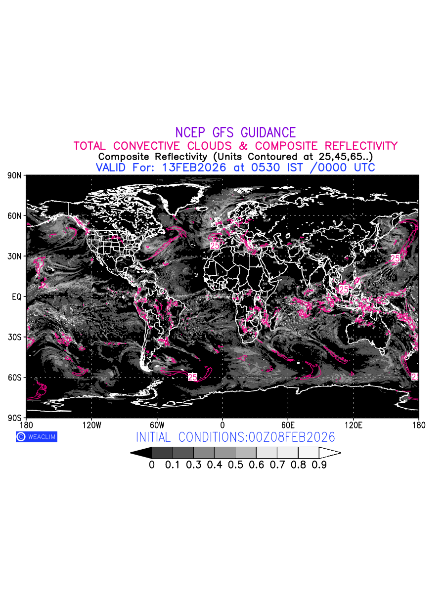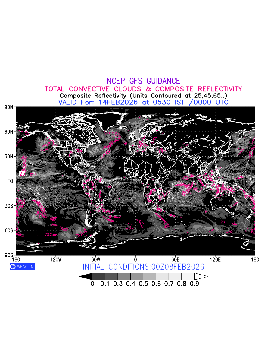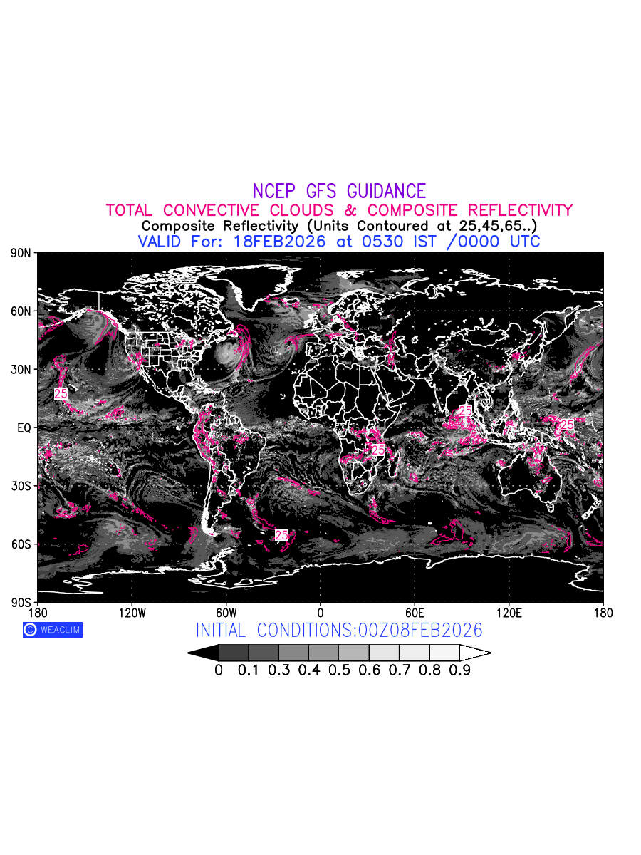 Convective clouds are formed by the vertical movement of air in the atmosphere and are associated with thunderstorms and other types of severe weather like intense rainfall, strong gusty winds etc. Shades from black to white on scale of 0 to 1 with whiter shade depicting more intensity of convection has been used in the depiction. Also shown is the Composite Reflectivity that takes the maximum reflectivity from each elevation angle of the Doppler Weather Radar and meshes it into one image. Advantage of this type of image is the ability to quickly assess the intensity of storms. Predicted pattern of Total Convective Clouds and percentage of the sky covered by them is shown here along with Composite Reflectivity over the entire World for the next ten days.
