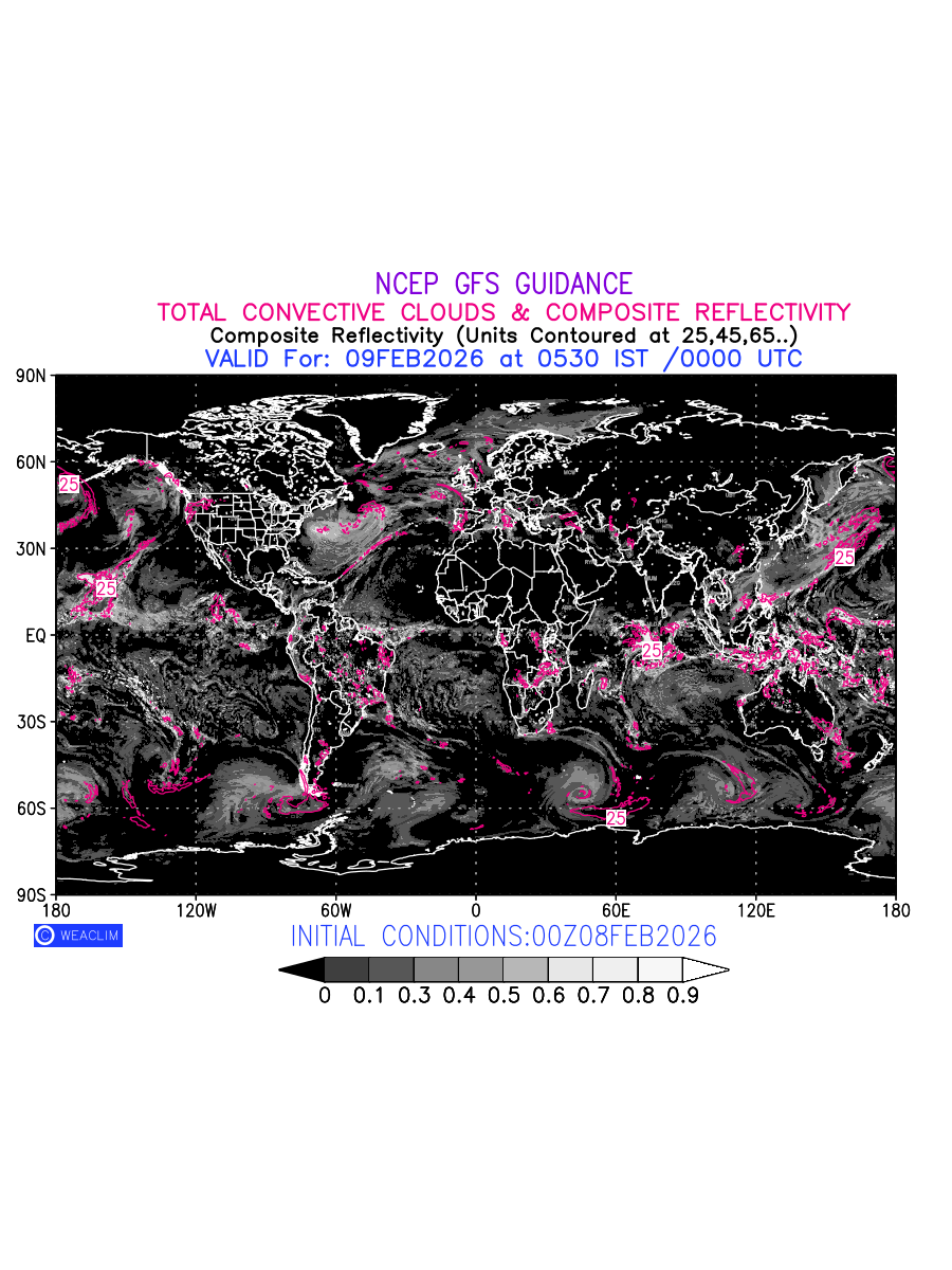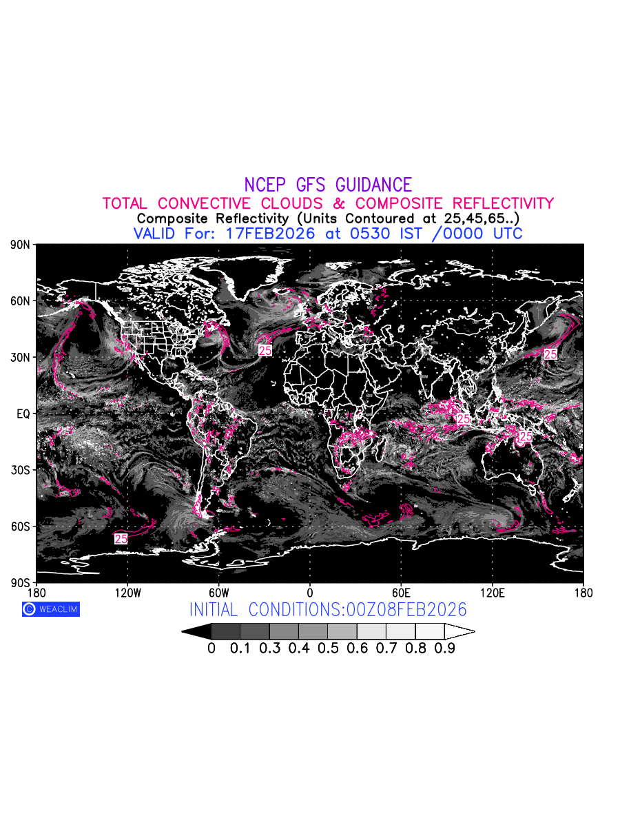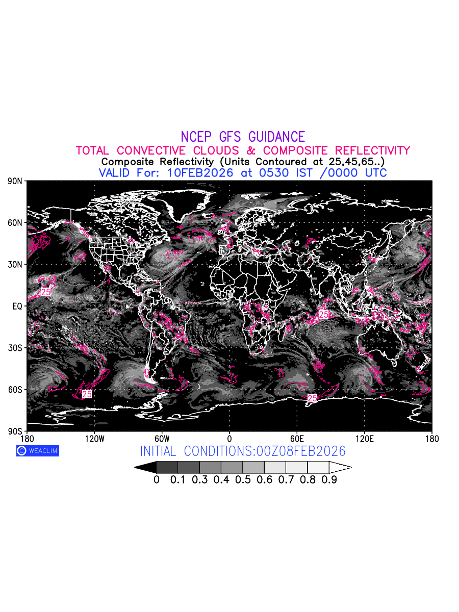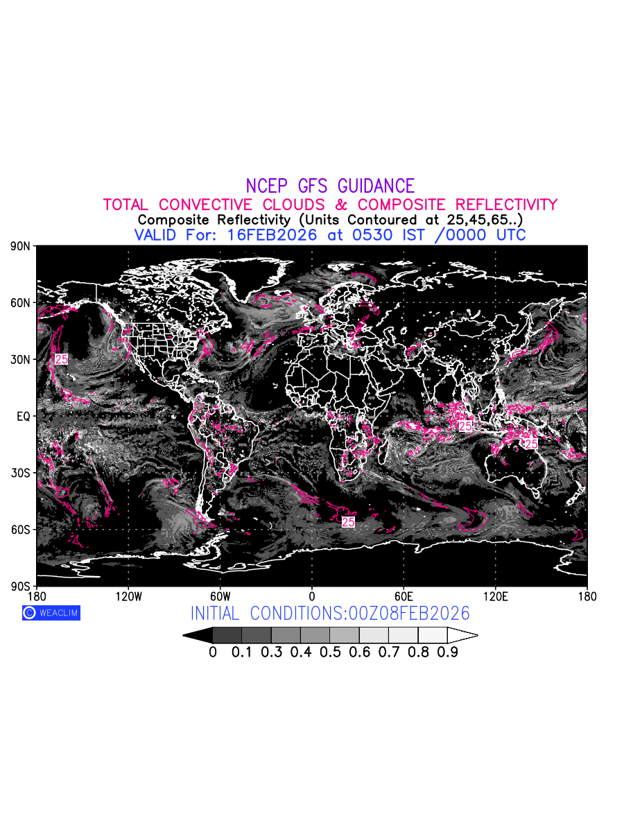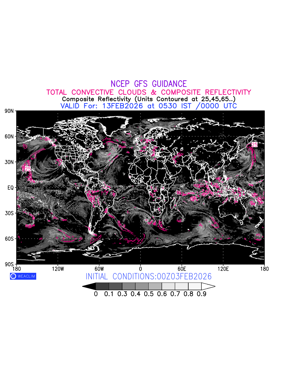 Convective clouds are formed by the vertical movement of air in the atmosphere and are associated with thunderstorms and other types of severe weather like intense rainfall, strong gusty winds etc. Shades from black to white on scale of 0 to 1 with whiter shade depicting more intensity of convection has been used in the depiction. Also shown is the Composite Reflectivity that takes the maximum reflectivity from each elevation angle of the Doppler Weather Radar and meshes it into one image. Advantage of this type of image is the ability to quickly assess the intensity of storms. Predicted pattern of Total Convective Clouds and percentage of the sky covered by them is shown here along with Composite Reflectivity over the entire World for the next ten days.