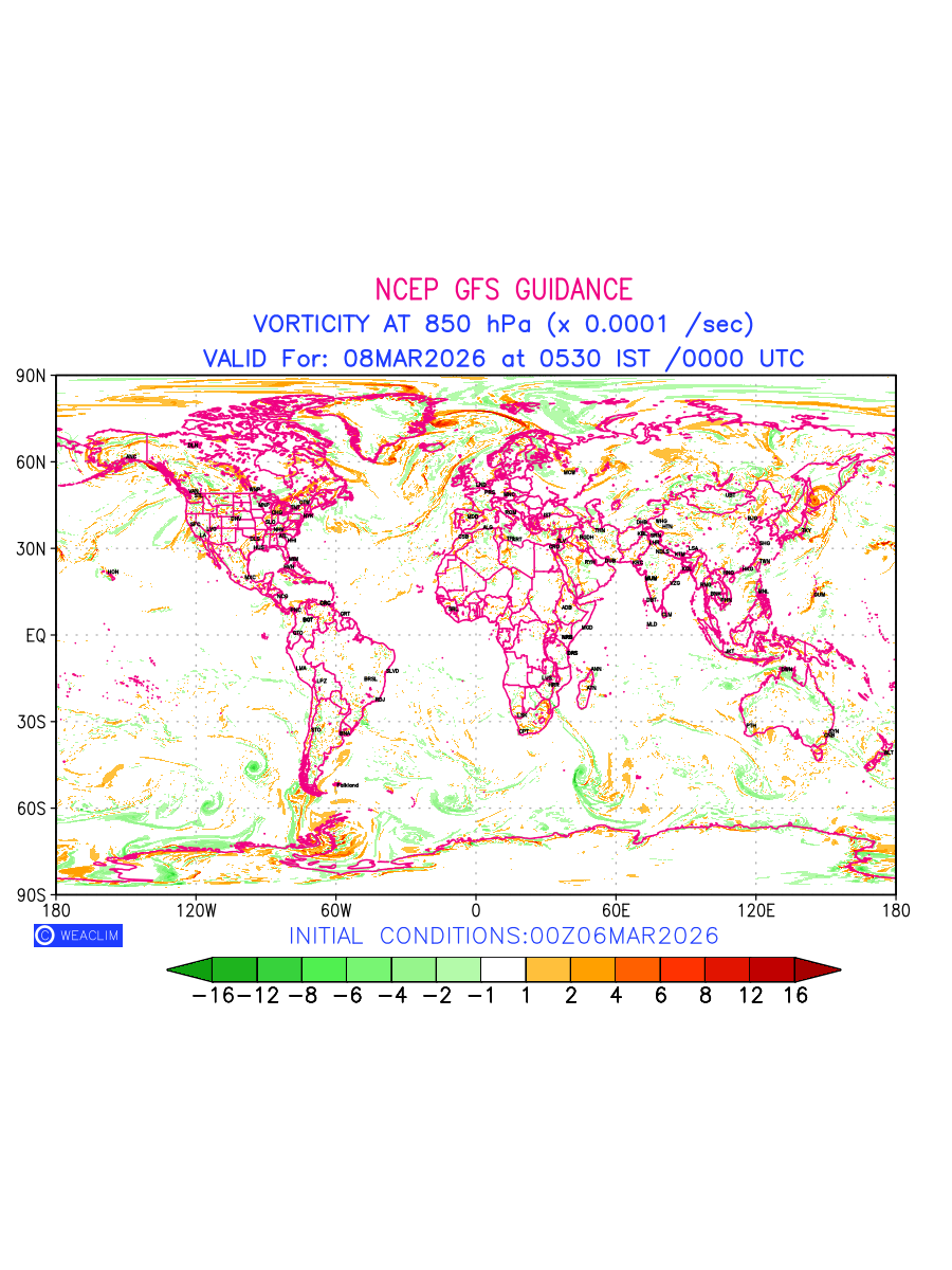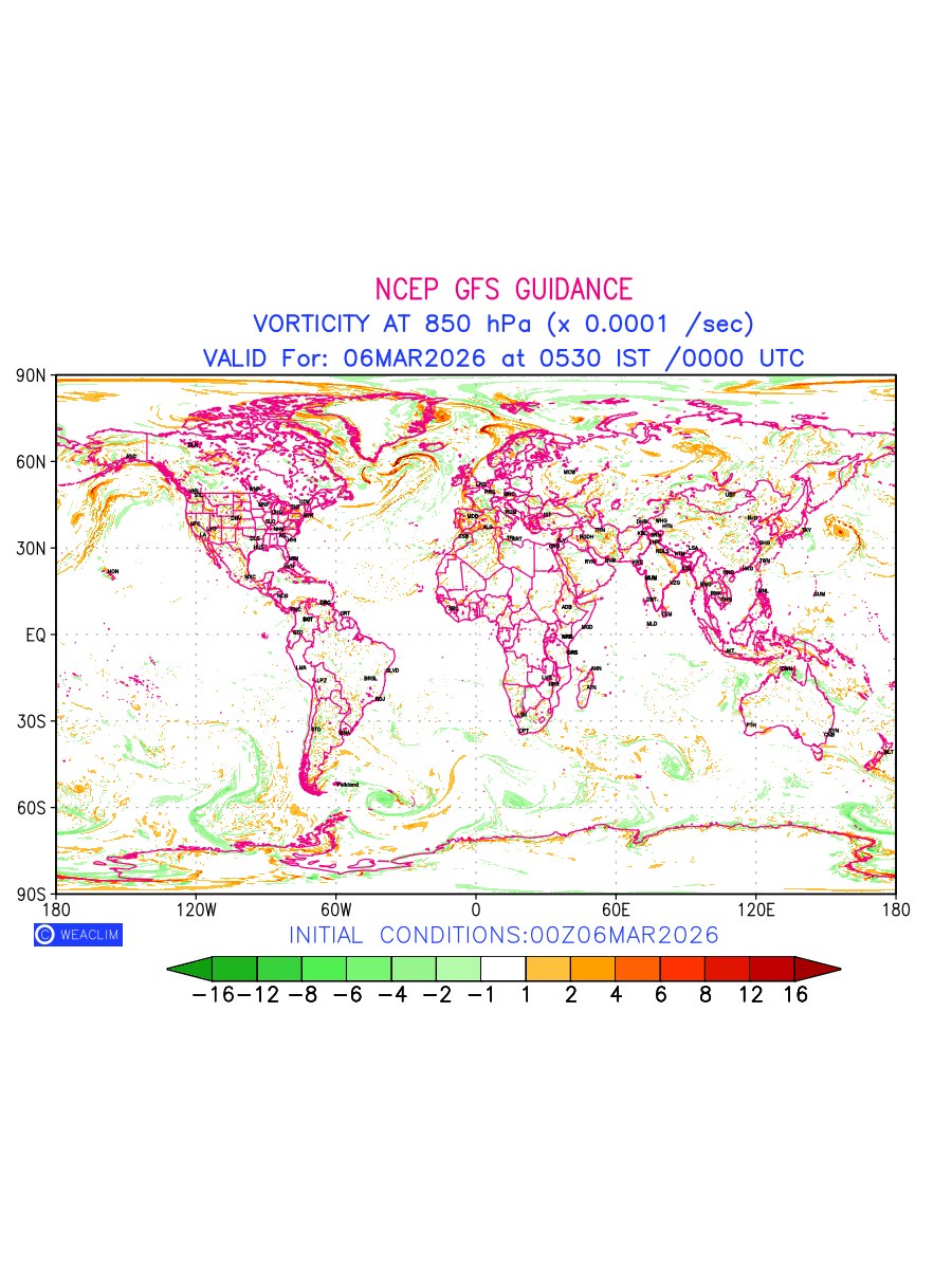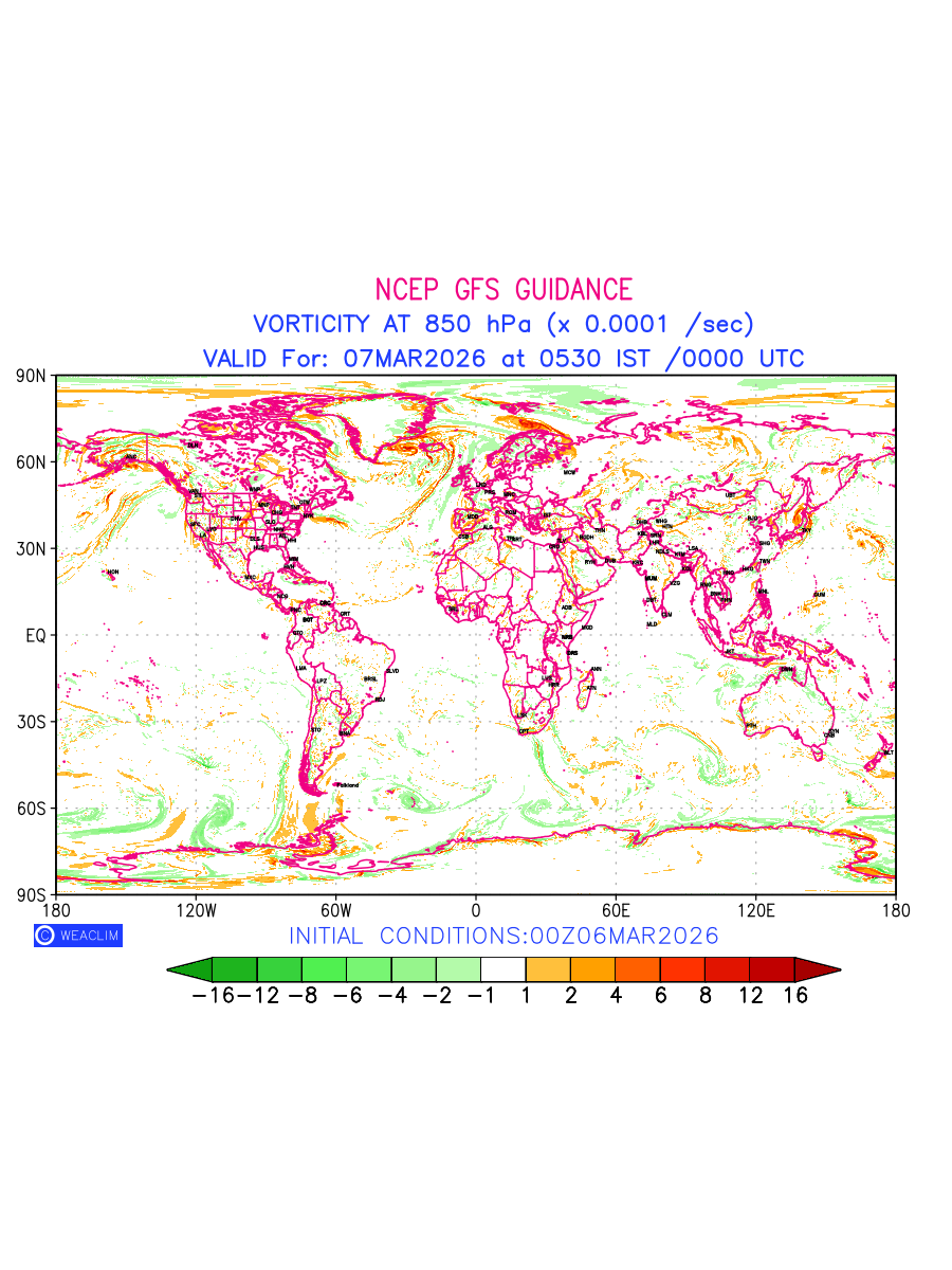 Low Level Convergence at the 24th hour for entire World is the graphical representation of the expected magnitude and pattern of horizontal rotation (or the vorticity) of atmosphere around a vertical axis or the vorticity at 850hPa (1.5km). In northern hemisphere it is typically displayed with warm colors ranging from shades of red (to yellow) indicating positive vorticity (cyclonic rotation), and cool colors shades of green (to blue) indicating negative vorticity (anticyclonic rotation). They are useful tools for identifying areas of high and low vorticity, associated with weather systems such as fronts, lows, and highs etc.
