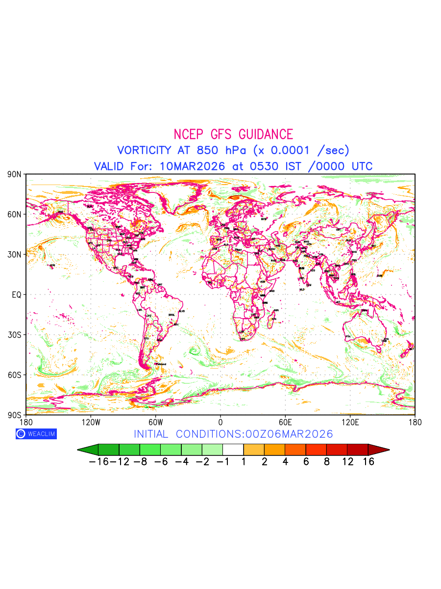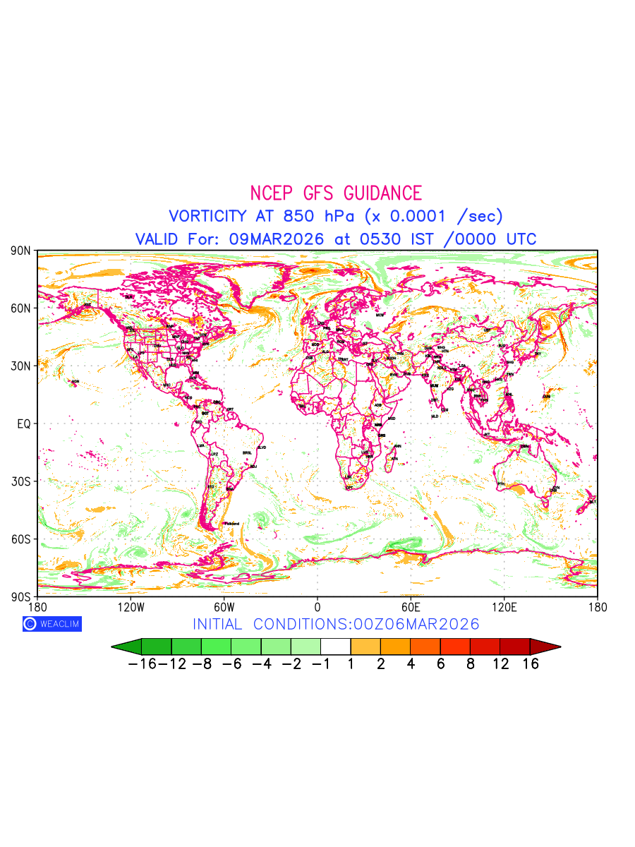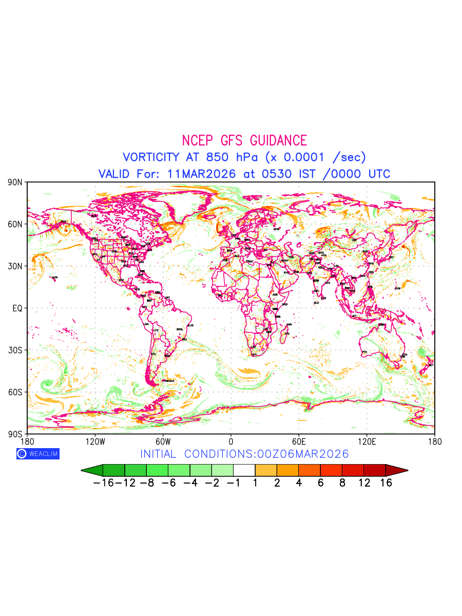 Low Level Convergence at the 24th hour for entire World is the graphical representation of the expected magnitude and pattern of horizontal rotation (or the vorticity) of atmosphere around a vertical axis or the vorticity at 850hPa (1.5km). In northern hemisphere it is typically displayed with warm colors ranging from shades of red (to yellow) indicating positive vorticity (cyclonic rotation), and cool colors shades of green (to blue) indicating negative vorticity (anticyclonic rotation). They are useful tools for identifying areas of high and low vorticity, associated with weather systems such as fronts, lows, and highs etc.