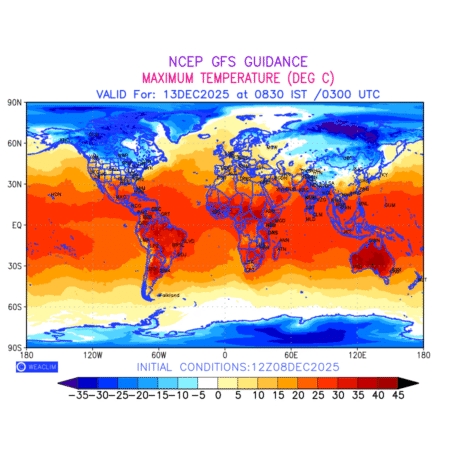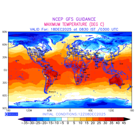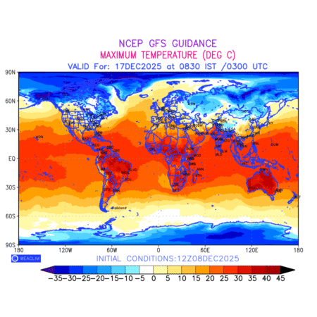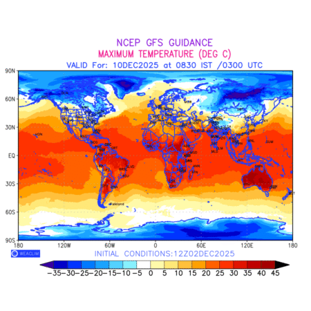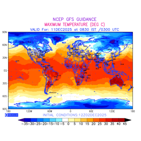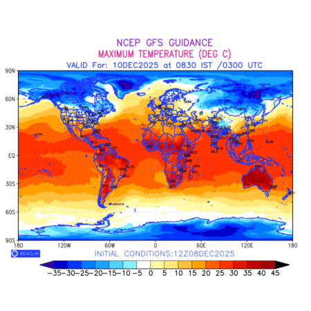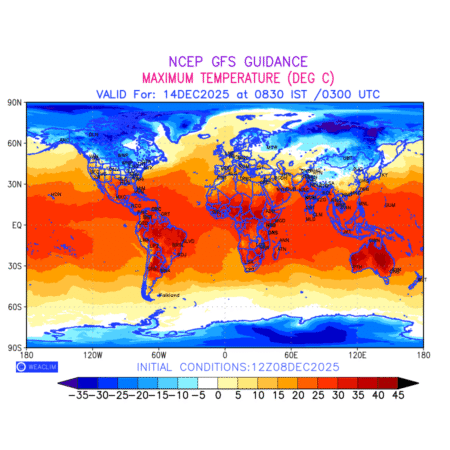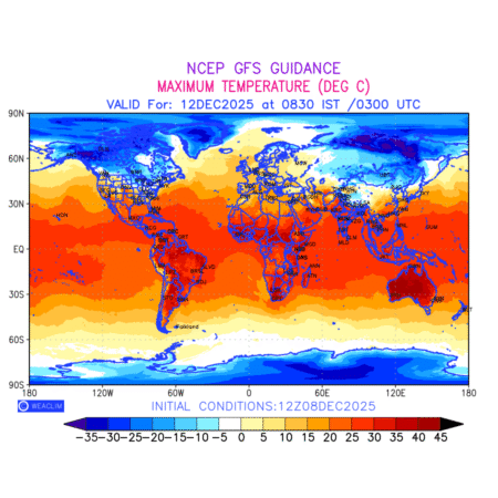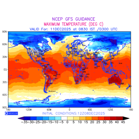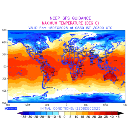 Maximum Temperature for entire World countries depicts the highest temperatures at 2m above the ground surface between 0300 UTC of the previous date to 0300 UTC of the required date. This is an important variable for weather forecasting, as it determines the conditions at the Earth’s surface during the warmest part of the date,affecting human activities, agriculture, and the environment. 2m Temperature data can be used for a variety of applications, such as predicting the onset of heatwaves or cold spells, forecasting temperature trends, and studying the impact of weather on various systems and processes.