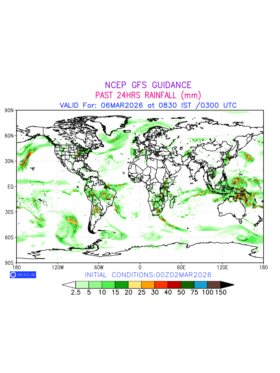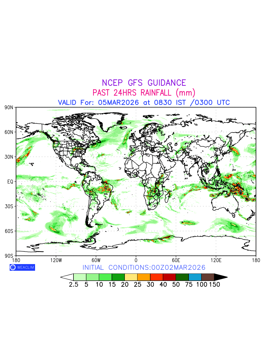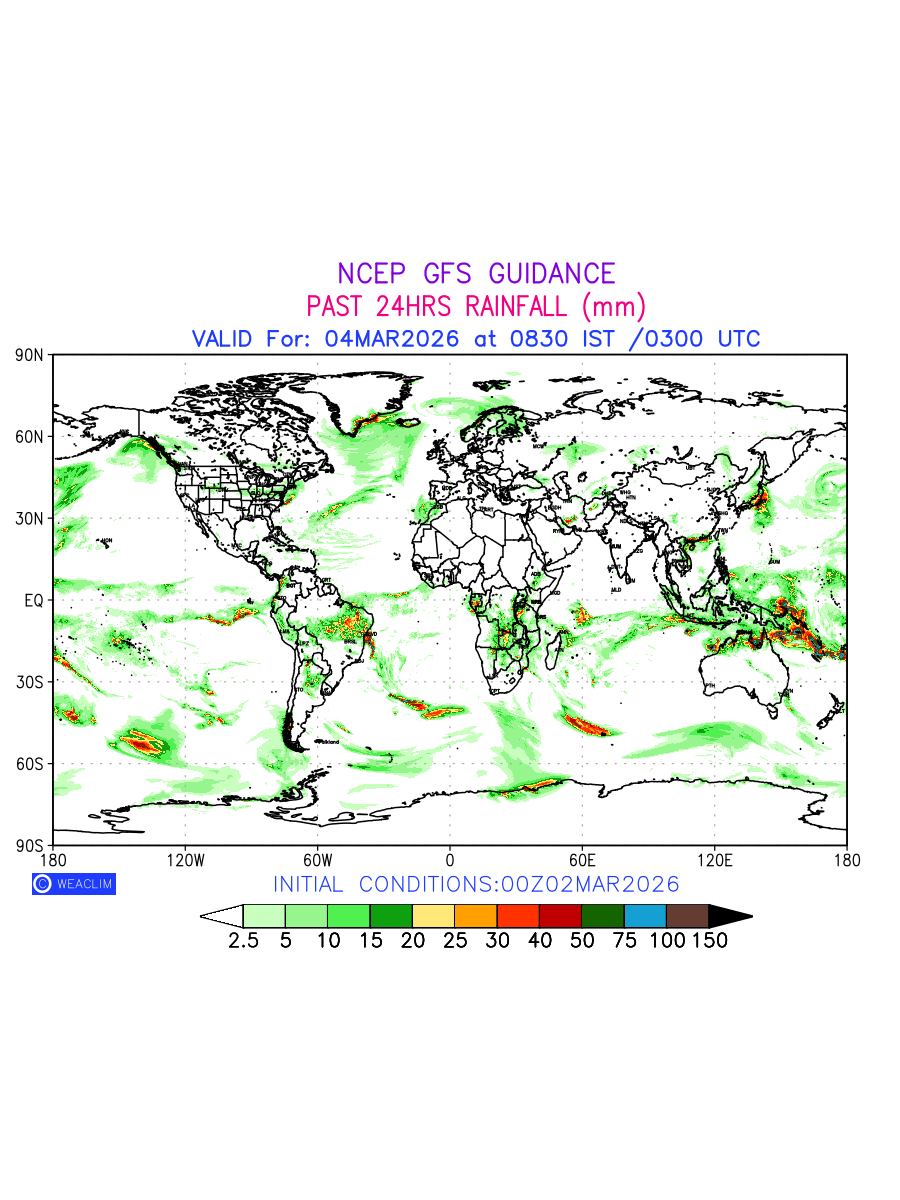 Rainfall forecast for 24 hours for entire World is expected amount of precipitation in millimeters for a given area over a time period of 24 hours and valid from 0300 UTC (0830 IST) of the previous date to 0300 UTC of the required date. This prediction enables the users to plan/review their tasks that are affected by rainfall related severe weather events that may lead to flooding, drought, snowfall and avalanche etc.