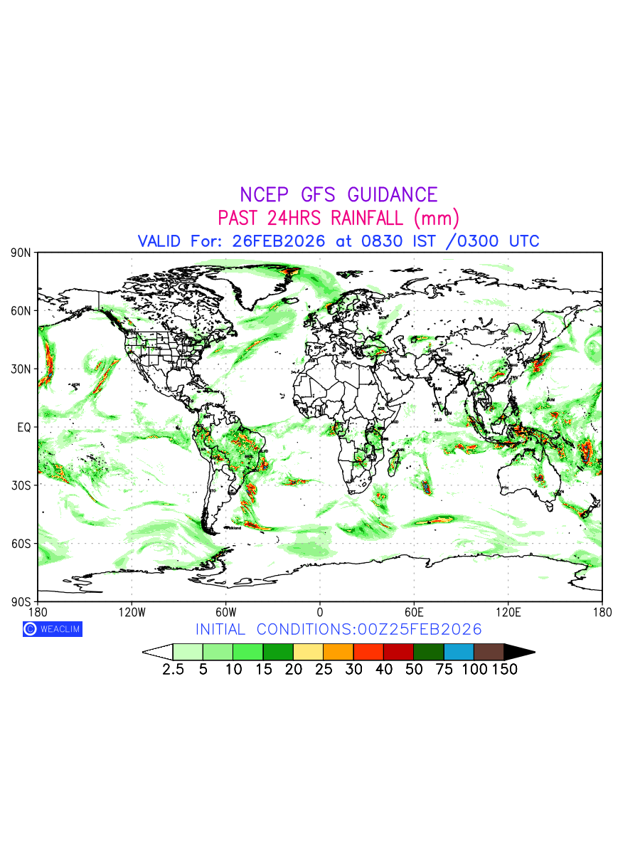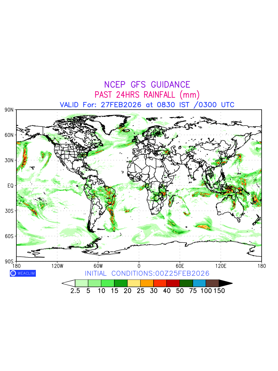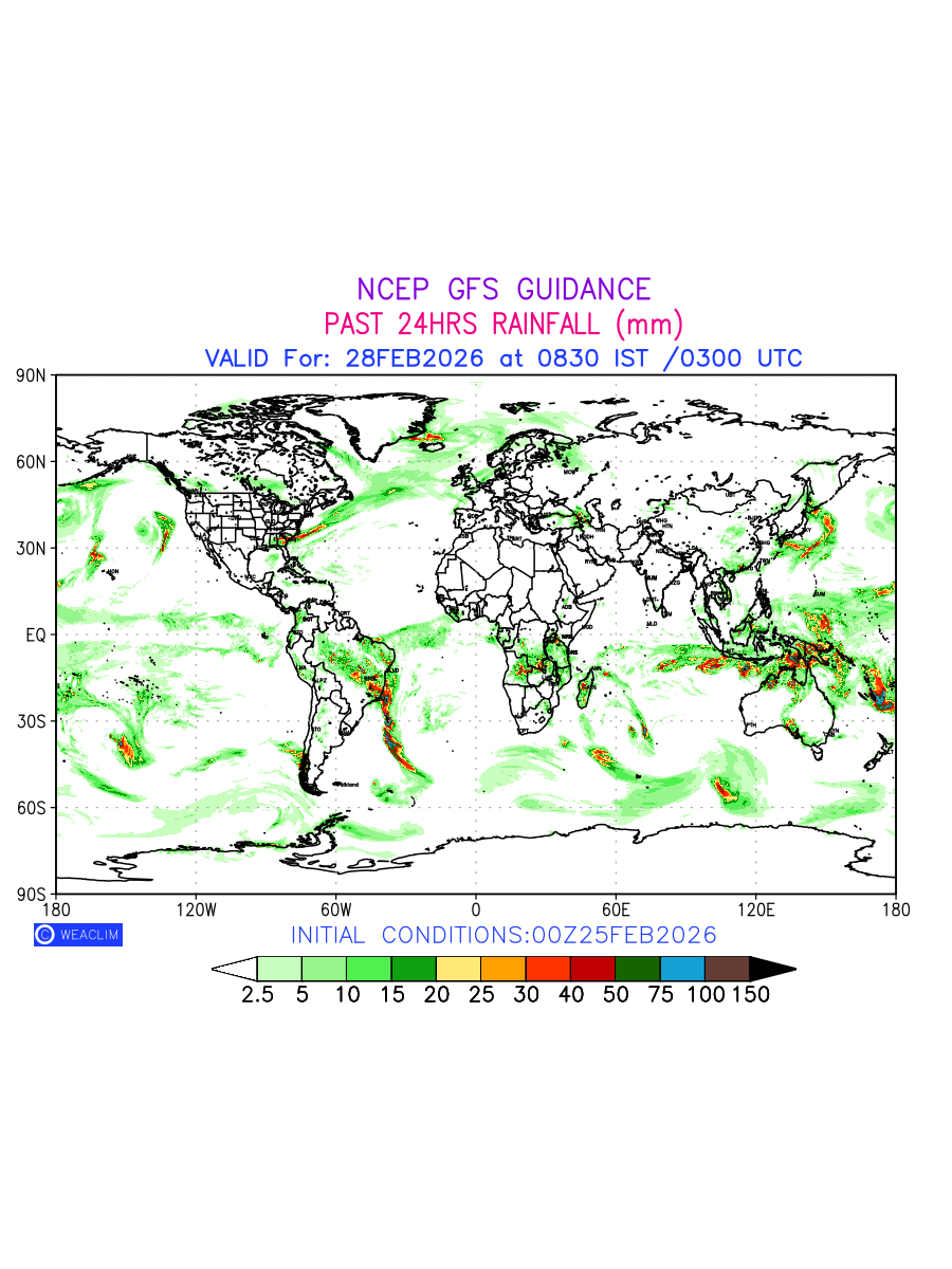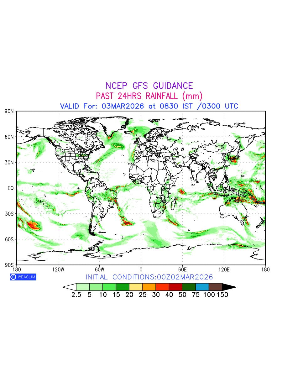 Rainfall forecast for 24 hours for entire World is expected amount of precipitation in millimeters for a given area over a time period of 24 hours and valid from 0300 UTC (0830 IST) of the previous date to 0300 UTC of the required date. This prediction enables the users to plan/review their tasks that are affected by rainfall related severe weather events that may lead to flooding, drought, snowfall and avalanche etc.