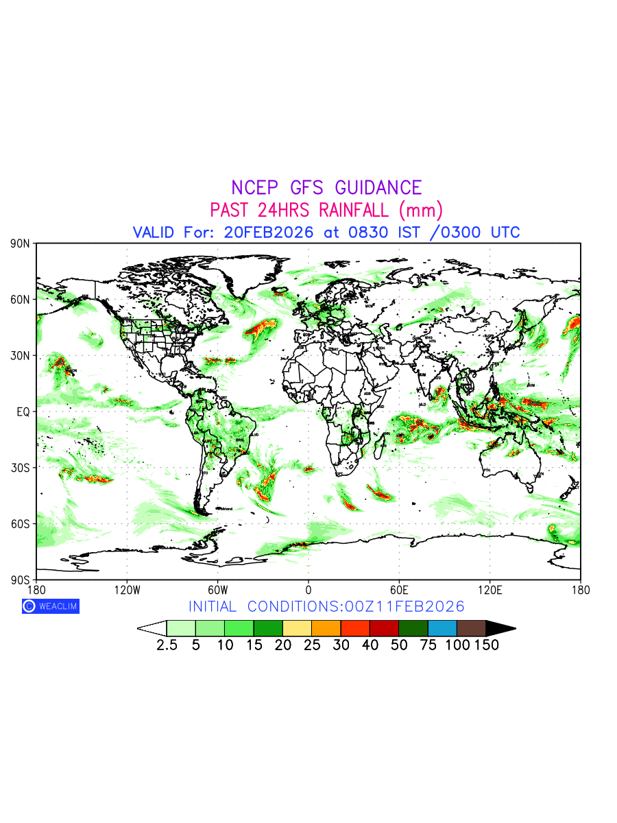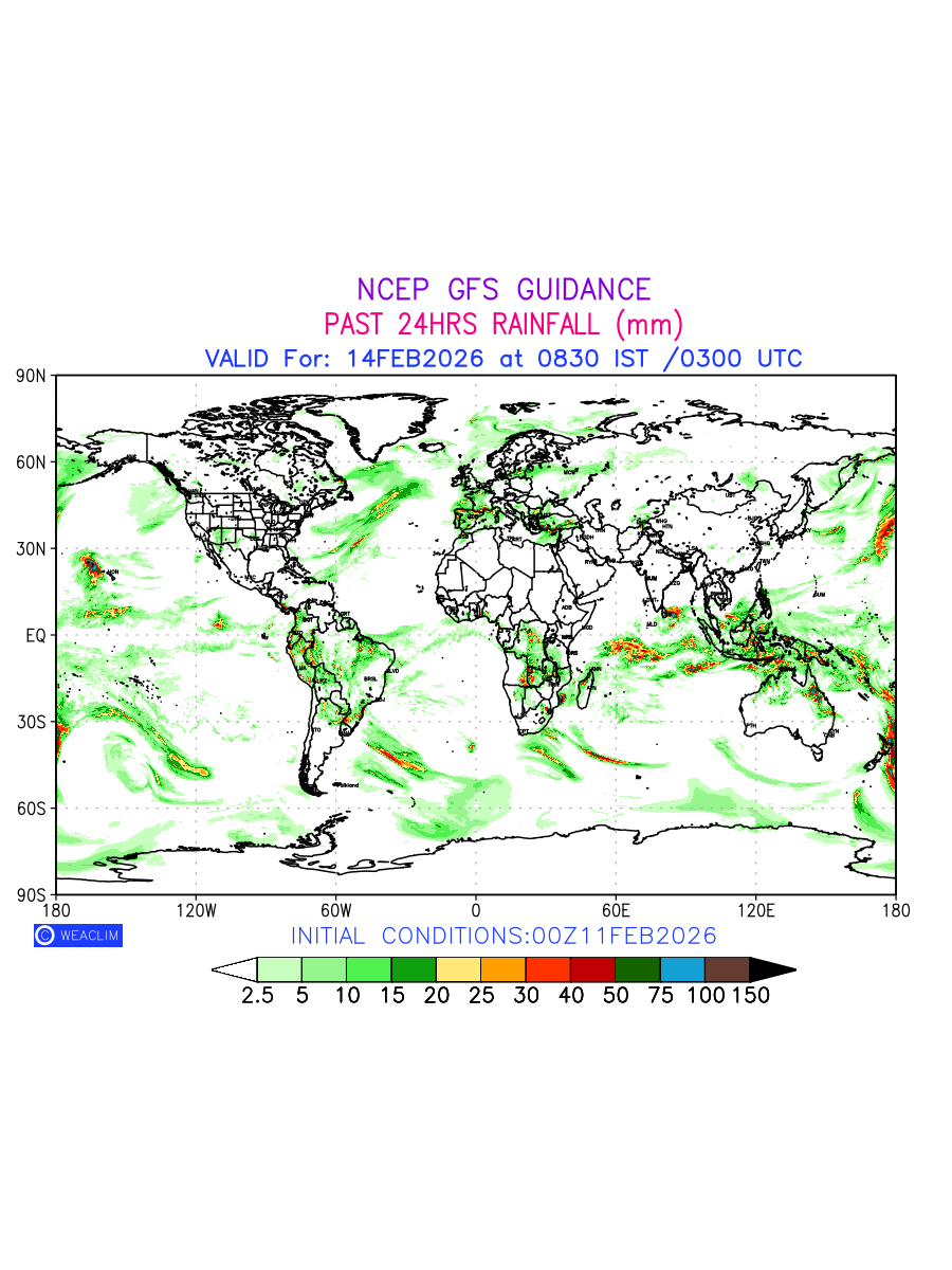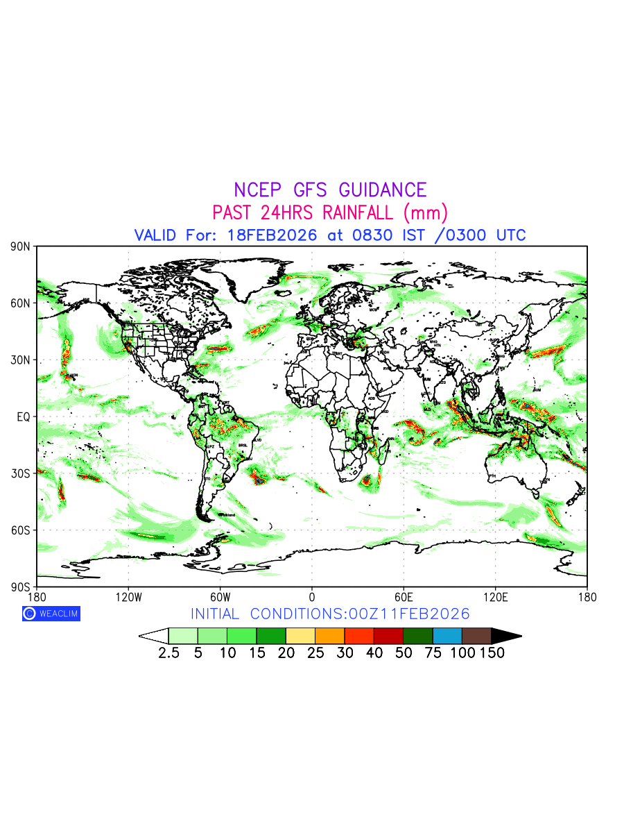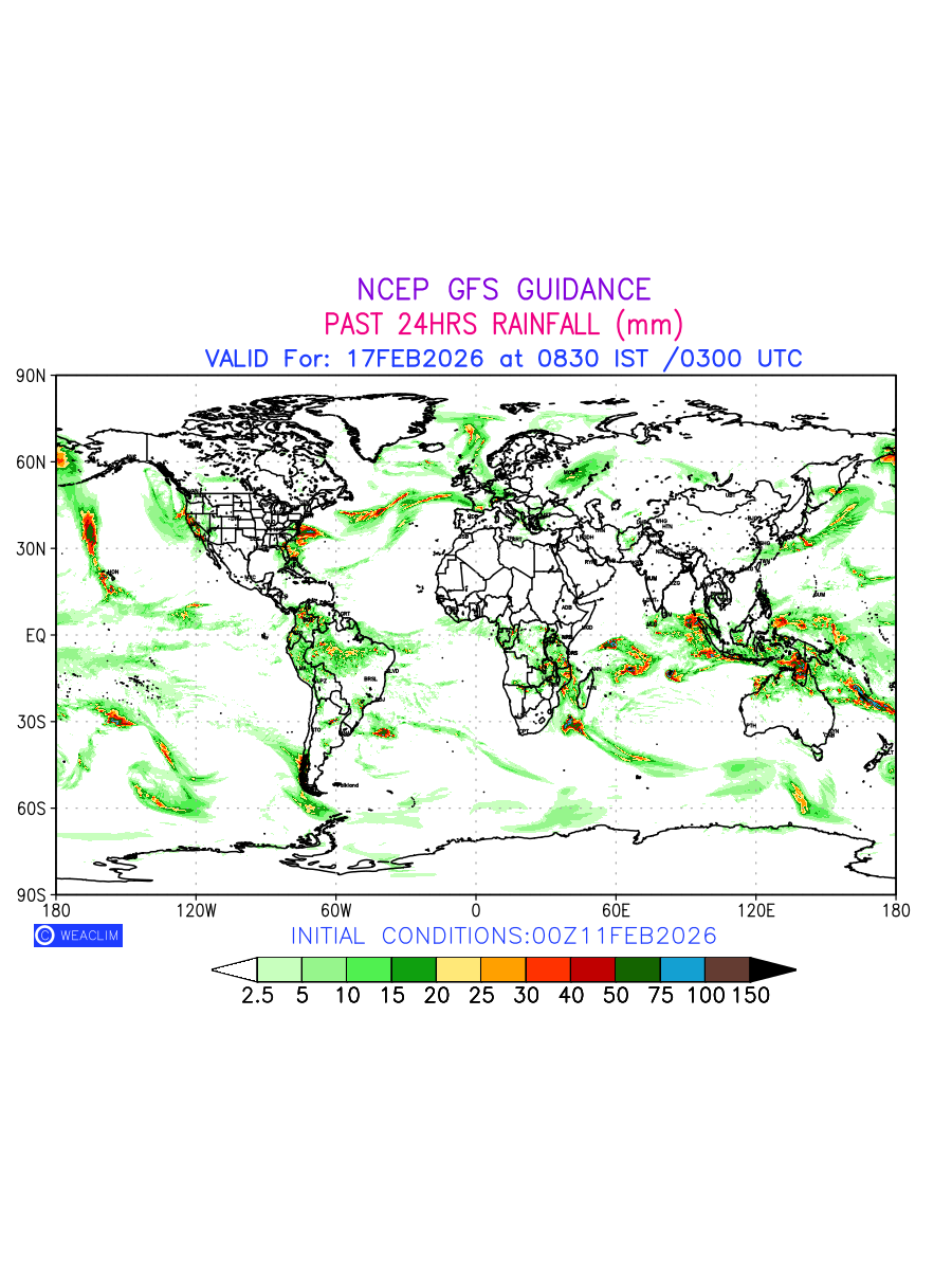 Rainfall forecast for 24 hours for entire World is expected amount of precipitation in millimeters for a given area over a time period of 24 hours and valid from 0300 UTC (0830 IST) of the previous date to 0300 UTC of the required date. This prediction enables the users to plan/review their tasks that are affected by rainfall related severe weather events that may lead to flooding, drought, snowfall and avalanche etc.