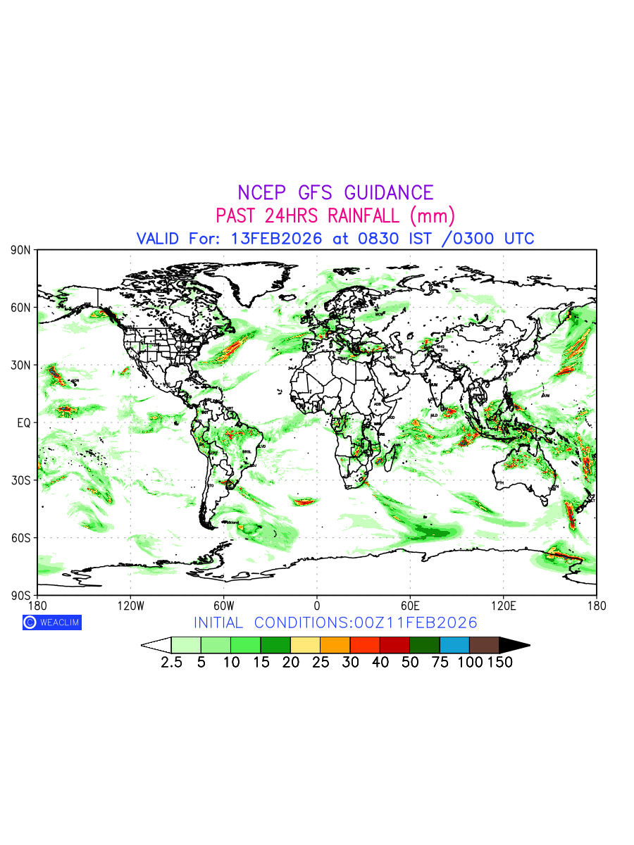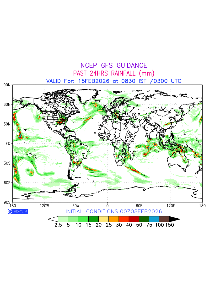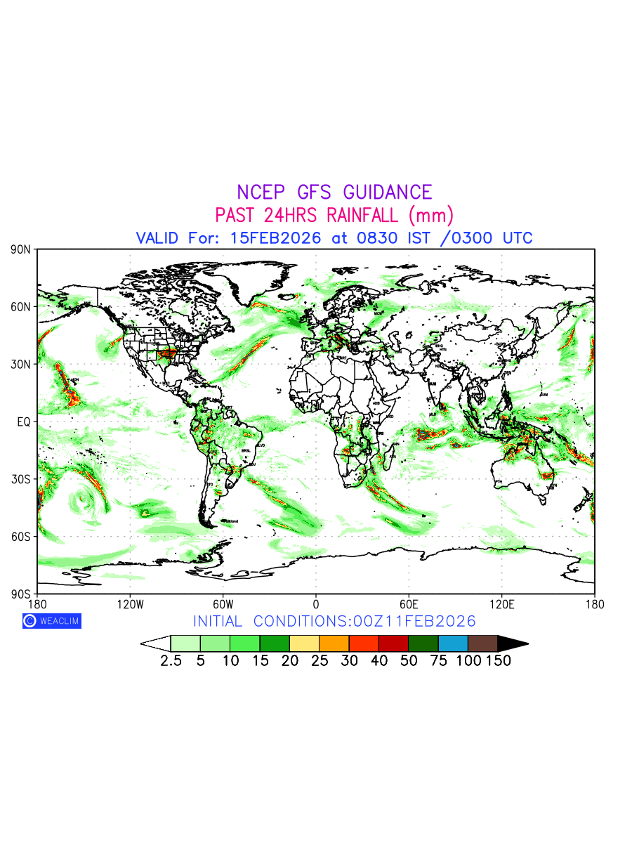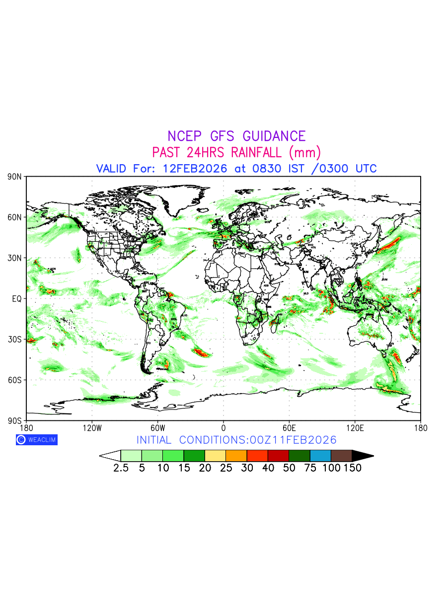 Rainfall forecast for 24 hours for entire World is expected amount of precipitation in millimeters for a given area over a time period of 24 hours and valid from 0300 UTC (0830 IST) of the previous date to 0300 UTC of the required date. This prediction enables the users to plan/review their tasks that are affected by rainfall related severe weather events that may lead to flooding, drought, snowfall and avalanche etc.