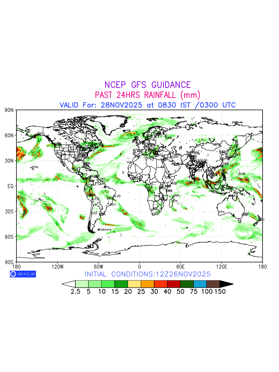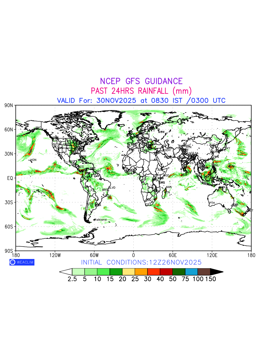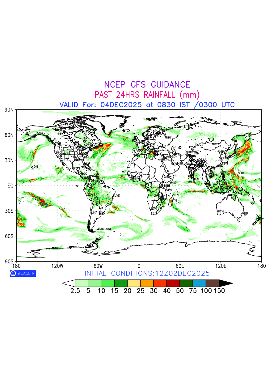Rainfall forecast for 24 hours for entire World is expected amount of precipitation in millimeters for a given area over a time period of 24 hours and valid from 0300 UTC (0830 IST) of the previous date to 0300 UTC of the required date. This prediction enables the users to plan/review their tasks that are affected by rainfall related severe weather events that may lead to flooding, drought, snowfall and avalanche etc.
