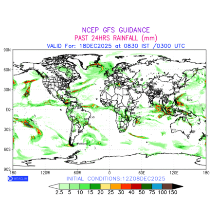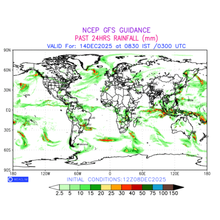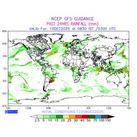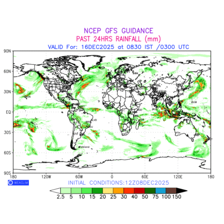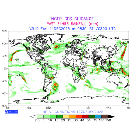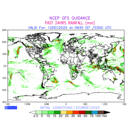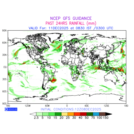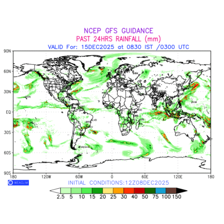 Rainfall forecast for 24 hours for entire World is expected amount of precipitation in millimeters for a given area over a time period of 24 hours and valid from 0300 UTC (0830 IST) of the previous date to 0300 UTC of the required date. This prediction enables the users to plan/review their tasks that are affected by rainfall related severe weather events that may lead to flooding, drought, snowfall and avalanche etc.