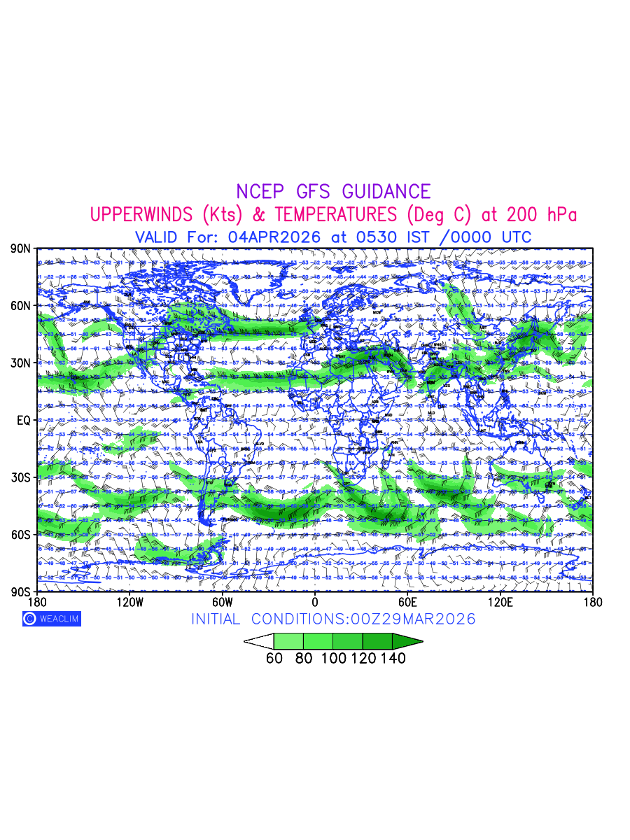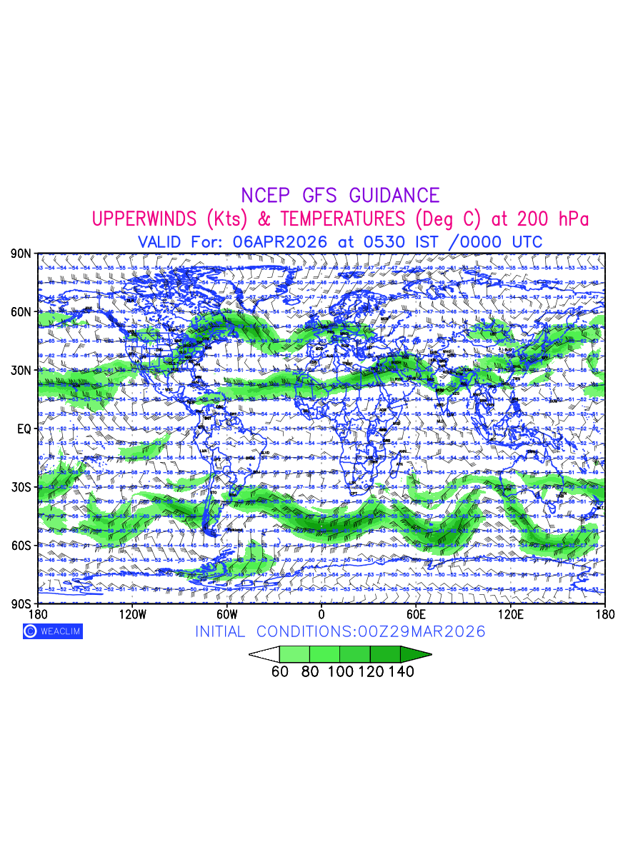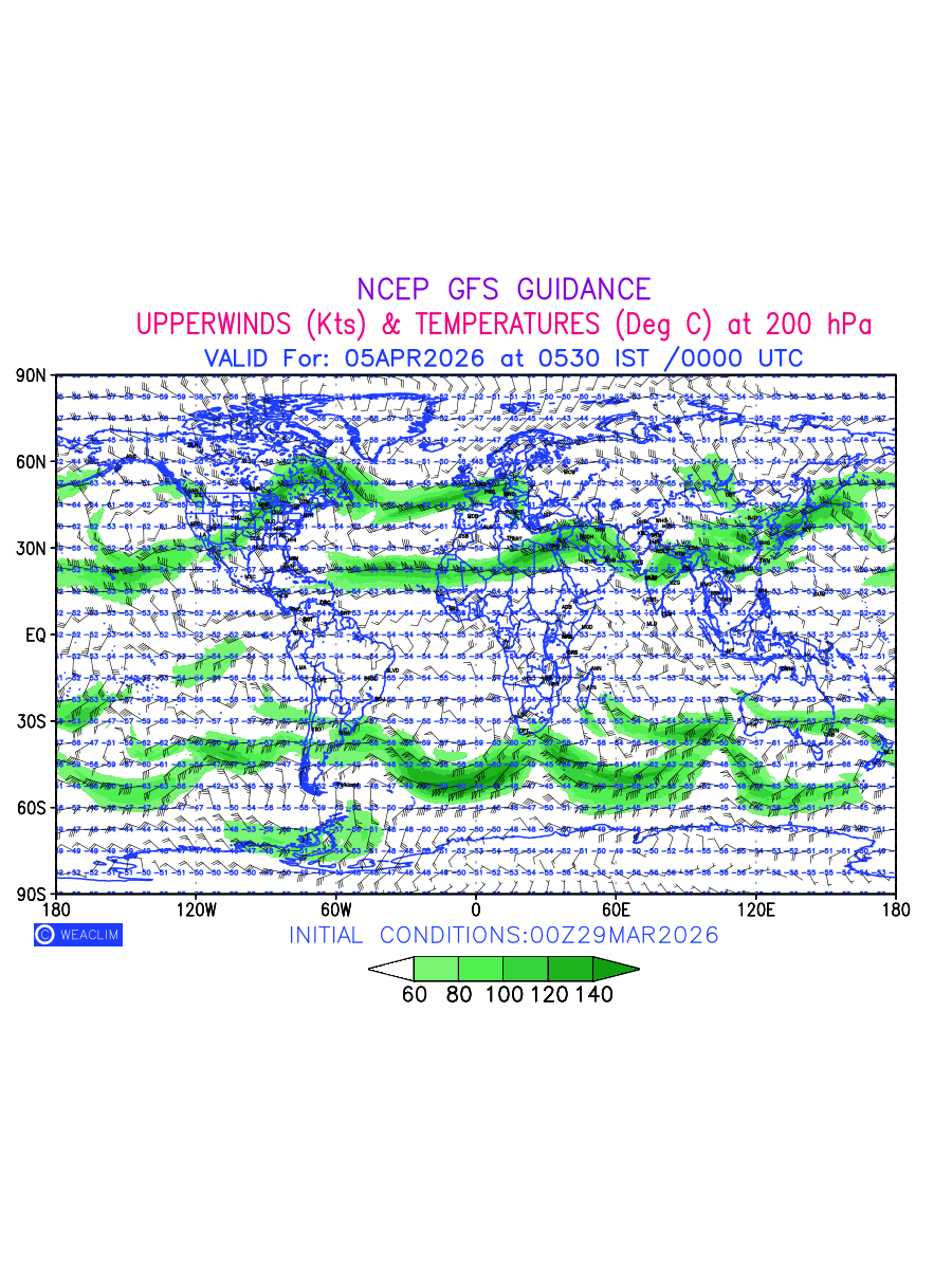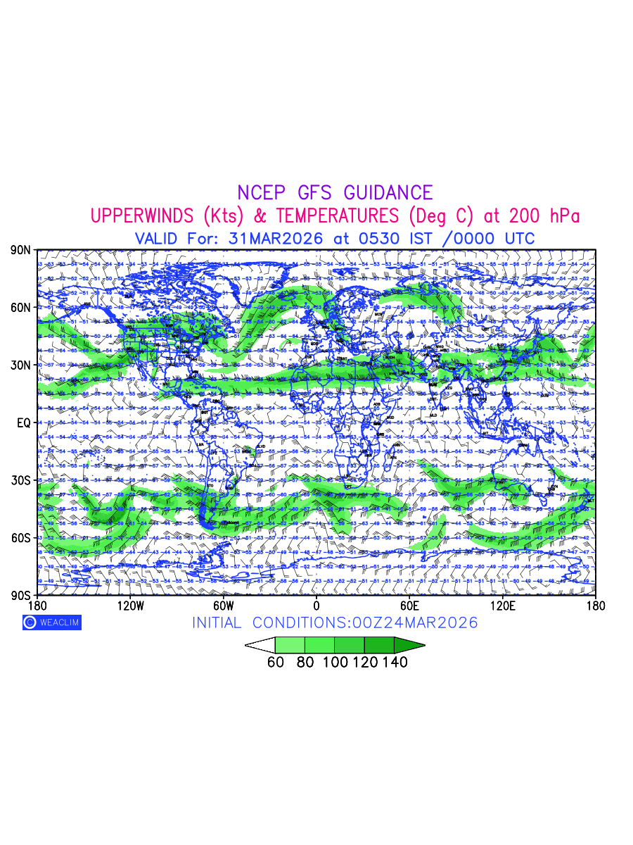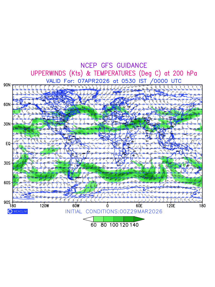 Winds at 200 hPa at the 24th hour for World refers to the predicted wind direction and speed at a pressure level of 200 hPa, which is located in the upper troposphere (approximately 12 Km or 7.5 miles above the Earths surface). The winds are presented knots (kt), and the direction is given in degrees from true north. ‘Jet Streams’ are marked in shades of green for winds with magnitude of more than 60 kt is a narrow band of high-speed winds that can influence weather patterns over large areas. The depiction also shows the temperature along with the wind barb on the grid points at 200 hPa. Along with the wind speed (kt) and direction, upper air temperatures (Deg C) are also shown at the grid points over the Entire World at 200 hPa level for the next ten days.