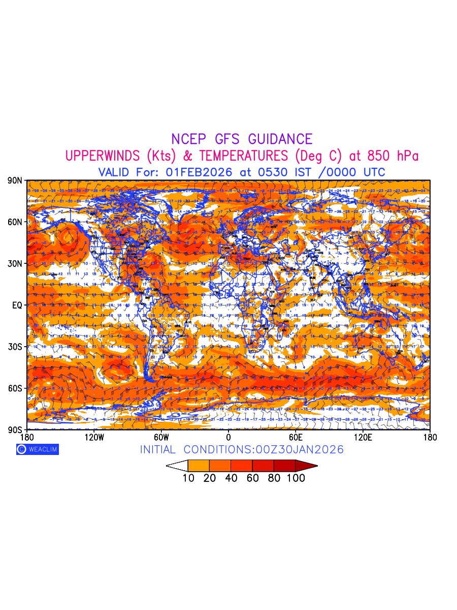 Winds at 850 hPa at the 24th hour for entire World refers to the predicted wind direction and speed at a pressure level of 850 hPa, which is located in the lower troposphere (1,500 meters or 5,000 feet above the earth’s surface). The winds are presented in knots (kt), and the direction is given in degrees from true north. Winds with magnitude of more than 20 kt are marked in shades of red. Being close to the Earth’s surface it is strongly influenced by surface features such as mountains, valleys, and bodies of water. It gives insight into the strength and direction of wind flow in the lower troposphere, affecting the movement of weather systems and the transport of heat, moisture, and pollutants in the atmosphere. Depiction also shows the temperature along with the wind barb on the grid points at 850 hPa. Along with the wind speed (kt) and direction, upper air temperatures (Deg C) are also shown at the grid points over the Entire World at 850 hPa level for the next ten days.