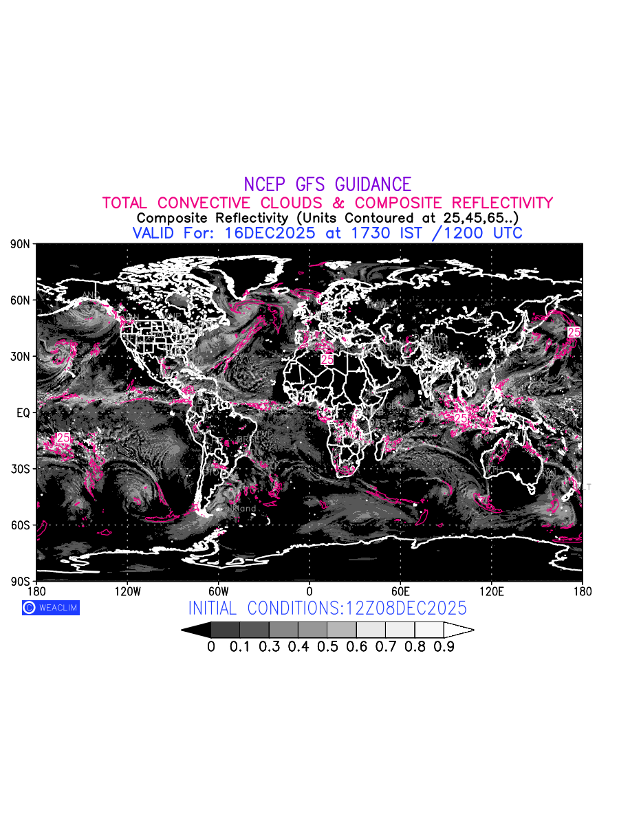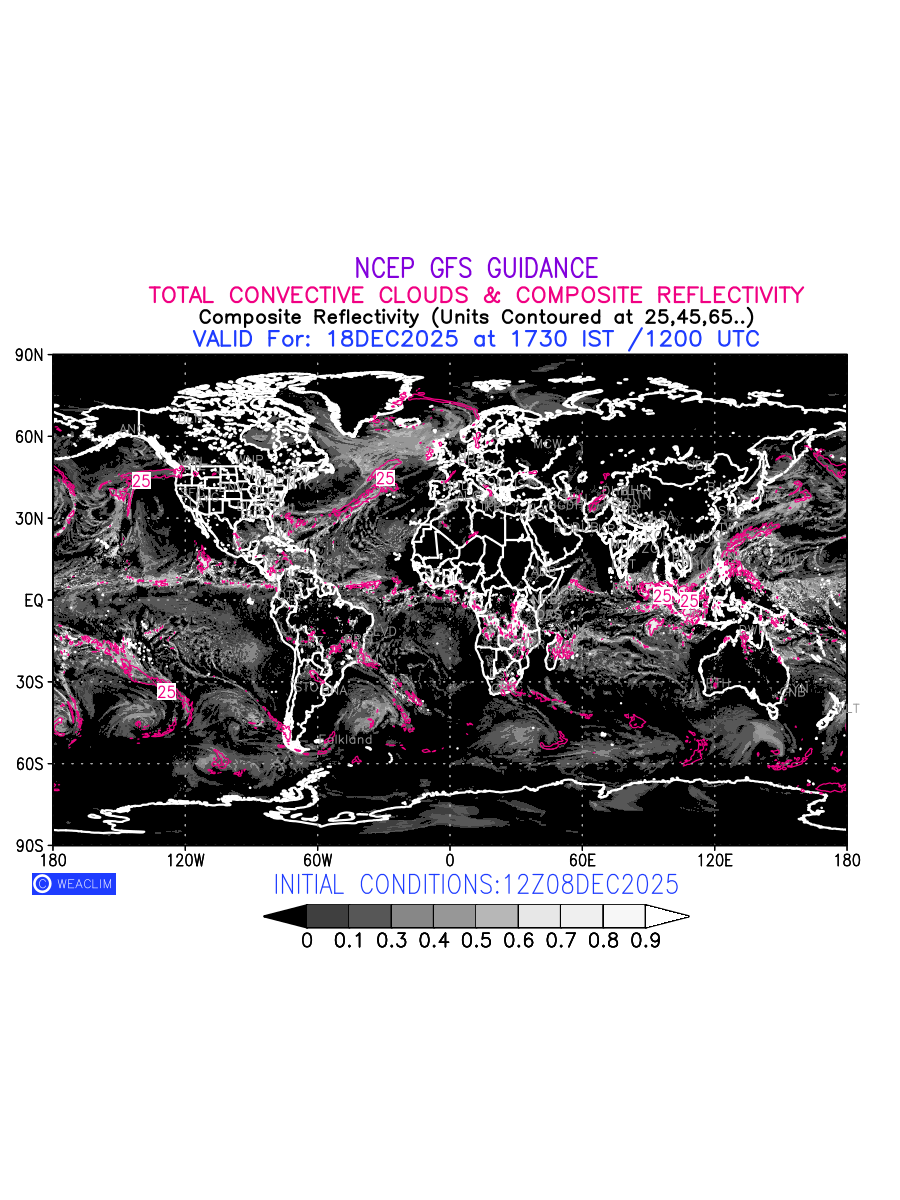 Convective clouds are formed by the vertical movement of air in the atmosphere and are associated with thunderstorms and other types of severe weather like intense rainfall, strong gusty winds etc. Shades from black to white on scale of 0 to 1 with whiter shade depicting more intensity of convection has been used in the depiction. Also shown is the Composite Reflectivity that takes the maximum reflectivity from each elevation angle of the Doppler Weather Radar and meshes it into one image. Advantage of this type of image is the ability to quickly assess the intensity of storms. Predicted pattern of Total Convective Clouds and percentage of the sky covered by them is shown here along with Composite Reflectivity over the entire World for the next ten days.