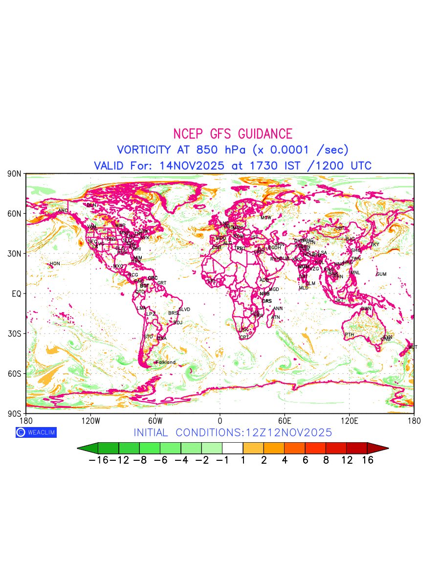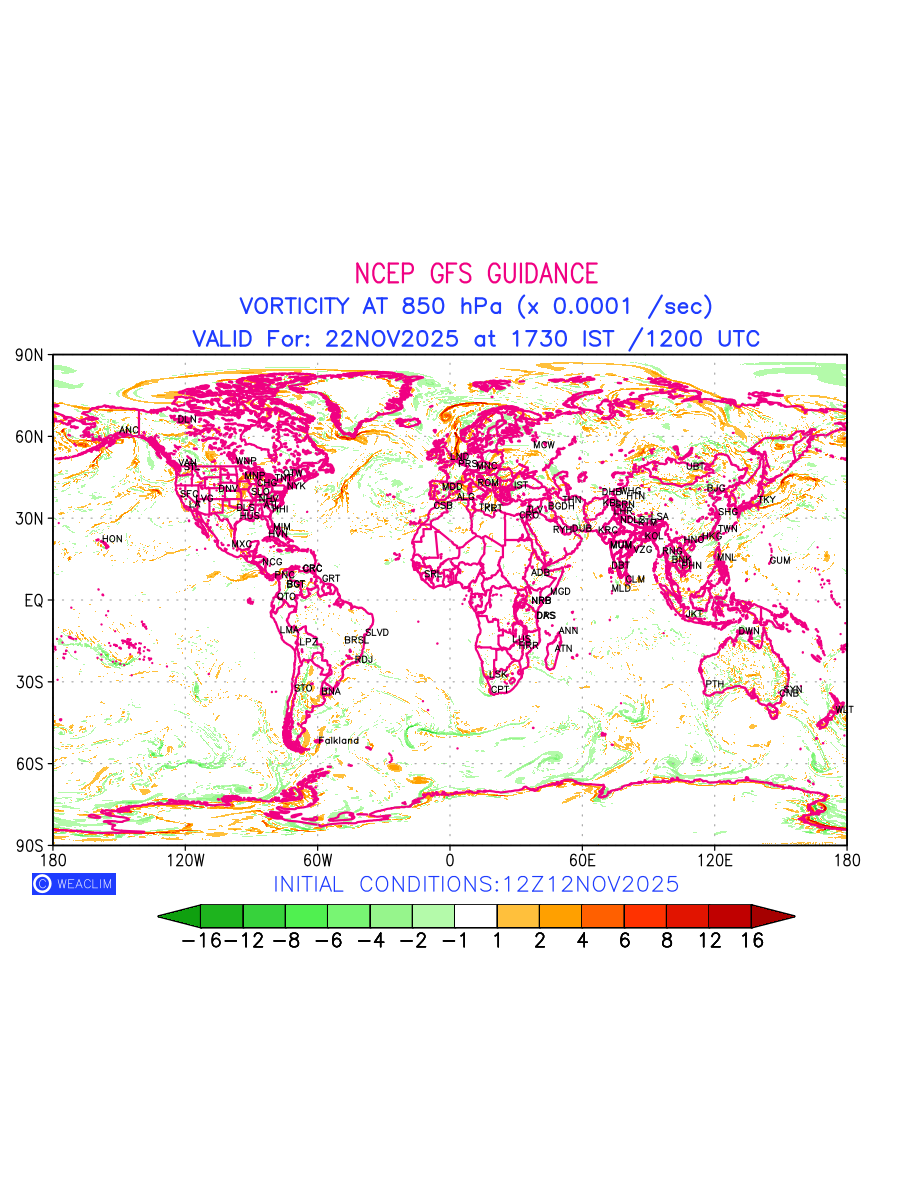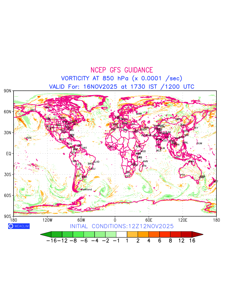 Low Level Convergence at the 24th hour for entire World is the graphical representation of the expected magnitude and pattern of horizontal rotation (or the vorticity) of atmosphere around a vertical axis or the vorticity at 850hPa (1.5km). In northern hemisphere it is typically displayed with warm colors ranging from shades of red (to yellow) indicating positive vorticity (cyclonic rotation), and cool colors shades of green (to blue) indicating negative vorticity (anticyclonic rotation). They are useful tools for identifying areas of high and low vorticity, associated with weather systems such as fronts, lows, and highs etc.