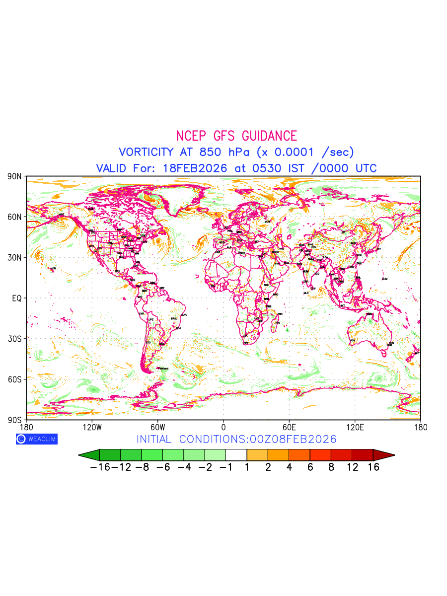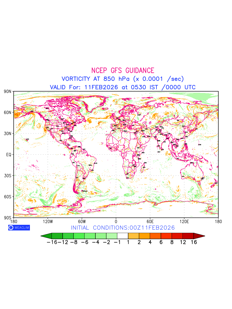 Low Level Convergence at the 24th hour for entire World is the graphical representation of the expected magnitude and pattern of horizontal rotation (or the vorticity) of atmosphere around a vertical axis or the vorticity at 850hPa (1.5km). In northern hemisphere it is typically displayed with warm colors ranging from shades of red (to yellow) indicating positive vorticity (cyclonic rotation), and cool colors shades of green (to blue) indicating negative vorticity (anticyclonic rotation). They are useful tools for identifying areas of high and low vorticity, associated with weather systems such as fronts, lows, and highs etc.