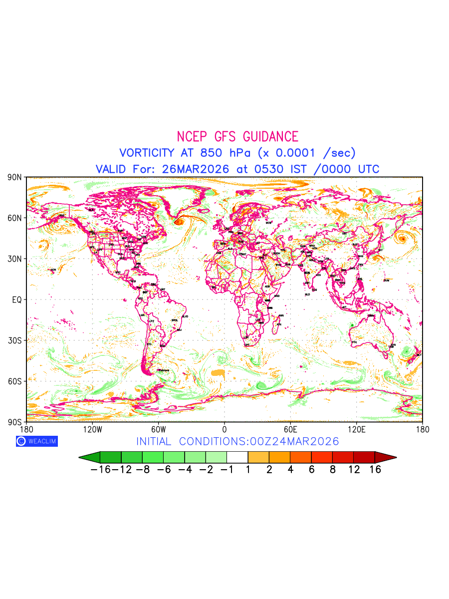 Low Level Convergence at the 24th hour for entire World is the graphical representation of the expected magnitude and pattern of horizontal rotation (or the vorticity) of atmosphere around a vertical axis or the vorticity at 850hPa (1.5km). In northern hemisphere it is typically displayed with warm colors ranging from shades of red (to yellow) indicating positive vorticity (cyclonic rotation), and cool colors shades of green (to blue) indicating negative vorticity (anticyclonic rotation). They are useful tools for identifying areas of high and low vorticity, associated with weather systems such as fronts, lows, and highs etc.