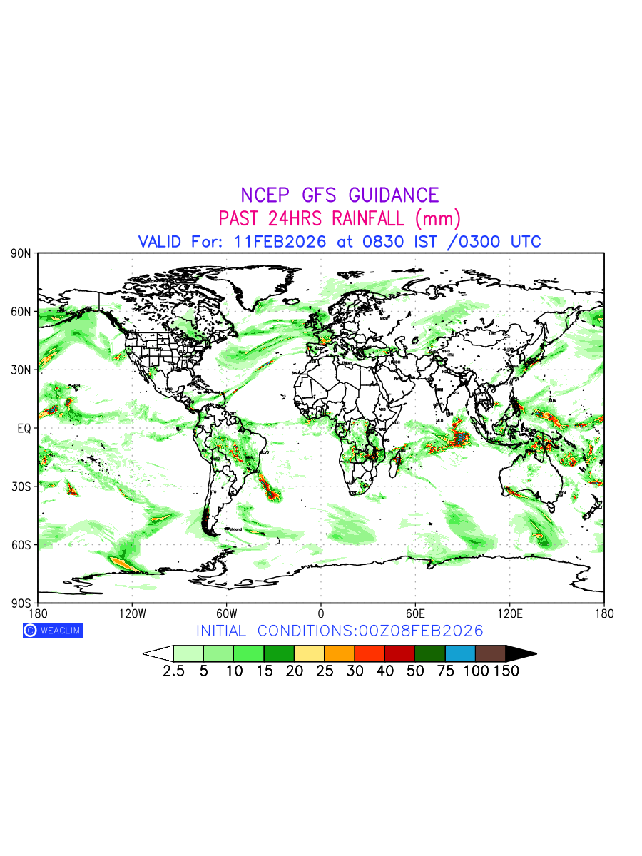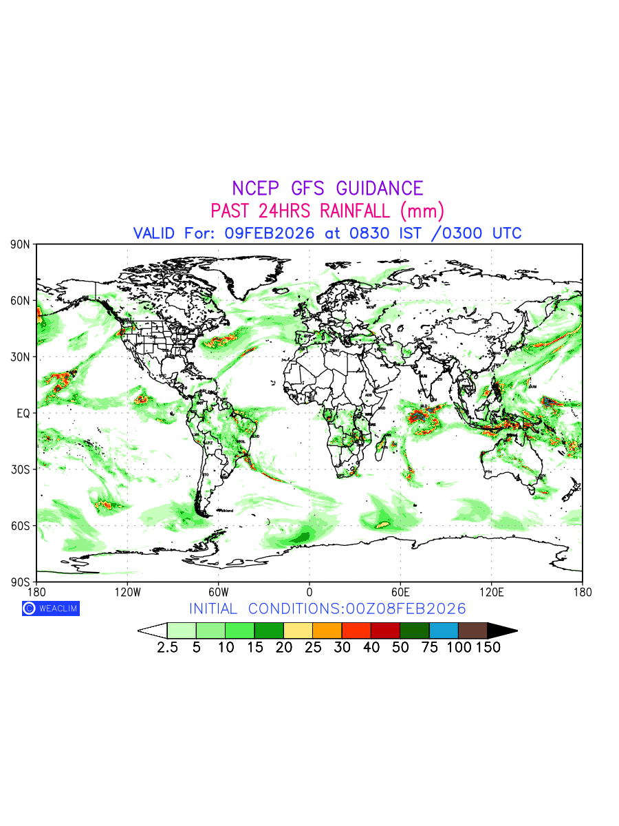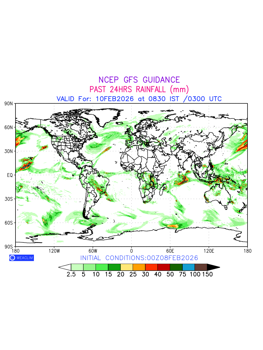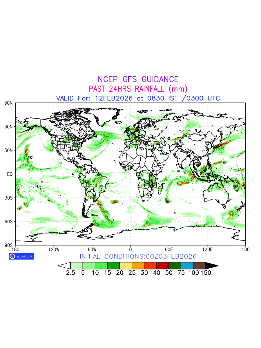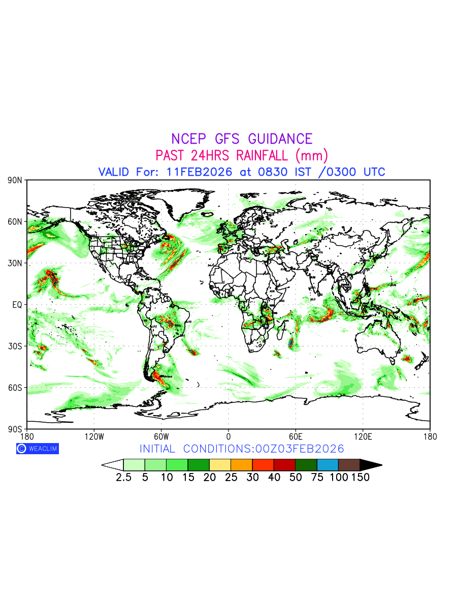 Rainfall forecast for 24 hours for entire World is expected amount of precipitation in millimeters for a given area over a time period of 24 hours and valid from 0300 UTC (0830 IST) of the previous date to 0300 UTC of the required date. This prediction enables the users to plan/review their tasks that are affected by rainfall related severe weather events that may lead to flooding, drought, snowfall and avalanche etc.