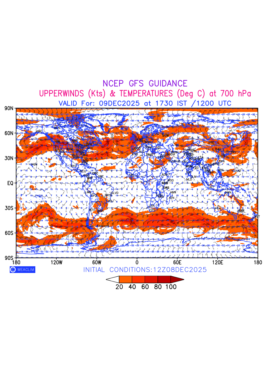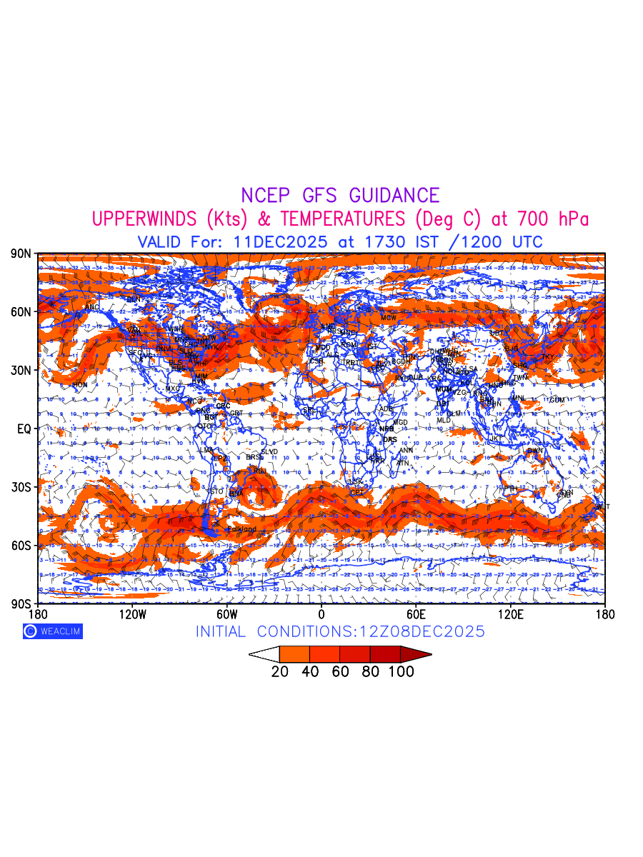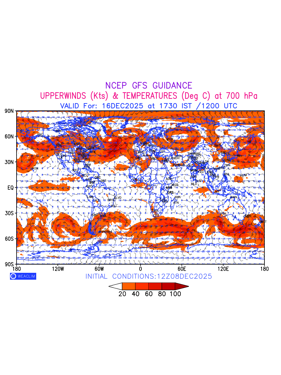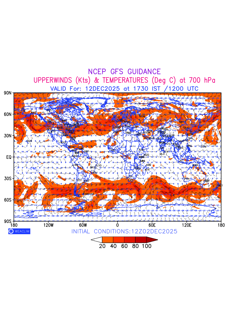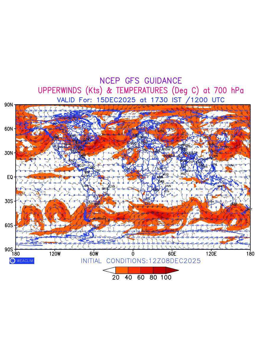 Winds at 700 hPa at the 24th hour for entire World refers to the predicted wind direction and speed at a pressure level of 700 hPa, which is located in the middle troposphere (approximately 3,000 meters or 10,000 feet above the Earths surface). The winds are presented in knots (kt), and the direction is given in degrees from true north.Winds with magnitude of more than 20 kt are marked in shades of red. At this level, the wind speed and direction can influence the movement and development of weather systems such as storms, fronts, and high-pressure systems. The depiction also shows the temperature along with the wind barb on the grid points at 700 hPa. Along with the wind speed (kt) and direction, upper air temperatures (Deg C) are also shown at the grid points over the Entire World at 700 hPa level for the next ten days.
