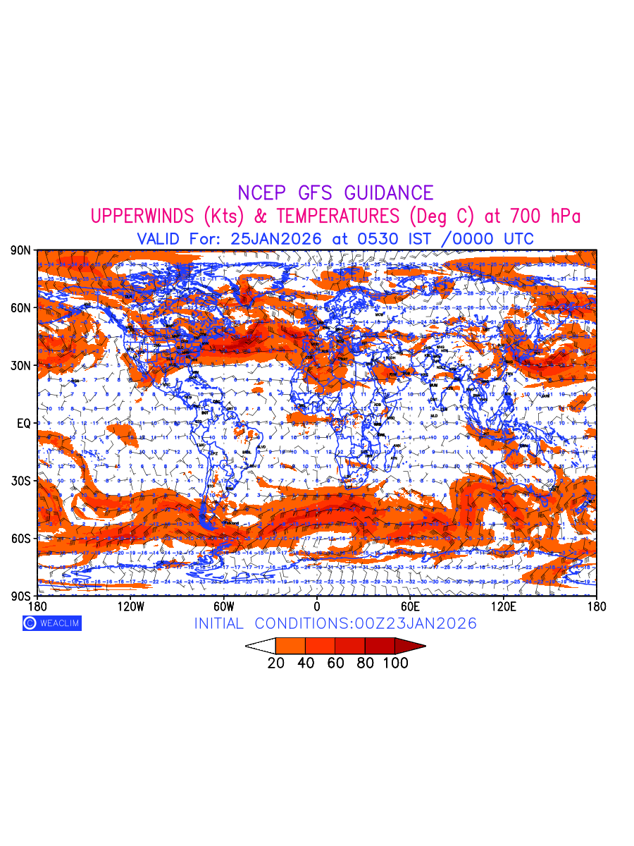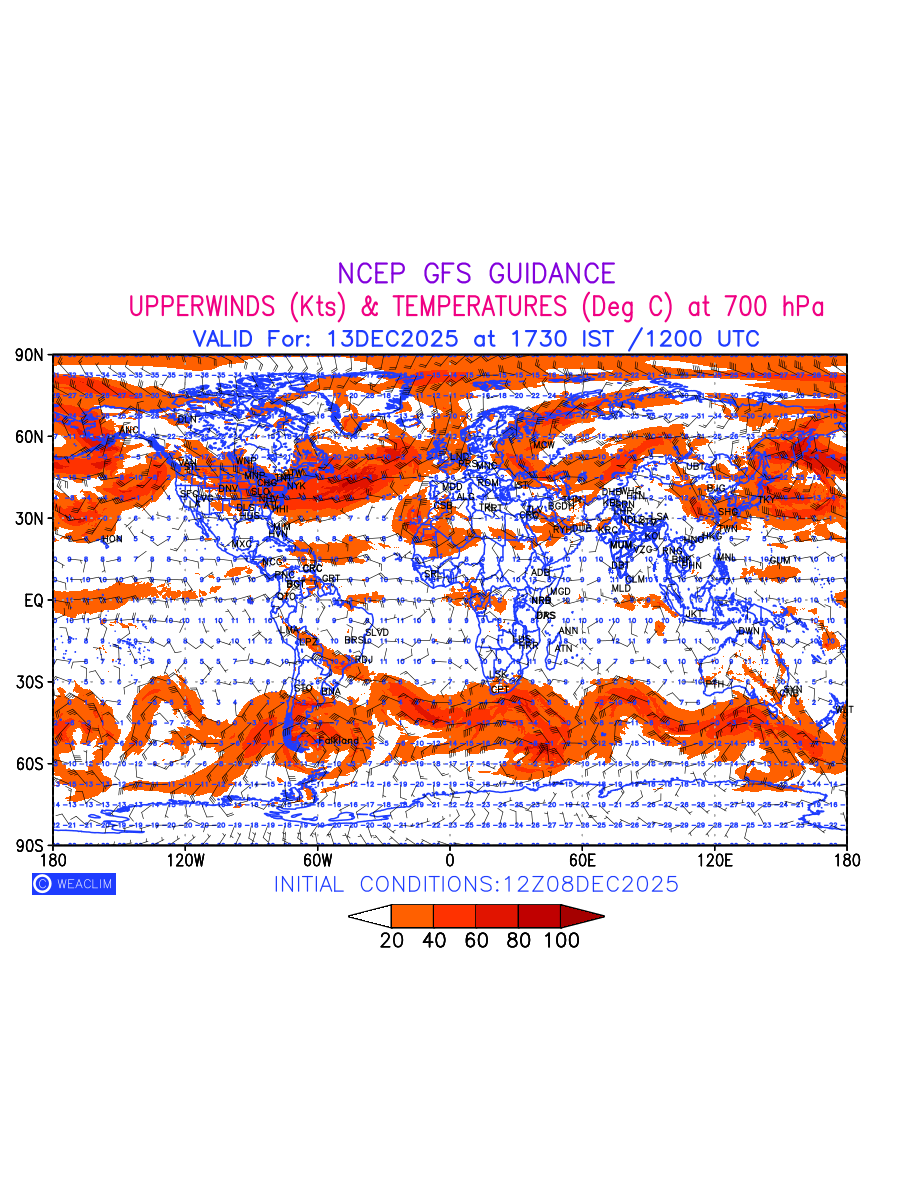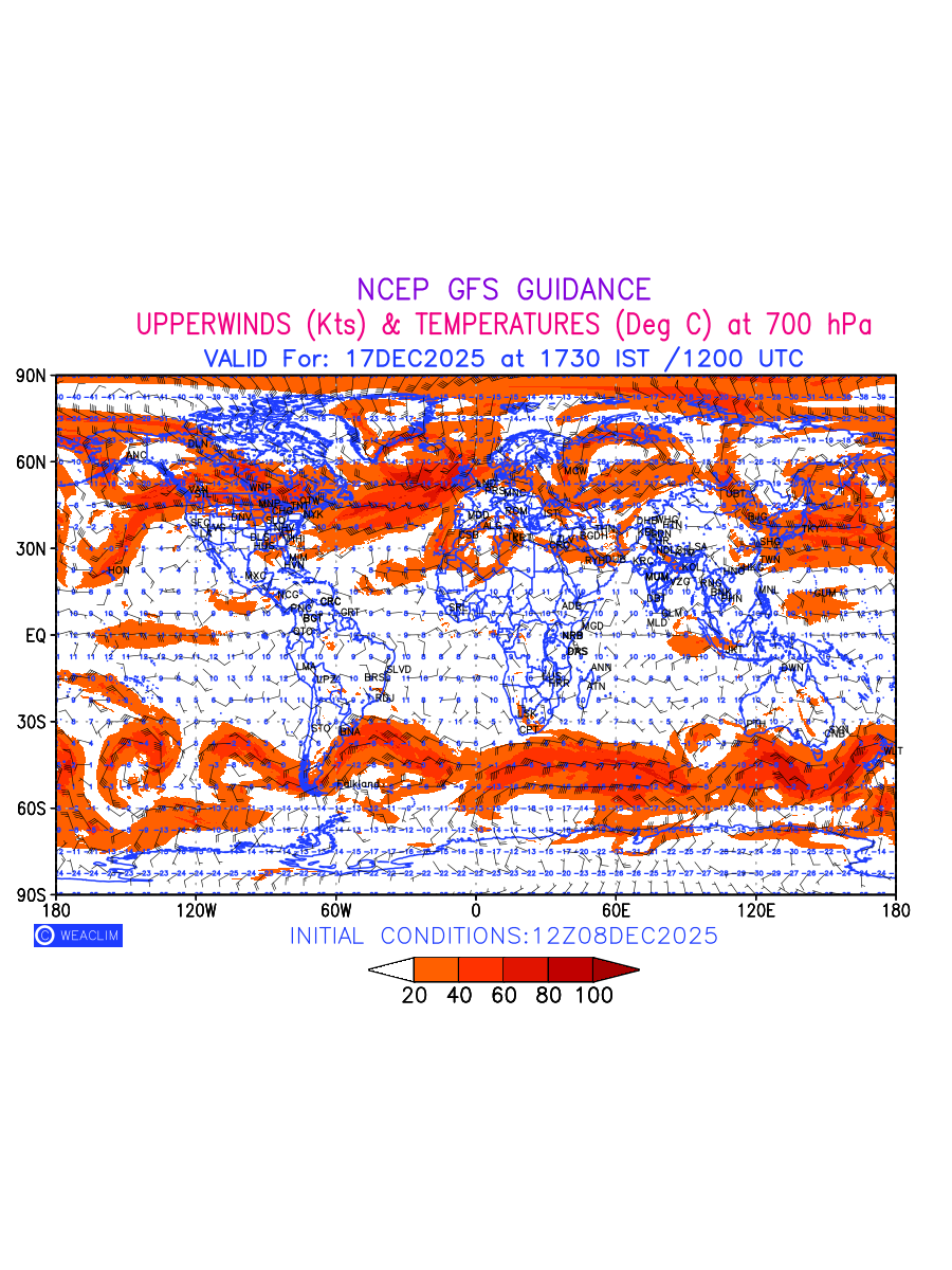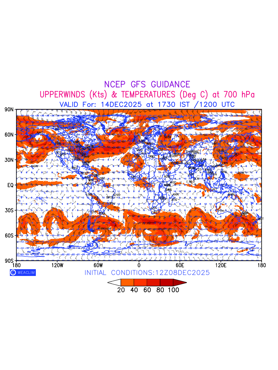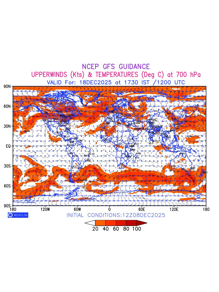 Winds at 700 hPa at the 24th hour for entire World refers to the predicted wind direction and speed at a pressure level of 700 hPa, which is located in the middle troposphere (approximately 3,000 meters or 10,000 feet above the Earths surface). The winds are presented in knots (kt), and the direction is given in degrees from true north.Winds with magnitude of more than 20 kt are marked in shades of red. At this level, the wind speed and direction can influence the movement and development of weather systems such as storms, fronts, and high-pressure systems. The depiction also shows the temperature along with the wind barb on the grid points at 700 hPa. Along with the wind speed (kt) and direction, upper air temperatures (Deg C) are also shown at the grid points over the Entire World at 700 hPa level for the next ten days.