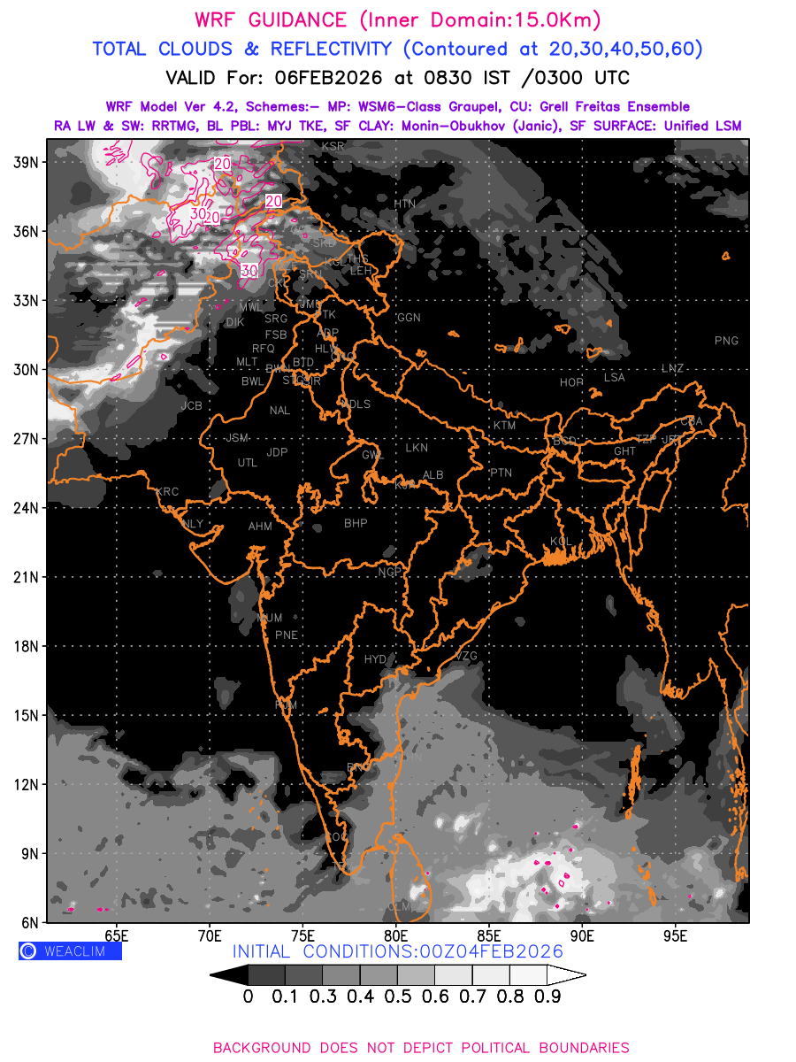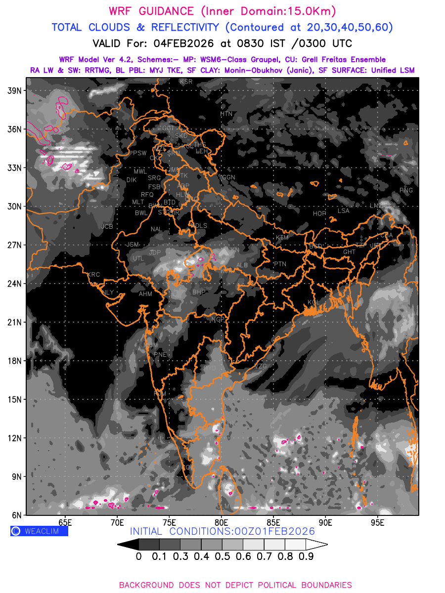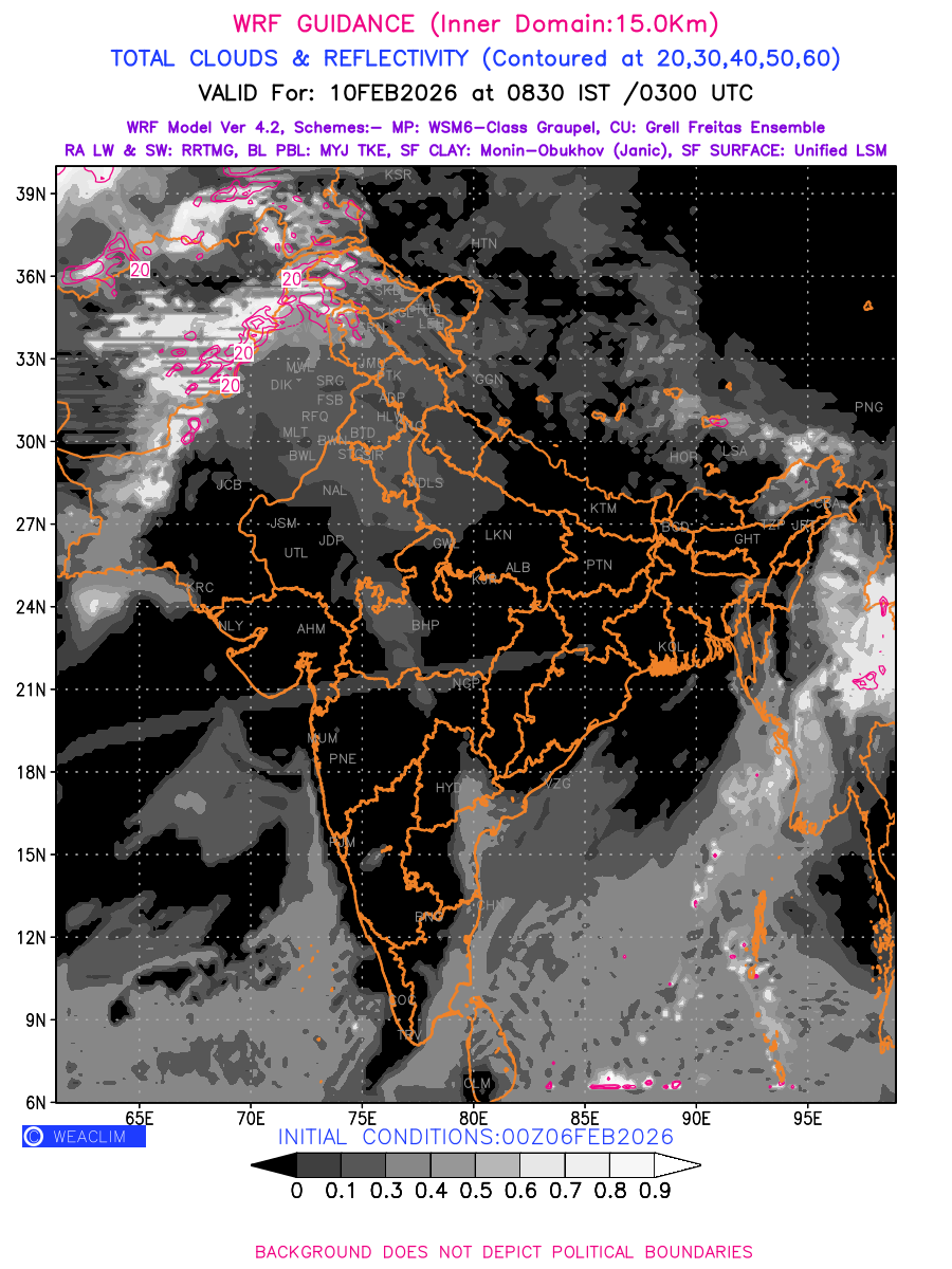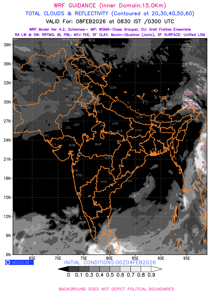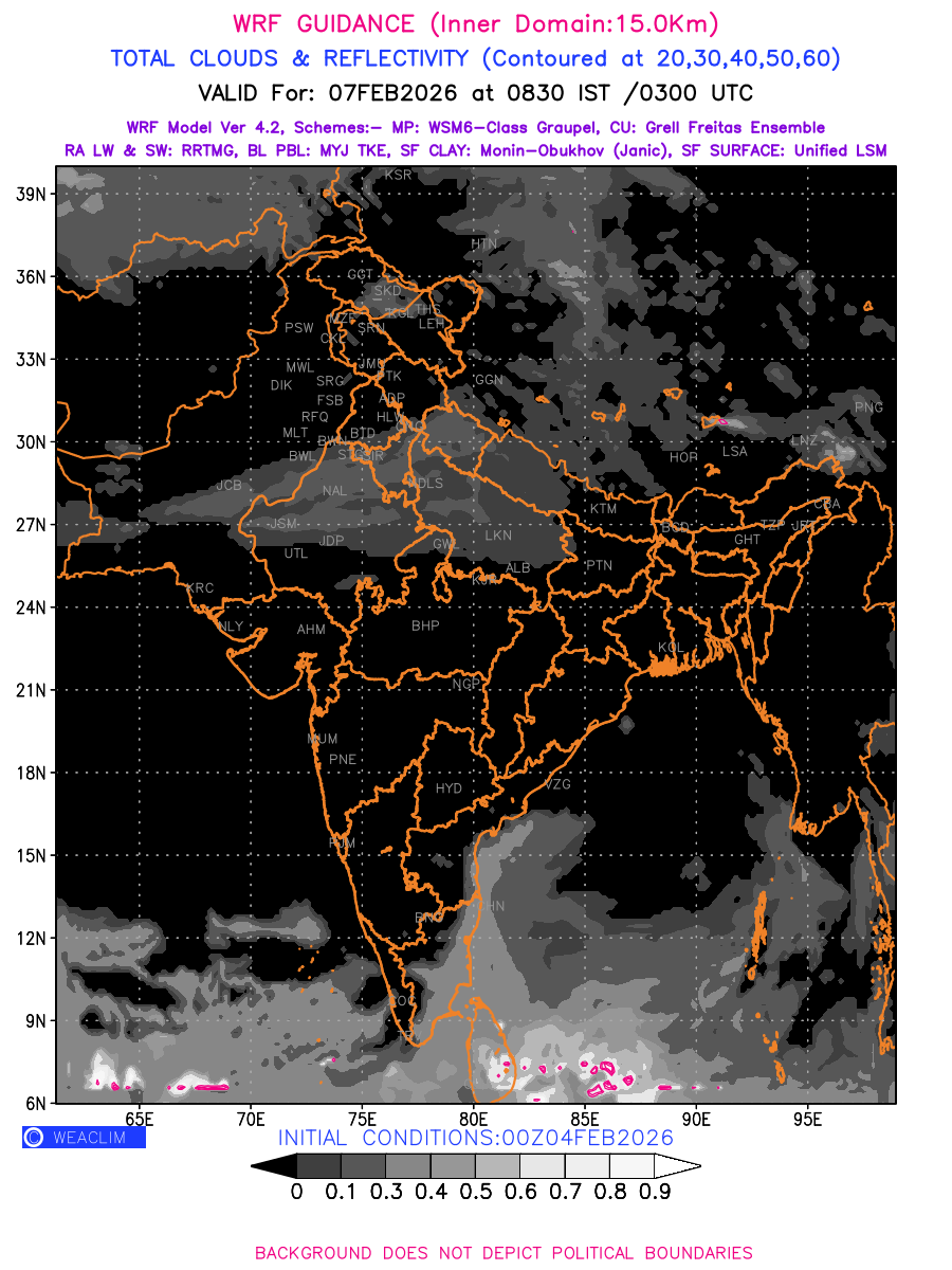 Cloud forecast at the 24 th hour generated using WRF Ver 4.2 at a resolution of 15 Km for India is the predicted pattern of clouds and percentage of the sky covered by them akin to an InfraRed Imagery given by the meteorological satellites. Convective clouds are formed by the vertical movement of air in the atmosphere and are associated with thunderstorms and other types of severe weather like intense rainfall, strong gusty winds, low clouds etc. The charts use shading from black to white with whiter shade depicting more intensity of convection on a scale ranging between 0 to 1. Also shown is the Maximum Reflectivity that takes the maximum reflectivity from each elevation angle of the Doppler Weather Radar and meshes it into one image. Advantage of this type of image is the ability to quickly assess the intensity of storms. Predicted pattern of Total Clouds and percentage of the sky covered by them is shown here along with Maximum Reflectivity over the Indian Region for the next four days.