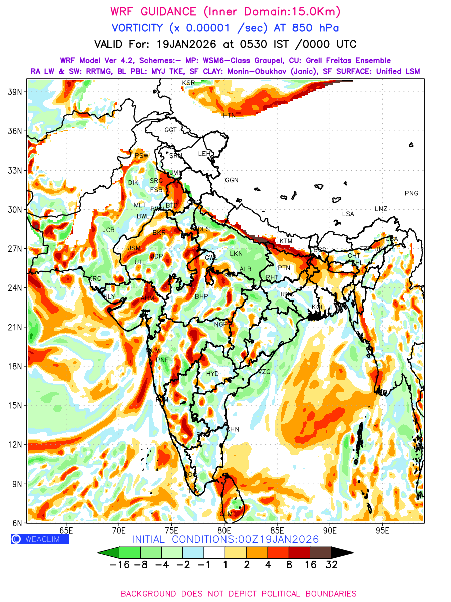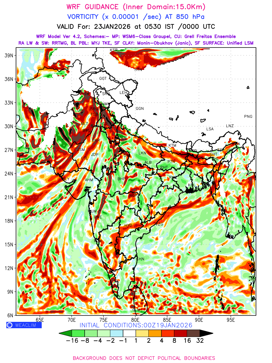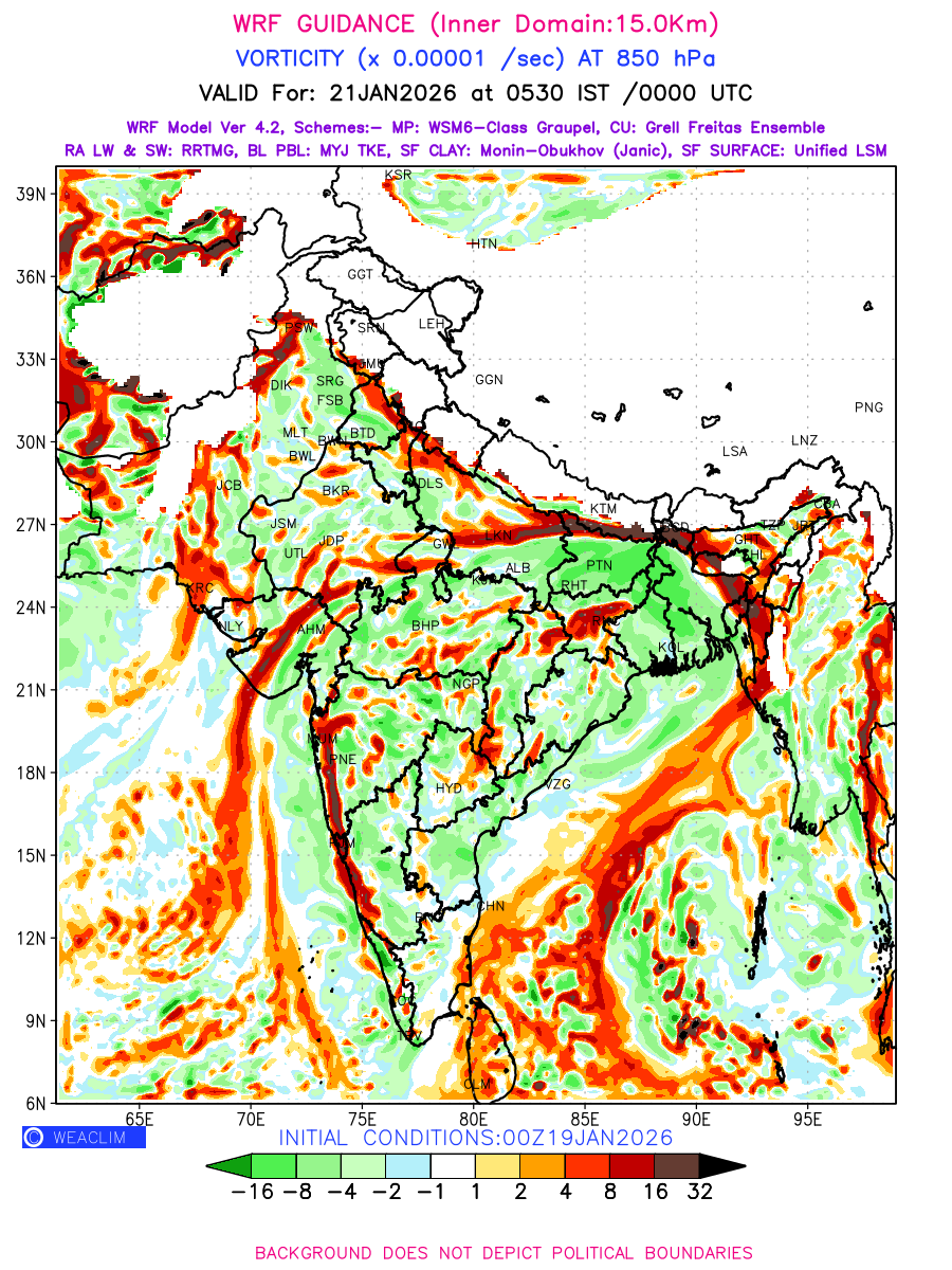 Low Level Convergence at the 24 th hour generated using WRF Ver 4.2 at a resolution of 15 Km for India is the graphical representation of the expected magnitude and pattern of horizontal rotation (or the vorticity) of atmosphere around a vertical axis or the vorticity at 850 hPa (1.5km). It is typically displayed with warm colors ranging from shades of red (to yellow) indicating positive vorticity (cyclonic rotation), and cool colors shades of green (to blue) indicating negative vorticity (anticyclonic rotation). They are useful in identifying areas of high and low vorticity, associated with weather systems such as fronts, lows, and highs etc.
