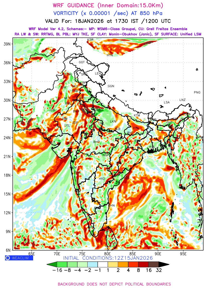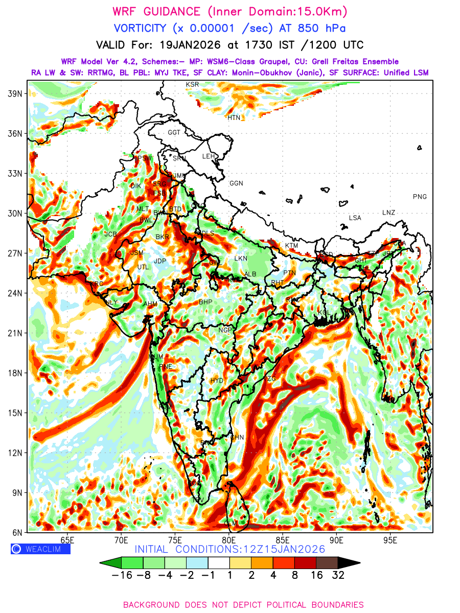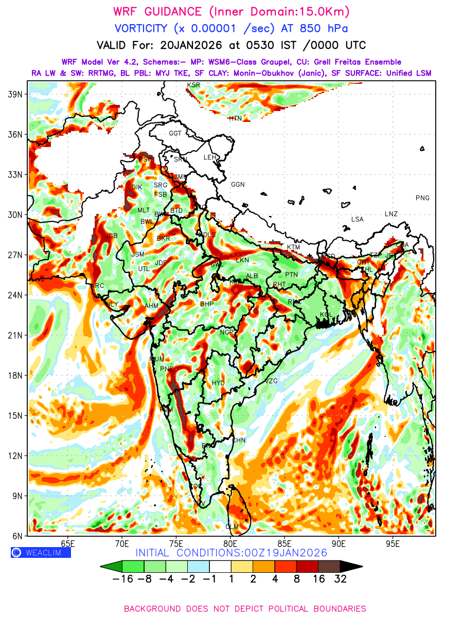 Low Level Convergence at the 24 th hour generated using WRF Ver 4.2 at a resolution of 15 Km for India is the graphical representation of the expected magnitude and pattern of horizontal rotation (or the vorticity) of atmosphere around a vertical axis or the vorticity at 850 hPa (1.5km). It is typically displayed with warm colors ranging from shades of red (to yellow) indicating positive vorticity (cyclonic rotation), and cool colors shades of green (to blue) indicating negative vorticity (anticyclonic rotation). They are useful in identifying areas of high and low vorticity, associated with weather systems such as fronts, lows, and highs etc.