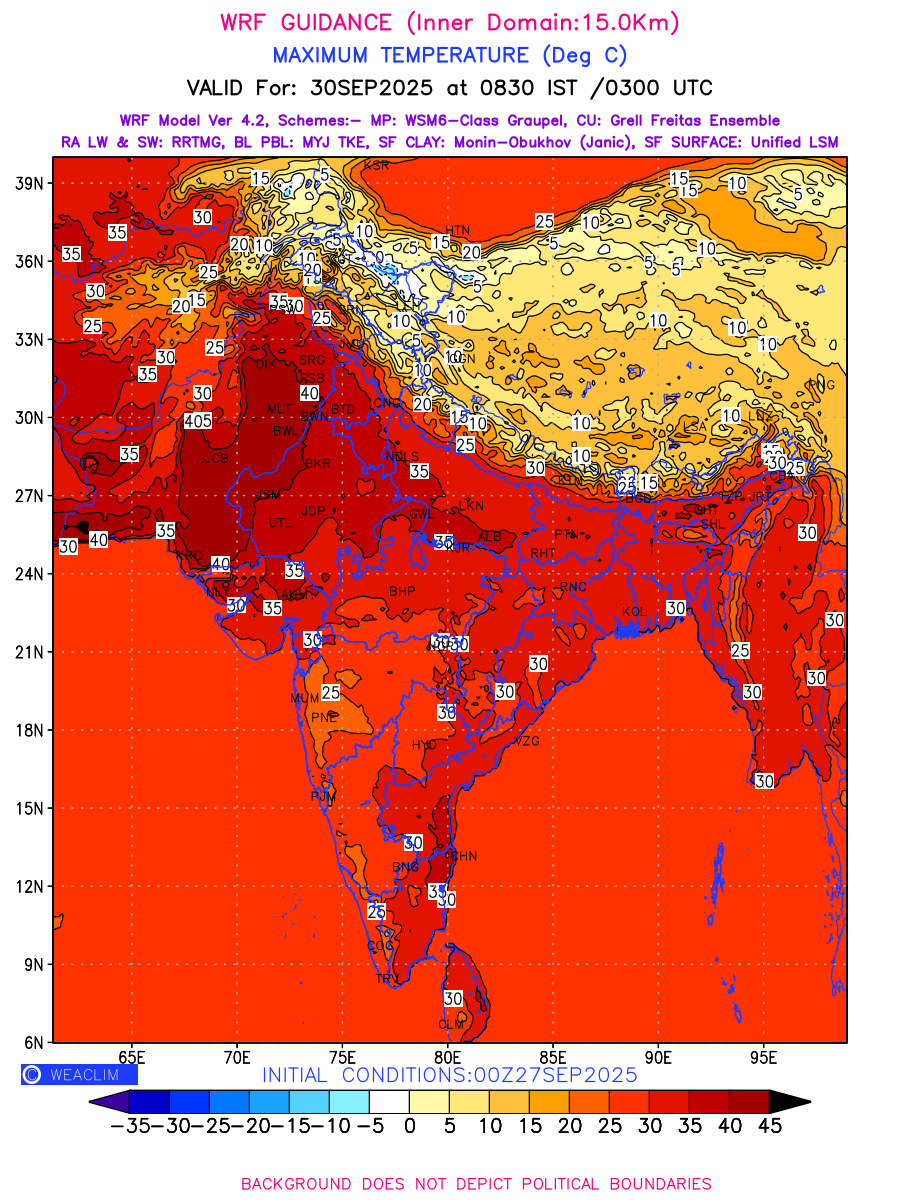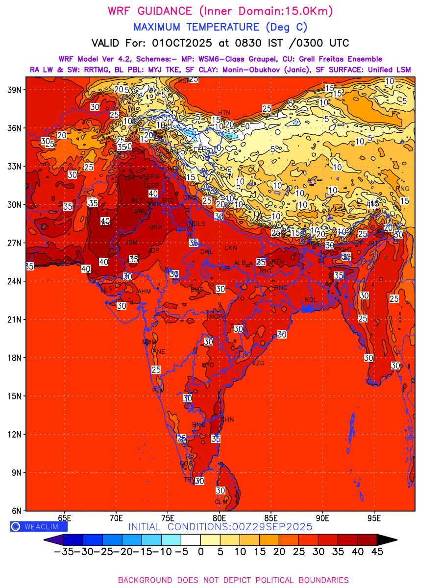 Maximum Temperature generated using WRF Ver 4.2 at a resolution of 15 Km for India depicts the highest temperatures at 2m above the ground surface between 0300 UTC of the previous date to 0300 UTC of the required date. This is an important variable for weather forecasting, as it determines the conditions at the Earth’s surface during the warmest part of the date, affecting human activities, agriculture, and the environment. 2m Temperature data can be used for a variety of applications, such as predicting the onset of heatwaves or cold spells, forecasting temperature trends, and studying the impact of weather on various systems and processes.