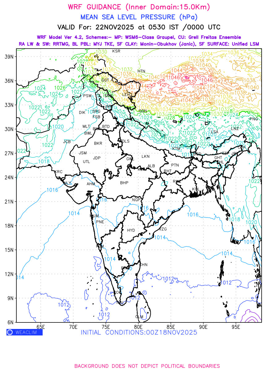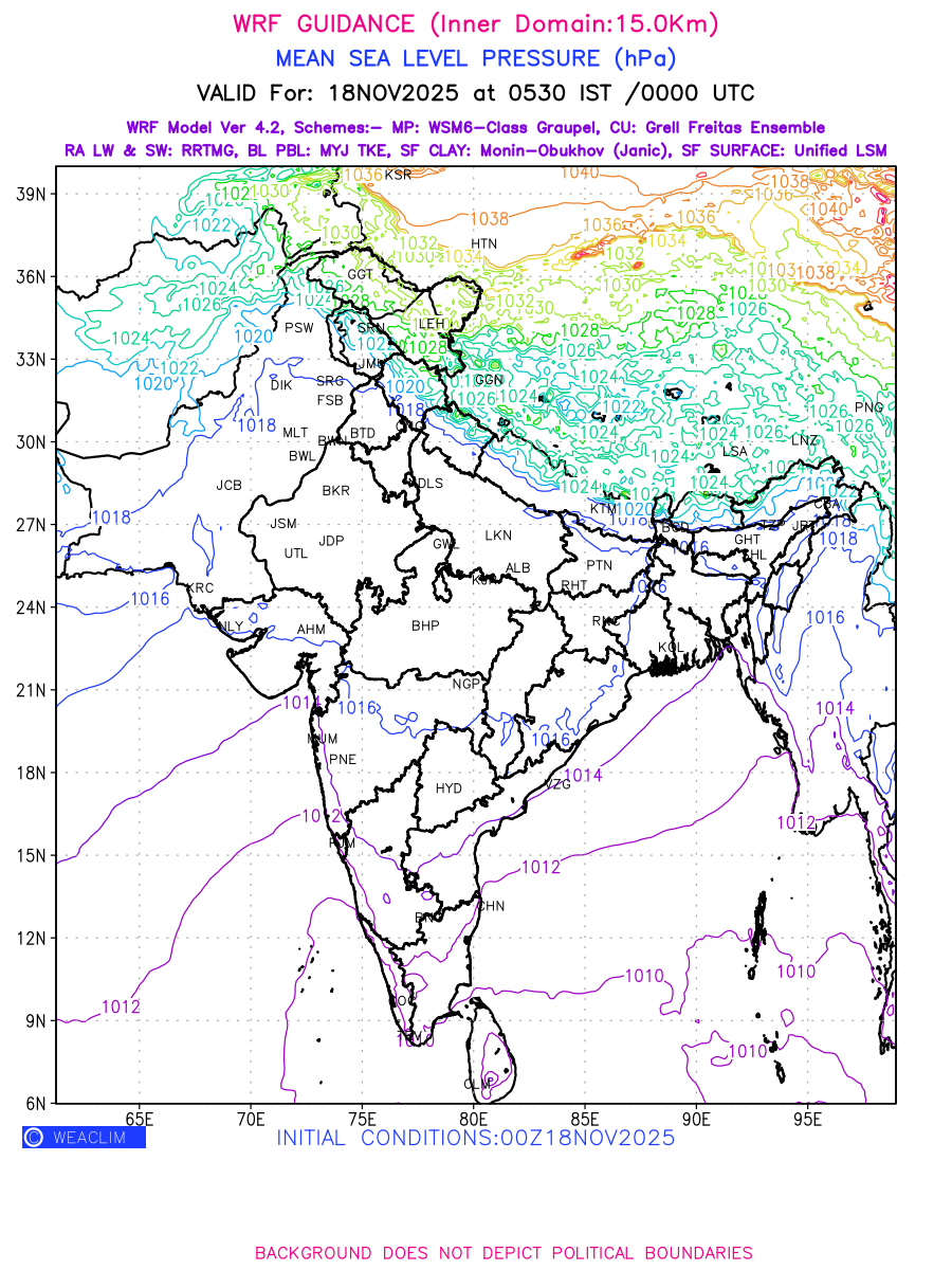 Mean Sea Level Pressure (MSLP) charts at the 24th hour generated using WRF Ver 4.2 at a resolution of 15 Km for India typically show a color-coded contour map of atmospheric pressure at sea level, with lines of equal pressure (isobars) indicating areas of high and low pressure over a geographic area. Meteorologists use these charts to identify areas of high and low pressure, which can give indications of storms, cold fronts, or warm fronts. The MSLP charts are also useful in identifying areas of convergence and divergence in the atmosphere, which can influence the formation or decay of weather systems.