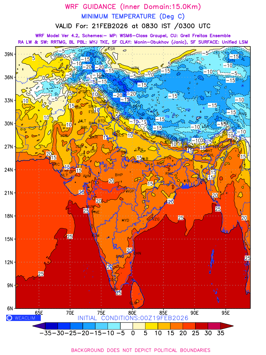Minimum Temperature generated using WRF Ver 4.2 at a resolution of 15 Km for India depicts the highest temperatures at 2m above the ground surface between 0300 UTC of the previous date to 0300 UTC of the required date. This is an important variable for weather forecasting, as it determines the conditions at the Earth’s surface during the coldest part of the date, affecting human activities, agriculture, and the environment. 2m Temperature data can be used for a variety of applications, such as predicting the onset of cold spells, forecasting temperature trends, and studying the impact of weather on various systems and processes.