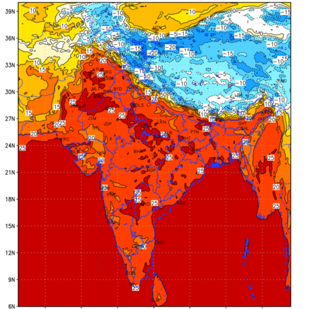 Minimum Temperature generated using WRF Ver 4.2 at a resolution of 15 Km for India depicts the highest temperatures at 2m above the ground surface between 0300 UTC of the previous date to 0300 UTC of the required date. This is an important variable for weather forecasting, as it determines the conditions at the Earth’s surface during the coldest part of the date, affecting human activities, agriculture, and the environment. 2m Temperature data can be used for a variety of applications, such as predicting the onset of cold spells, forecasting temperature trends, and studying the impact of weather on various systems and processes.
