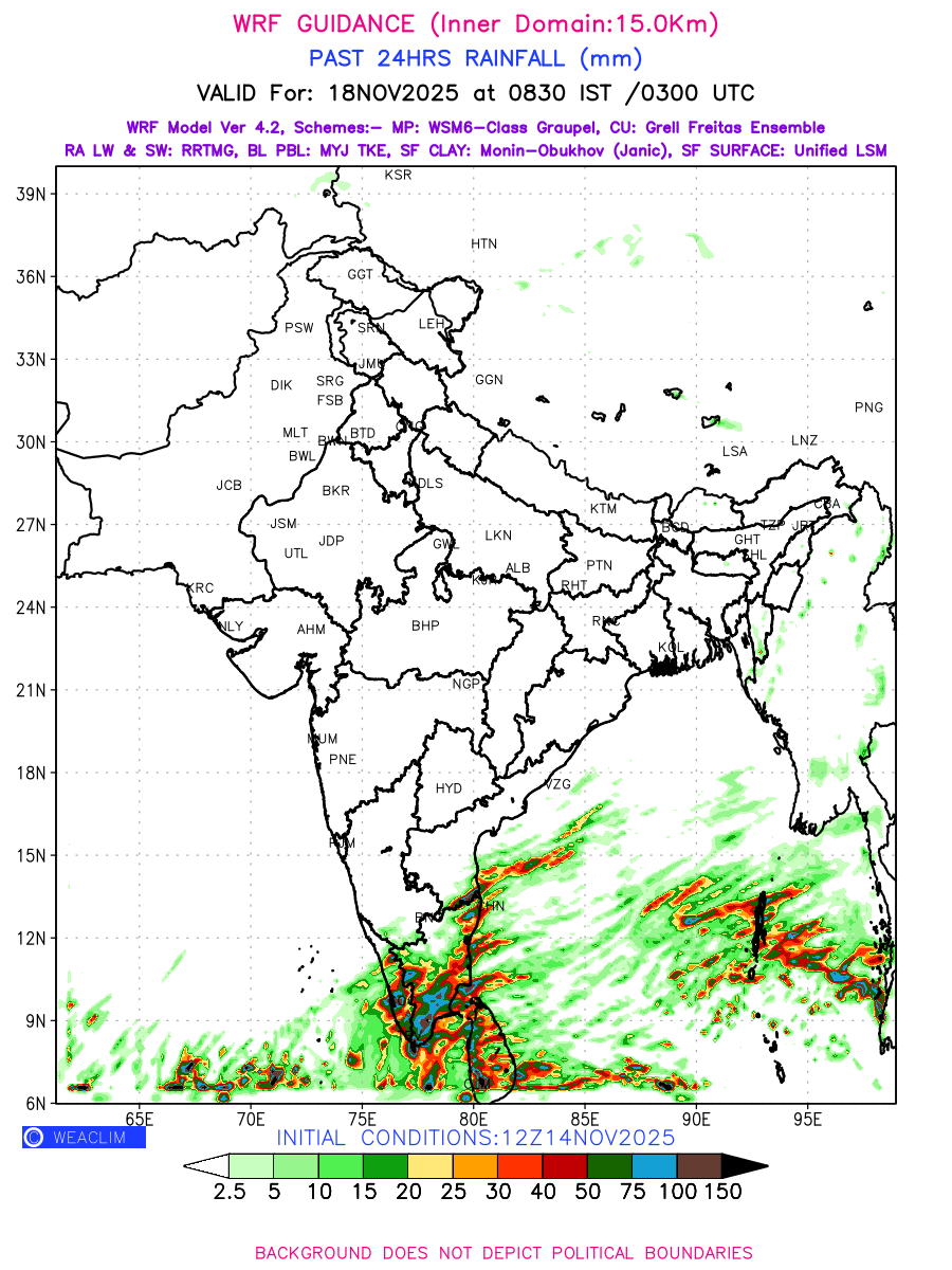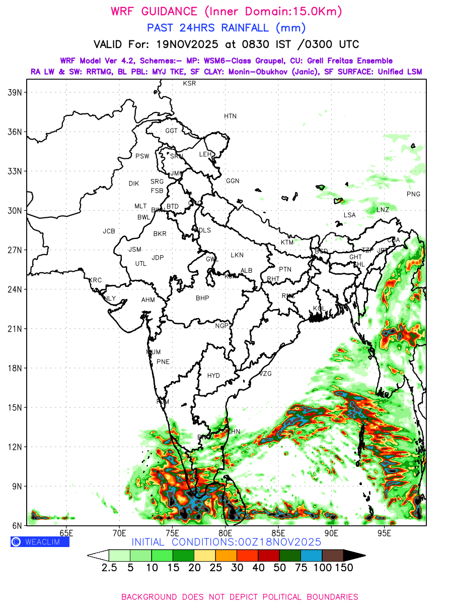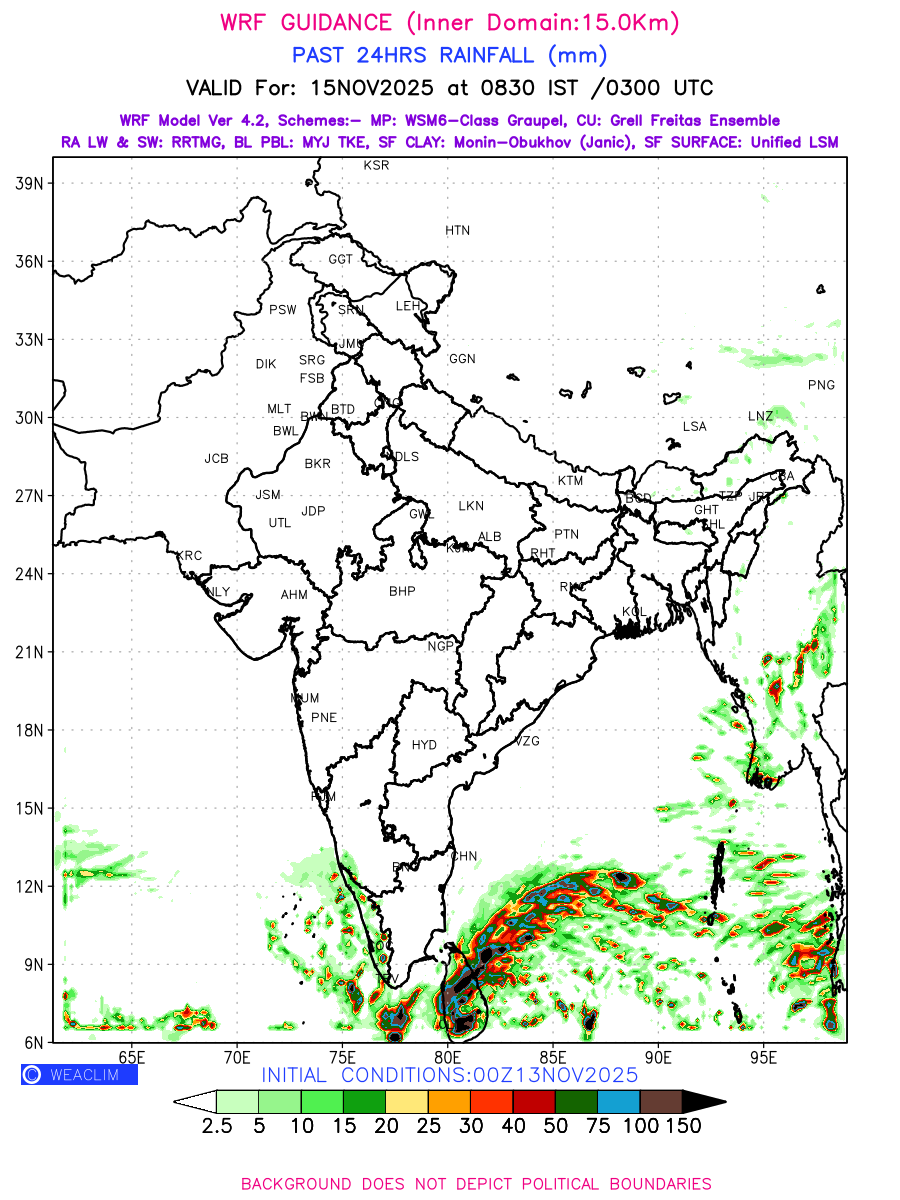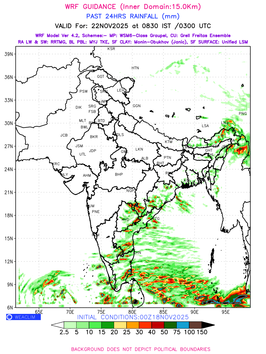 Rainfall forecast for 24 hours generated using WRF Ver 4.2 at a resolution of 15 Km for India is the expected amount of precipitation in millimeters for a given area over a time period of 24 hours and valid from 0300 UTC (0830 IST) of the previous date to 0300 UTC of the required date. This prediction enables the users to plan/review their tasks that are affected by rainfall related severe weather events that may lead to flooding, drought, snowfall and avalanche etc.