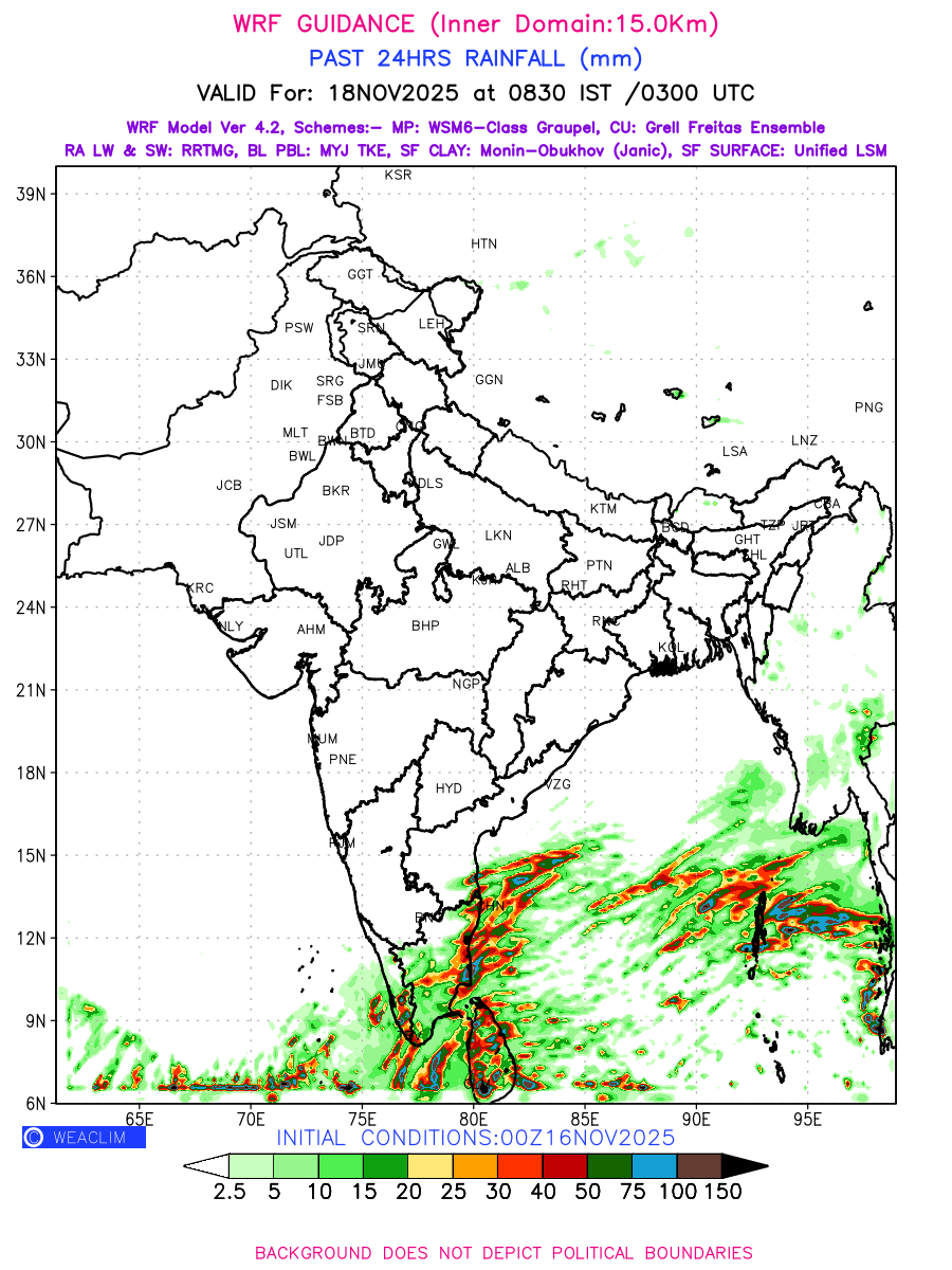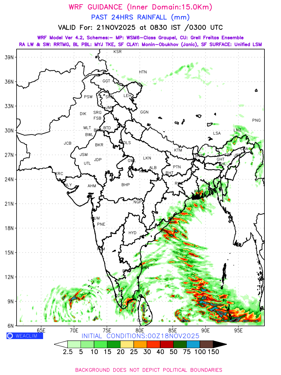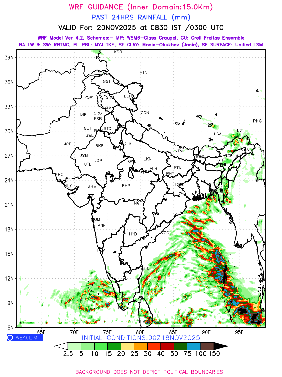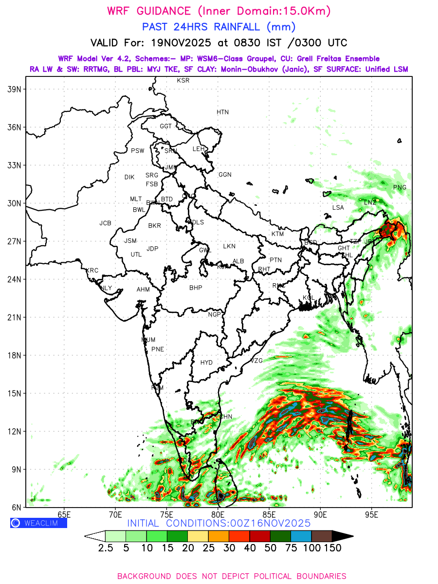 Rainfall forecast for 24 hours generated using WRF Ver 4.2 at a resolution of 15 Km for India is the expected amount of precipitation in millimeters for a given area over a time period of 24 hours and valid from 0300 UTC (0830 IST) of the previous date to 0300 UTC of the required date. This prediction enables the users to plan/review their tasks that are affected by rainfall related severe weather events that may lead to flooding, drought, snowfall and avalanche etc.