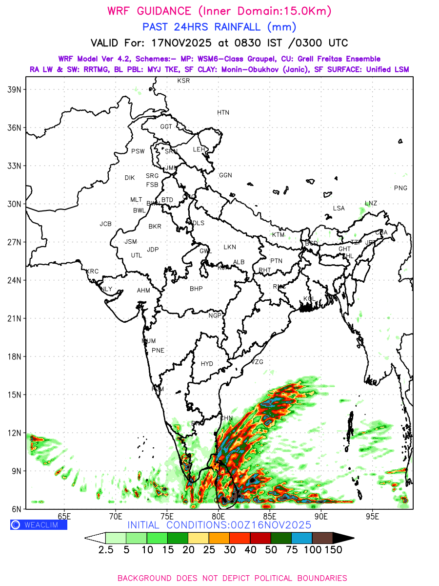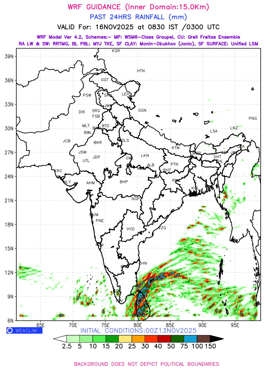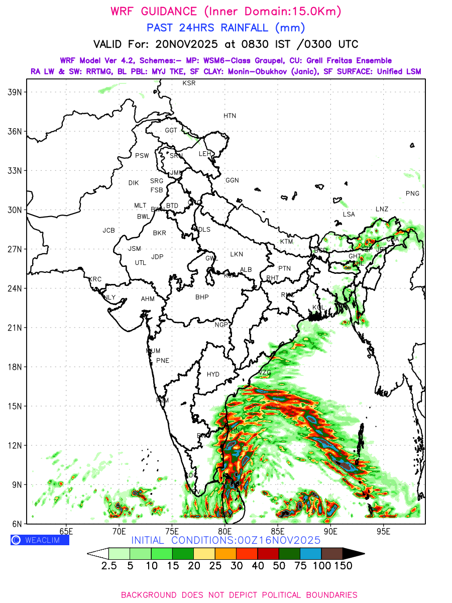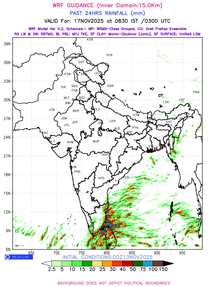 Rainfall forecast for 24 hours generated using WRF Ver 4.2 at a resolution of 15 Km for India is the expected amount of precipitation in millimeters for a given area over a time period of 24 hours and valid from 0300 UTC (0830 IST) of the previous date to 0300 UTC of the required date. This prediction enables the users to plan/review their tasks that are affected by rainfall related severe weather events that may lead to flooding, drought, snowfall and avalanche etc.