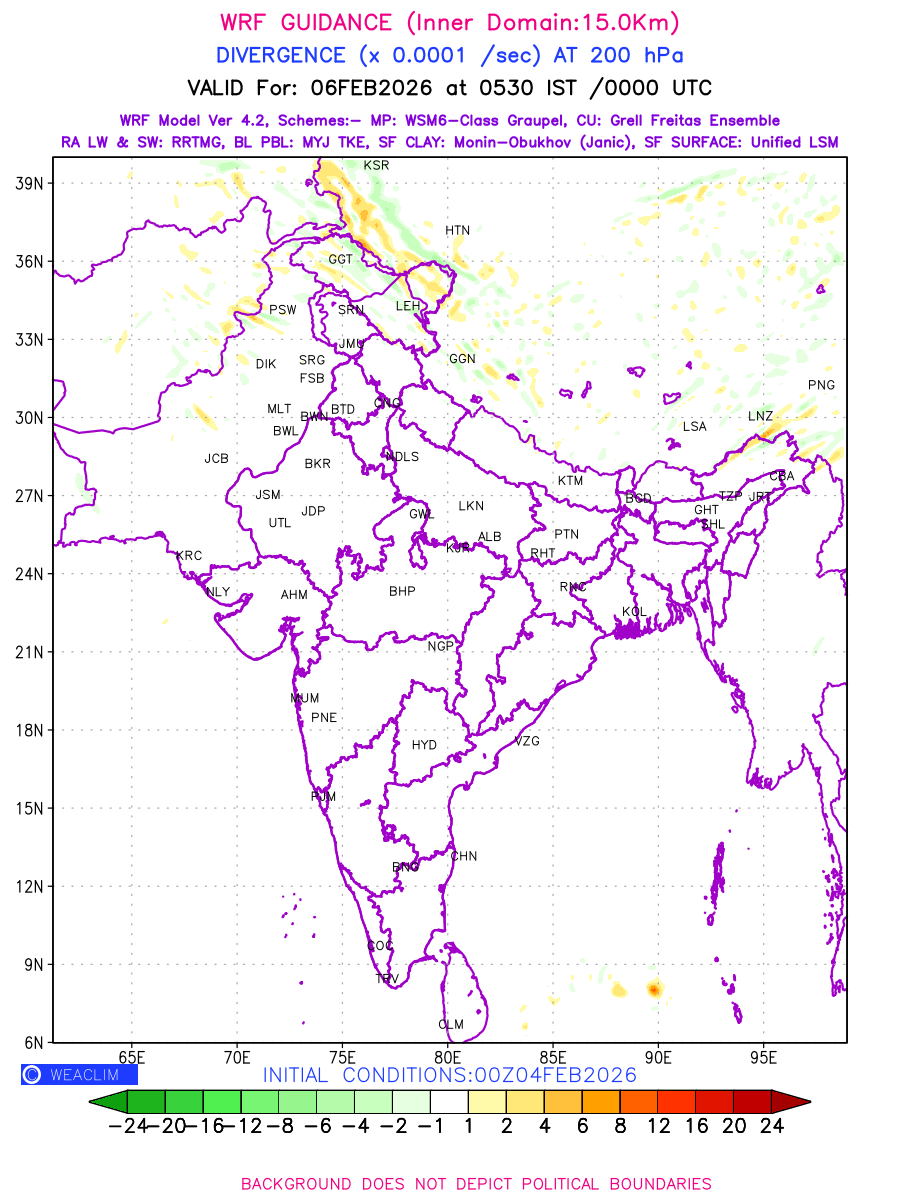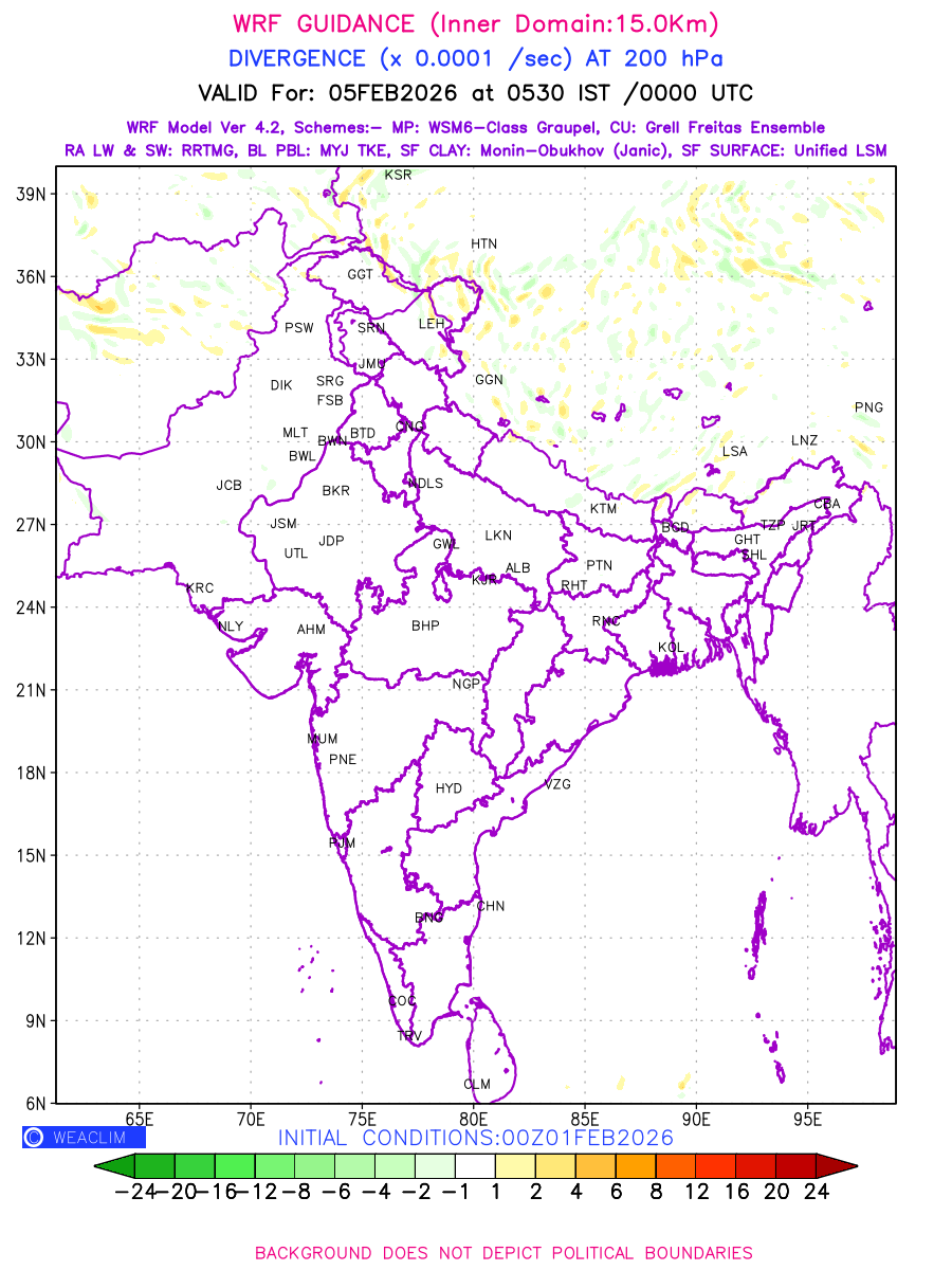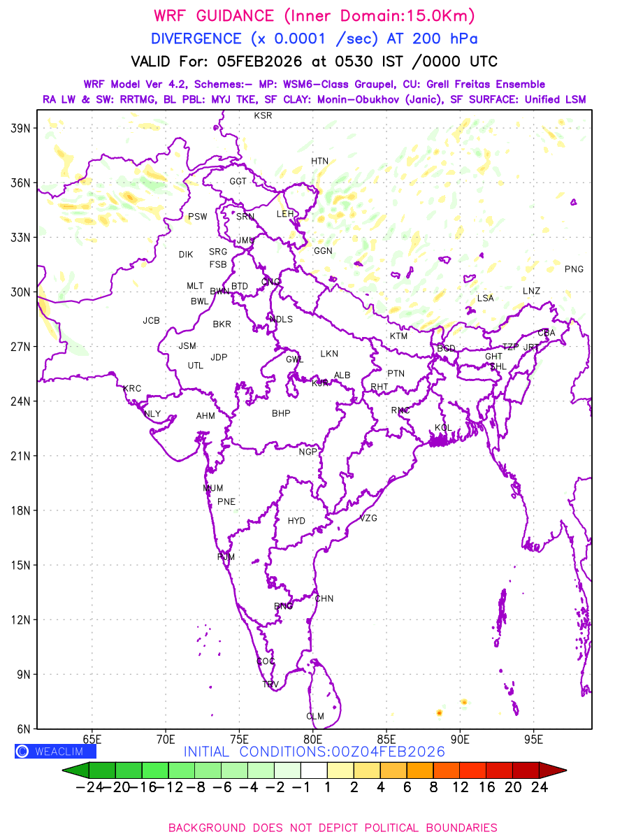 Upper Level Divergence at the 24 th hour generated using WRF Ver 4.2 at a resolution of 15 Km for India is the graphical representation that depict the magnitude and pattern of horizontal rotation (or the vorticity) of atmosphere around a vertical axis or the vorticity at 200 hPa (12.0km). It is displayed in warm colors such as red and yellow indicating positive vorticity (cyclonic rotation), and cool colors such as blue and green indicating negative vorticity (anticyclonic rotation). It can be associated with weather systems such as troughs, ridges, and jet streams.