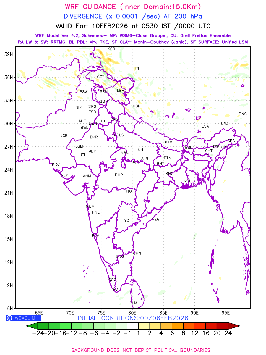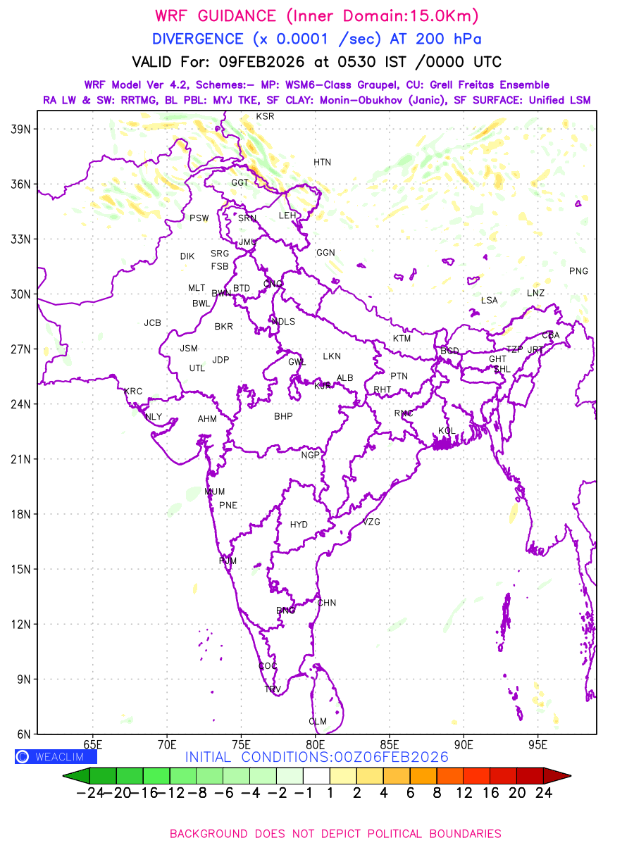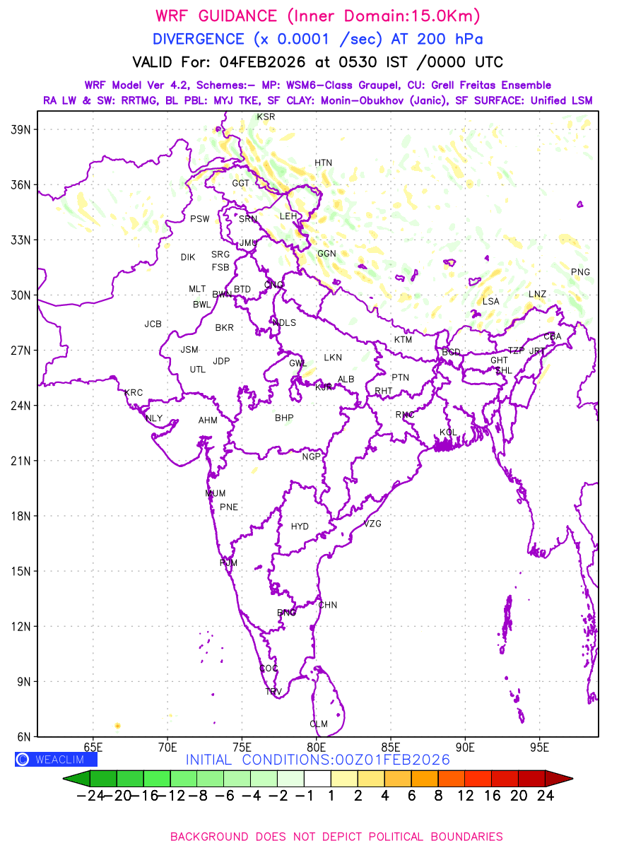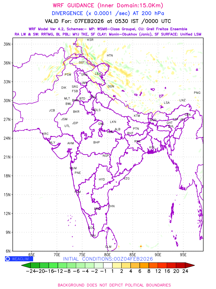 Upper Level Divergence at the 24 th hour generated using WRF Ver 4.2 at a resolution of 15 Km for India is the graphical representation that depict the magnitude and pattern of horizontal rotation (or the vorticity) of atmosphere around a vertical axis or the vorticity at 200 hPa (12.0km). It is displayed in warm colors such as red and yellow indicating positive vorticity (cyclonic rotation), and cool colors such as blue and green indicating negative vorticity (anticyclonic rotation). It can be associated with weather systems such as troughs, ridges, and jet streams.